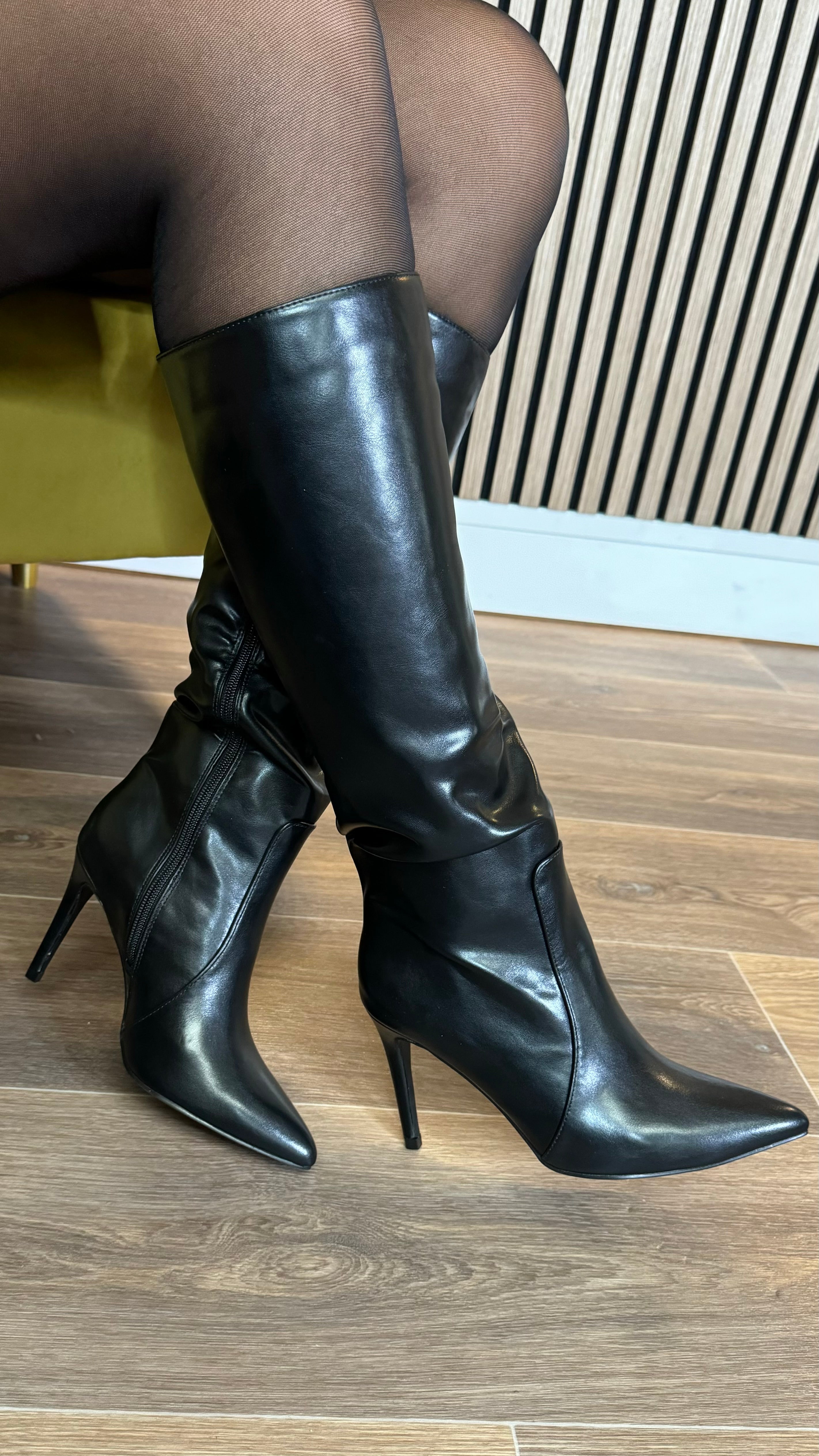Step into sophistication with the Samara Black Leather Look Stiletto Knee High Boots! 👢✨ These sleek knee-highs feature a stunning faux leather finish that screams luxury without the guilt. The razor-sharp stiletto heel adds instant glamour to any outfit, whether you're hitting the town or turning heads at the office. 💃 Crafted for comfort and style, these boots are your go-to for making a bold statement. Pair them with everything from mini skirts to tailored trousers and watch the magic happen! 🖤 Because life's too short for boring footwear.