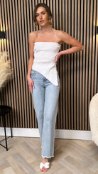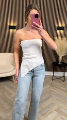 Get ready to turn heads with the Zoey White Bandeau Top! This playful top features a longer, asymmetrical design that adds a unique touch to any outfit. Perfect for a day at the beach or a night out, this bandeau top is a must-have for any fashion-forward individual. 😍🌴