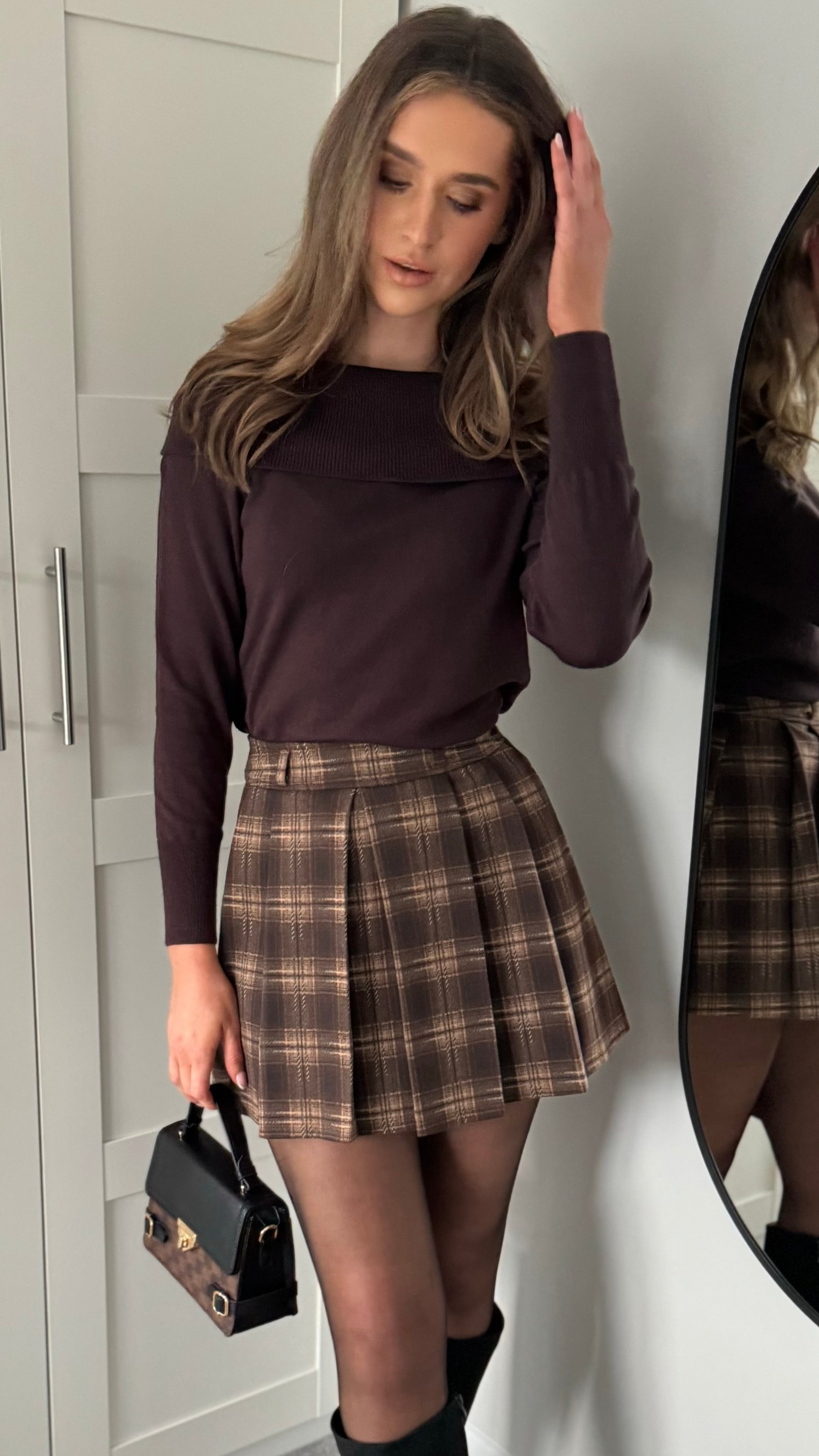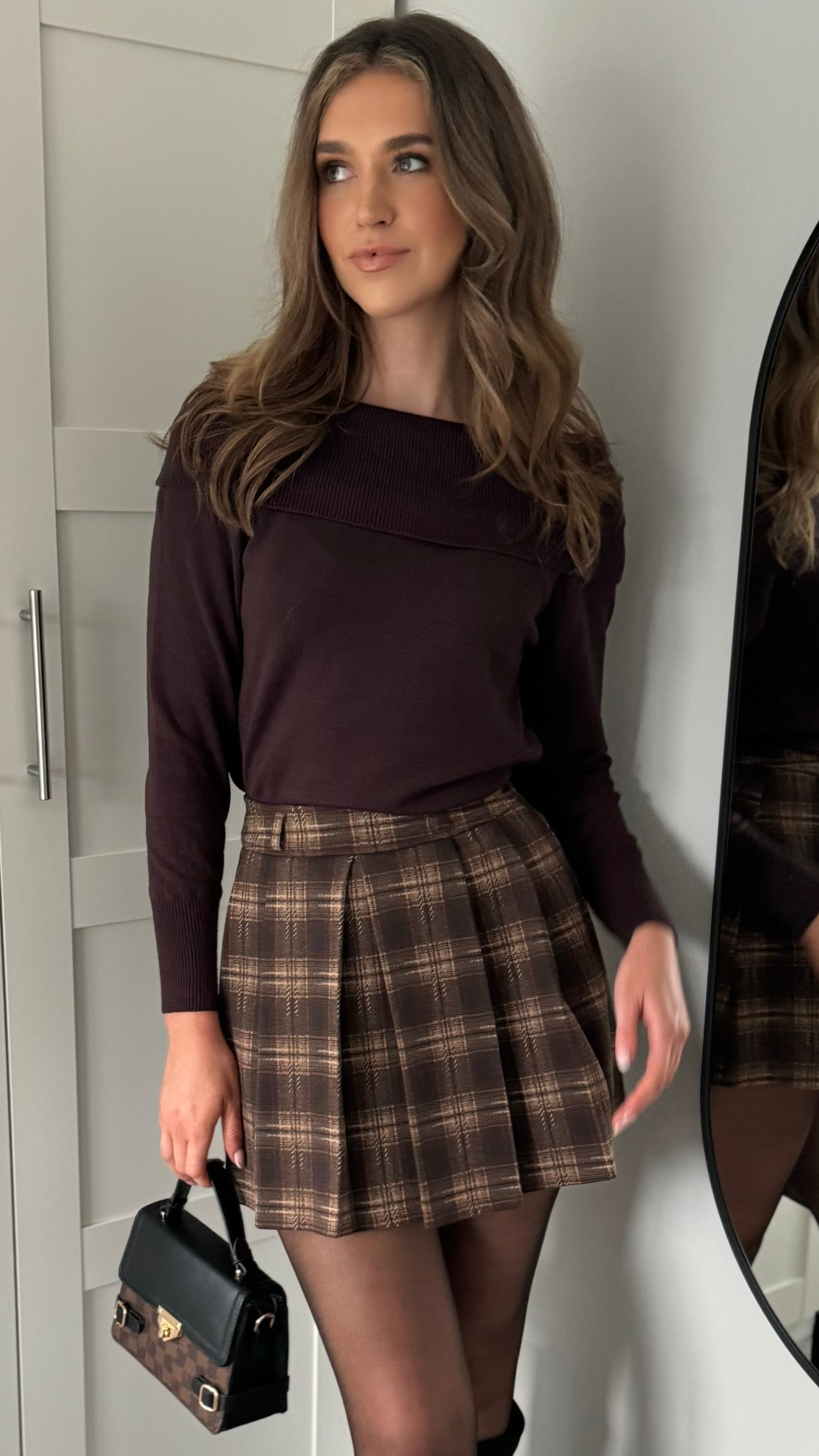This mini skirt and ruched top combo is a match made in fashion heaven. The brown and beige checked skirt features pleated details for added charm, while the dark red top adds a touch of sequin sparkle. Complete with a belted waist, this outfit will have you looking stylish and ready for any occasion.