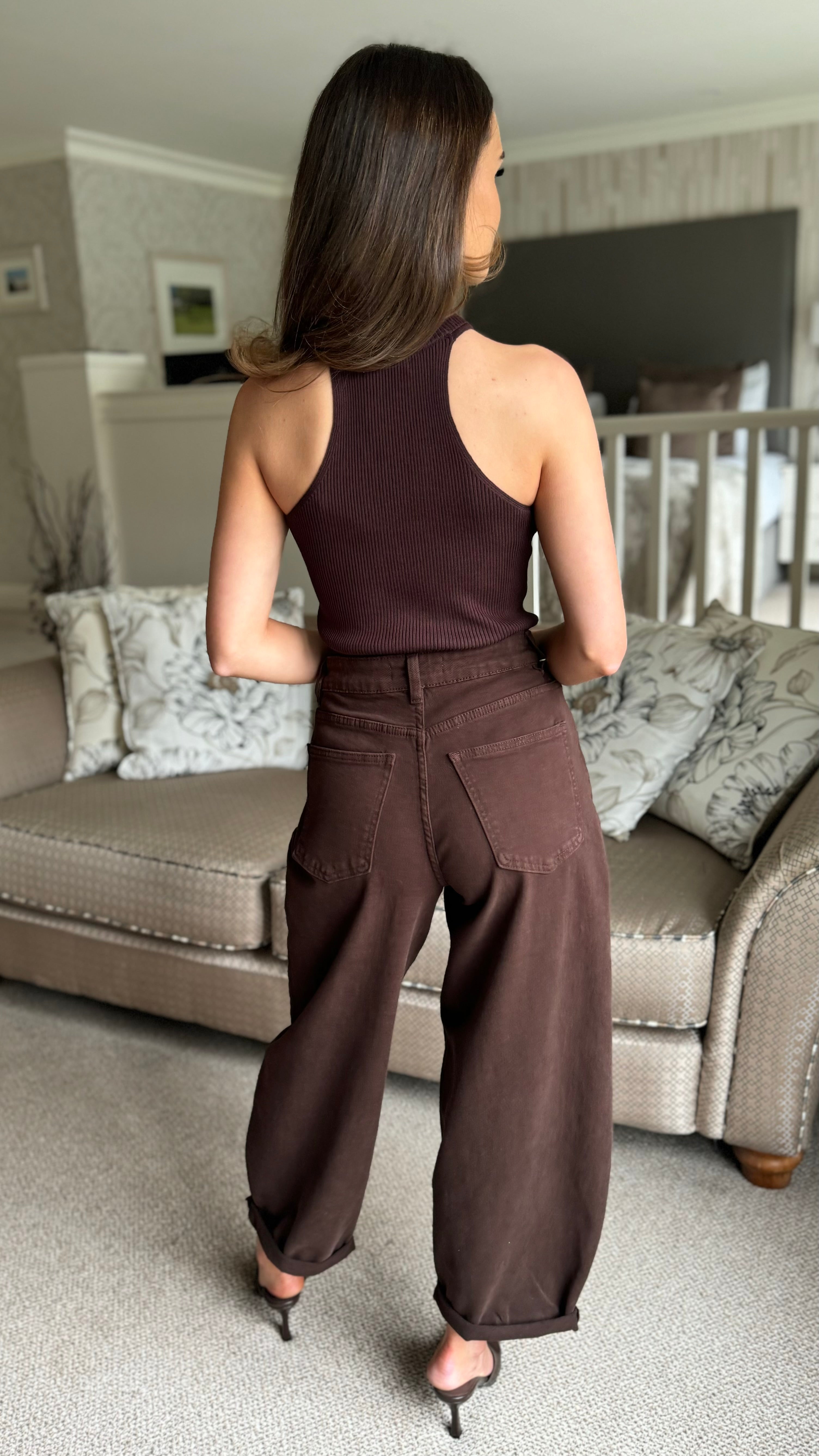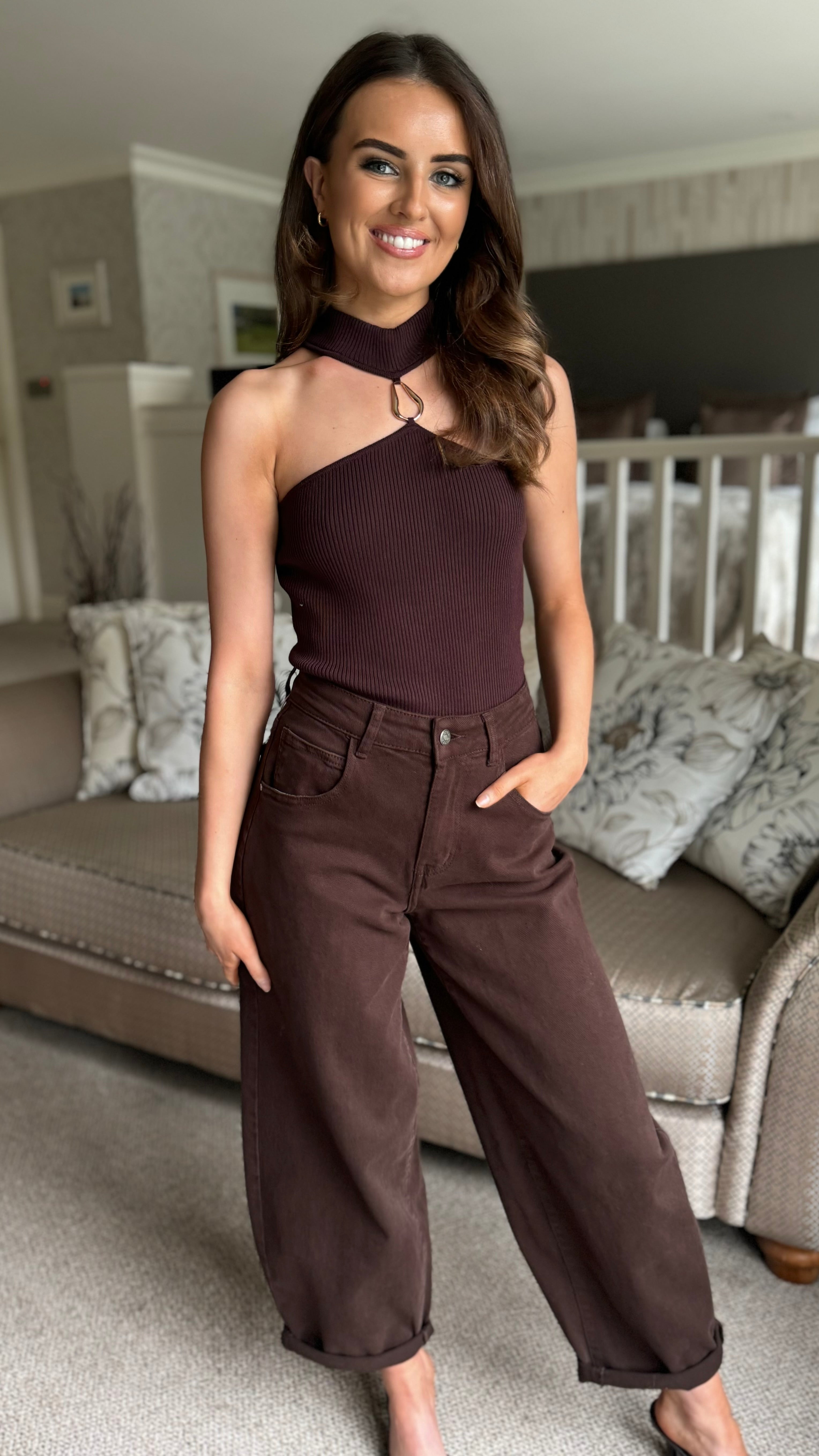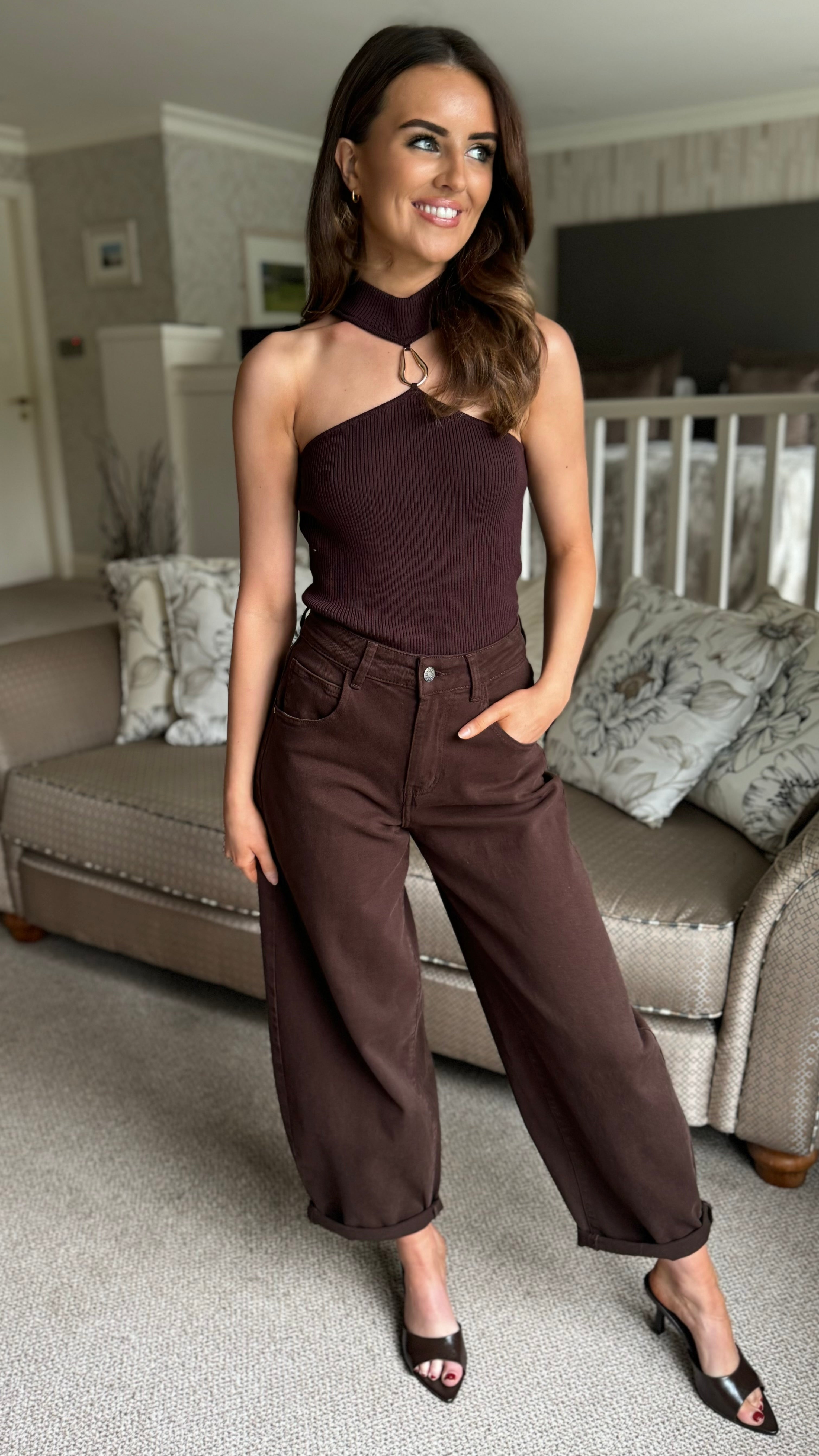 Ariana Brown & Gold Detail Ribbed Choker Neck Top