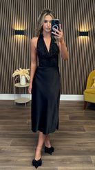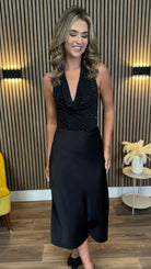 Turn heads with the Beau Black Mesh Diamante Detail Bodysuit, featuring a flirty halterneck and a sultry cowl neckline. The all-over mesh fabric adds a teasing touch, while sparkling diamante accents bring extra sparkle. Secure the look with the easy clasp fastening and get ready to shine wherever you go!