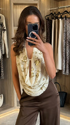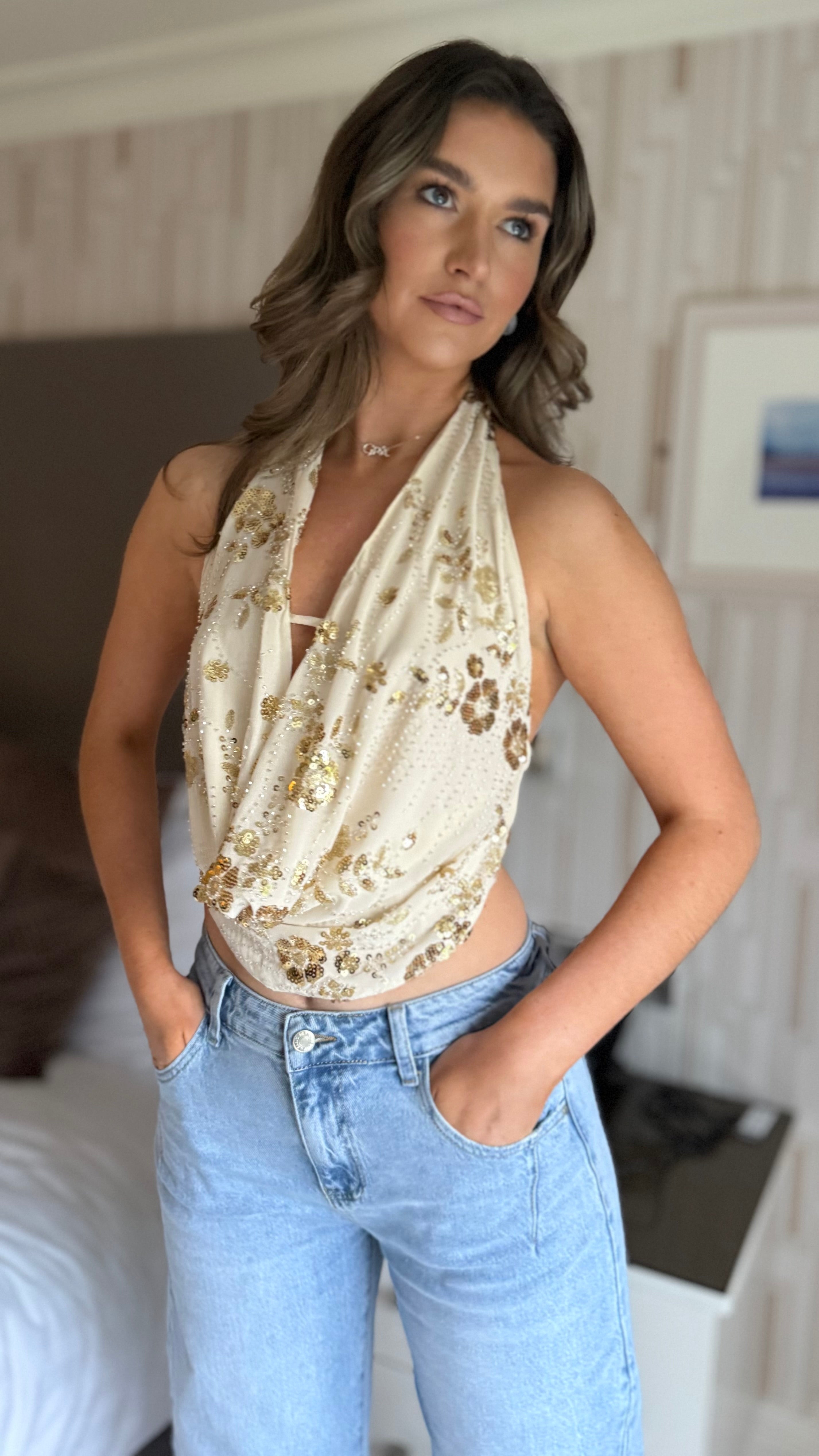 Effortless elegance meets fun with the Vada Beige Embellished Halter Neck Top. This playful piece features a flattering halter neckline and graceful cowl drape that moves with you, while delicate floral embellishments add a touch of whimsy. The elasticated back band ensures a comfortable, secure fit all day long. Perfect for dressing up or down, this top brings contemporary style with a carefree spirit.