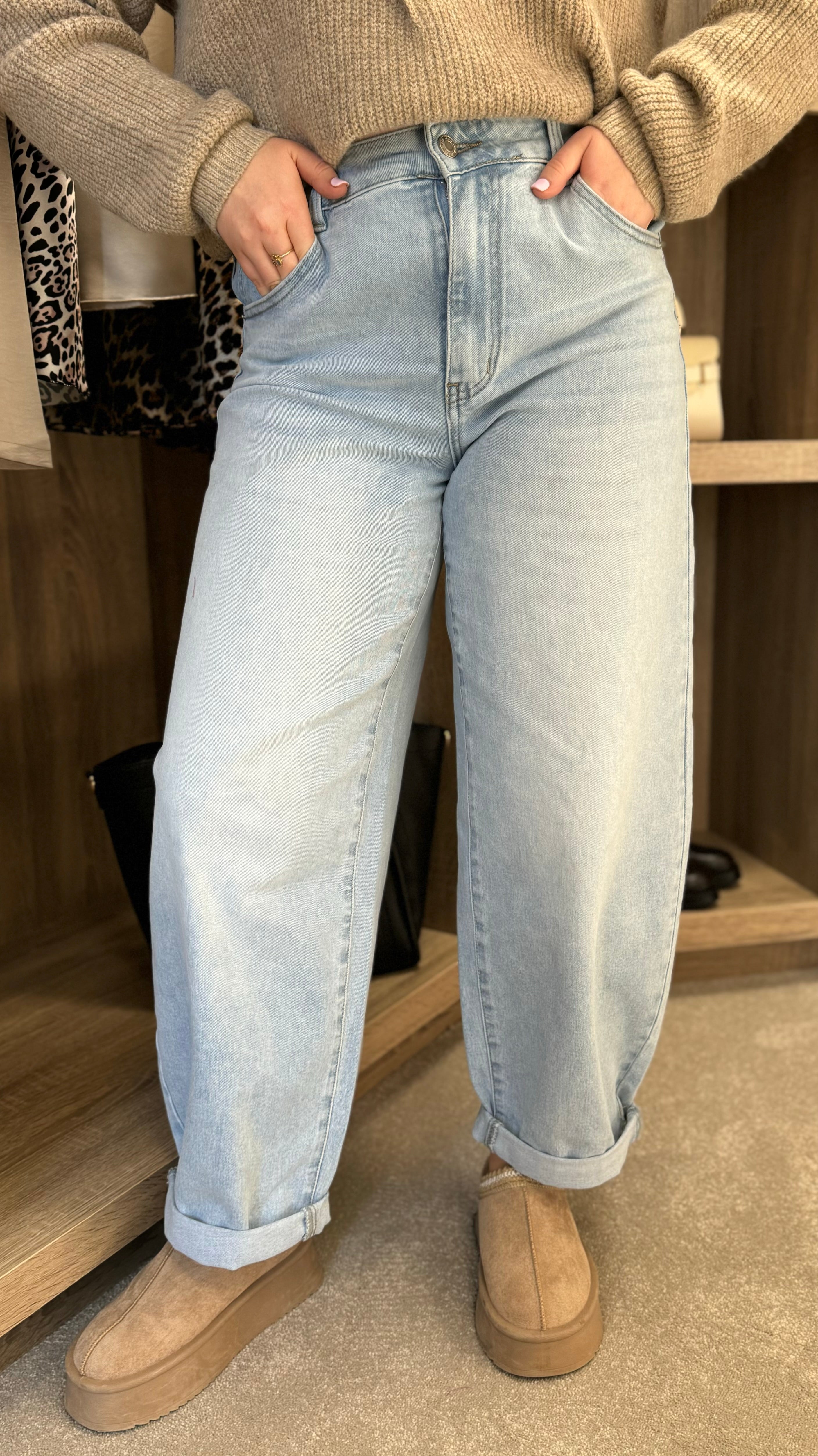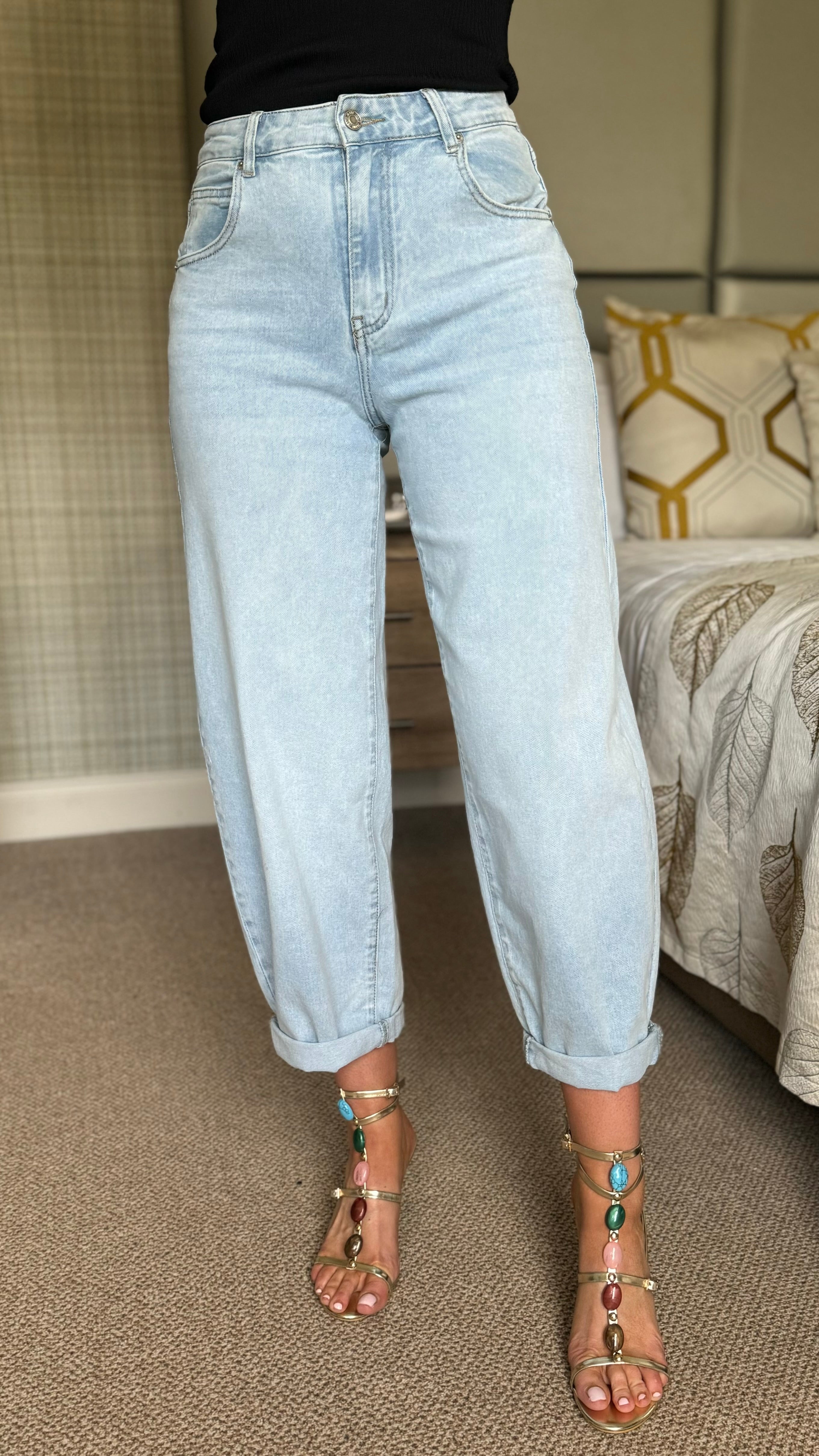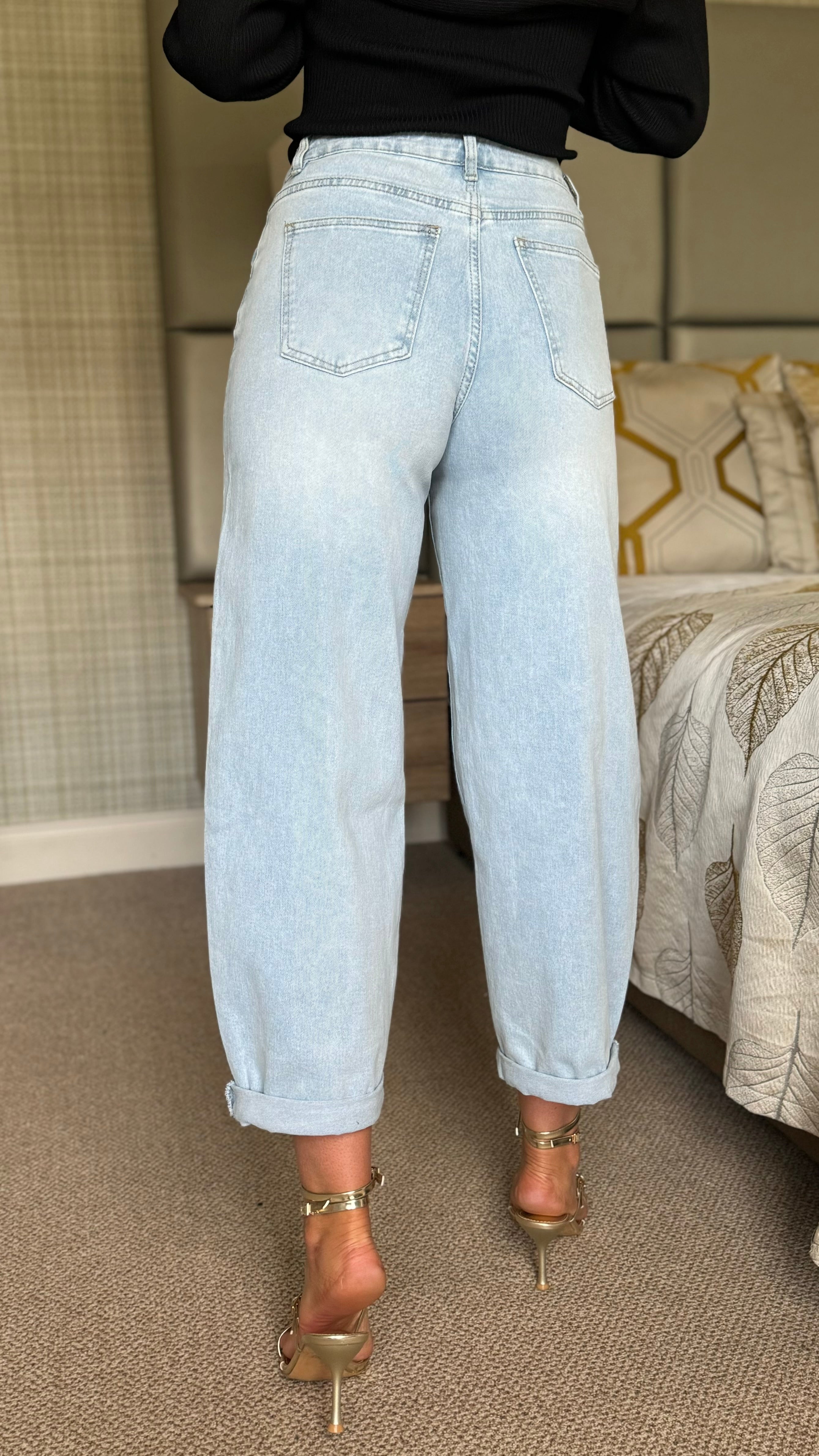 Introducing the Cliona Light Blue Mid-Rise Barrel Jeans – your new go-to for effortless cool. These jeans feature a flattering mid-rise waist paired with a trendy barrel silhouette that's equal parts comfy and chic. The cuffed hems add a playful finishing touch, while practical front and back pockets keep your essentials close. Zip and fly fastening ensures a secure fit every time. Perfect for dressing up or down, these versatile jeans are about to become your wardrobe favourite.