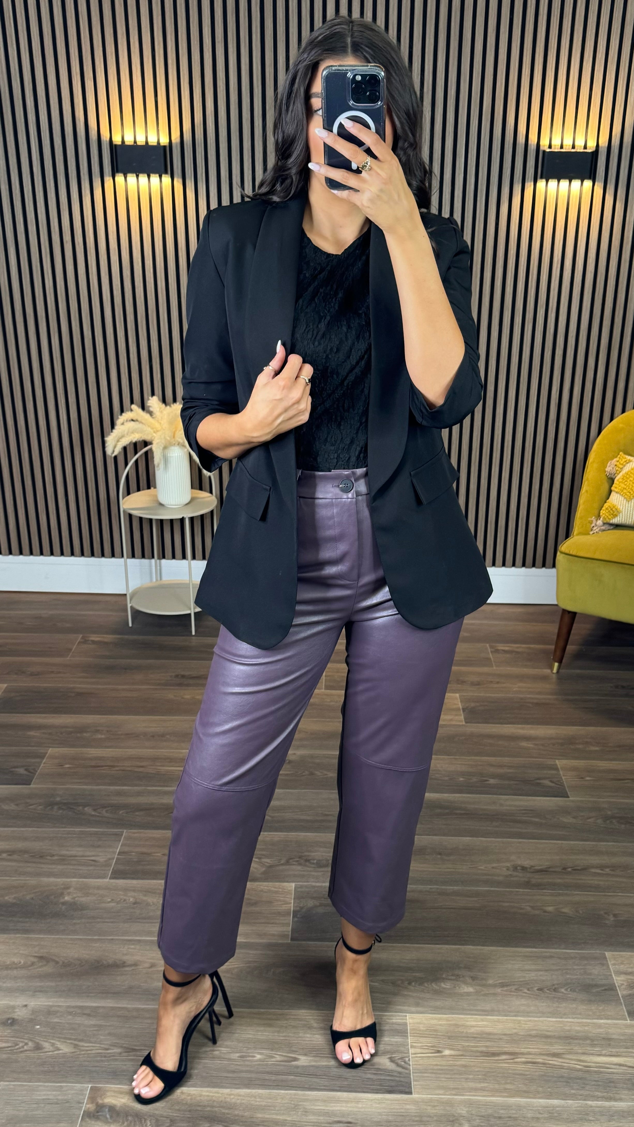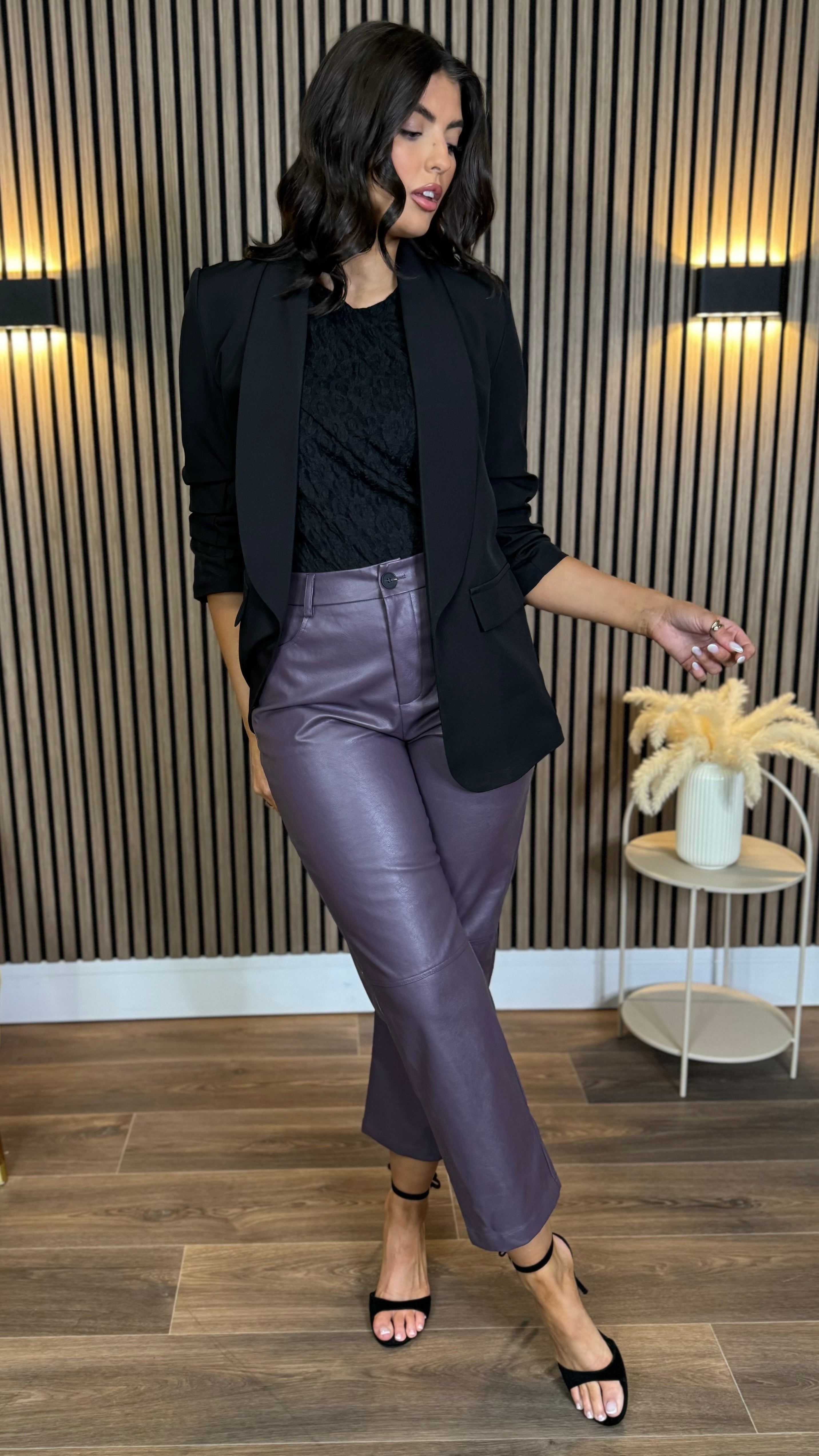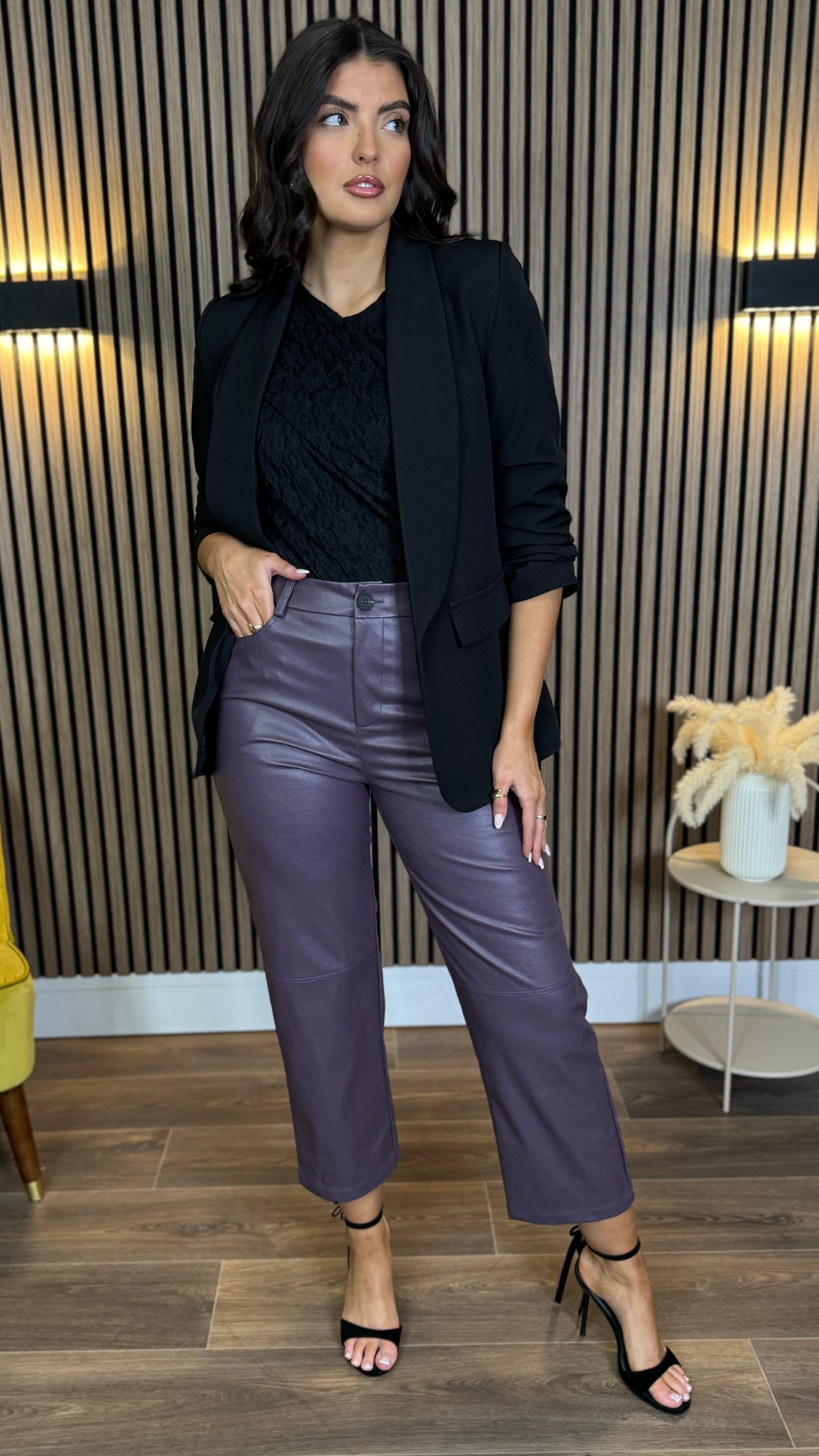 Step into style and comfort with the Oaklee Plum Faux Leather Trousers. Designed with a high-waisted fit and elasticated waistband, these trousers hug your waist just right while offering flexible wear. Belt loops add flair and function, perfect for accessorizing. Featuring a button and fly fastening alongside handy pockets, they combine practicality with chic vibes. The ankle-length cut shows off your favorite shoes, making these trousers a fun and versatile addition to any wardrobe.