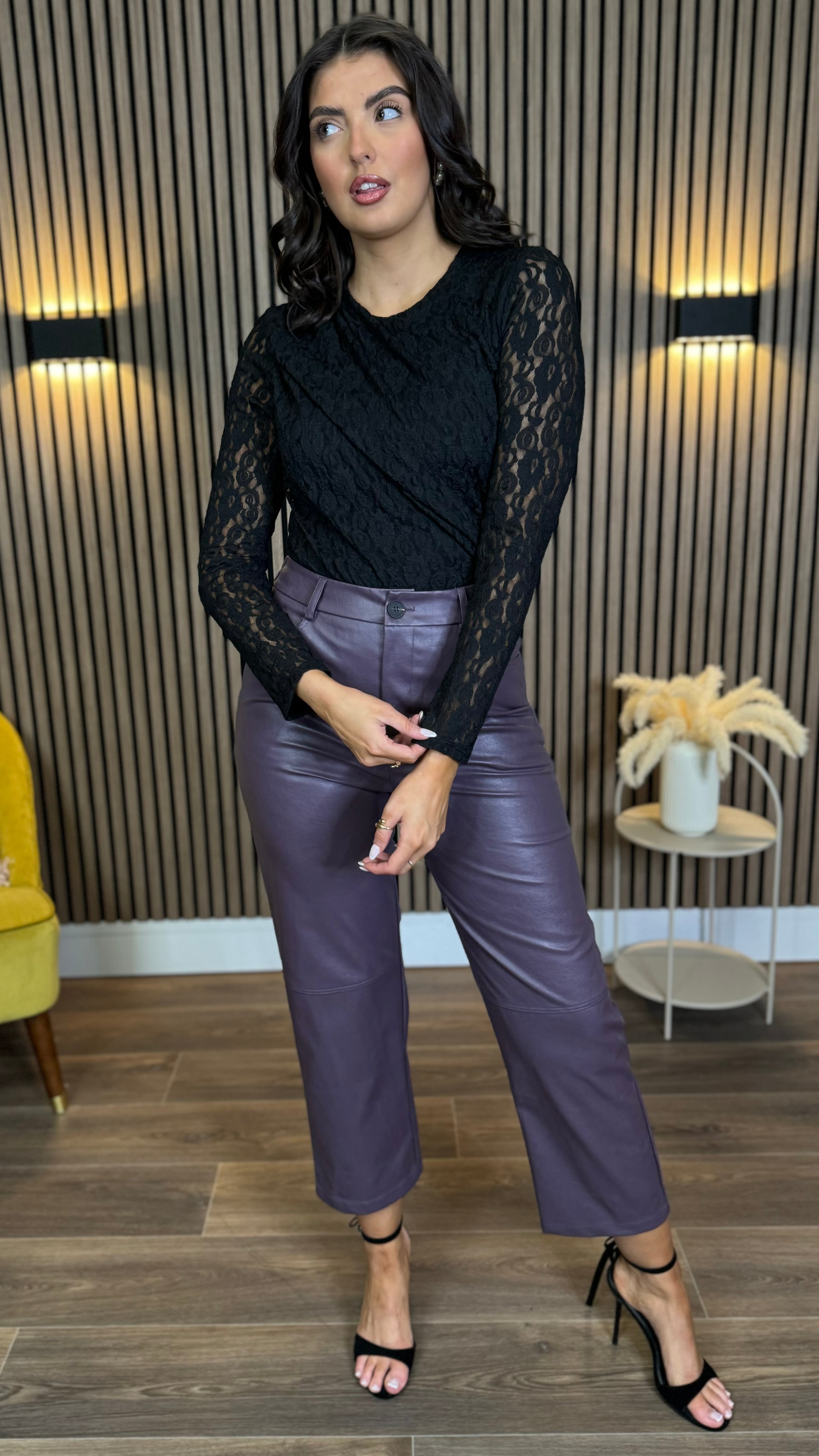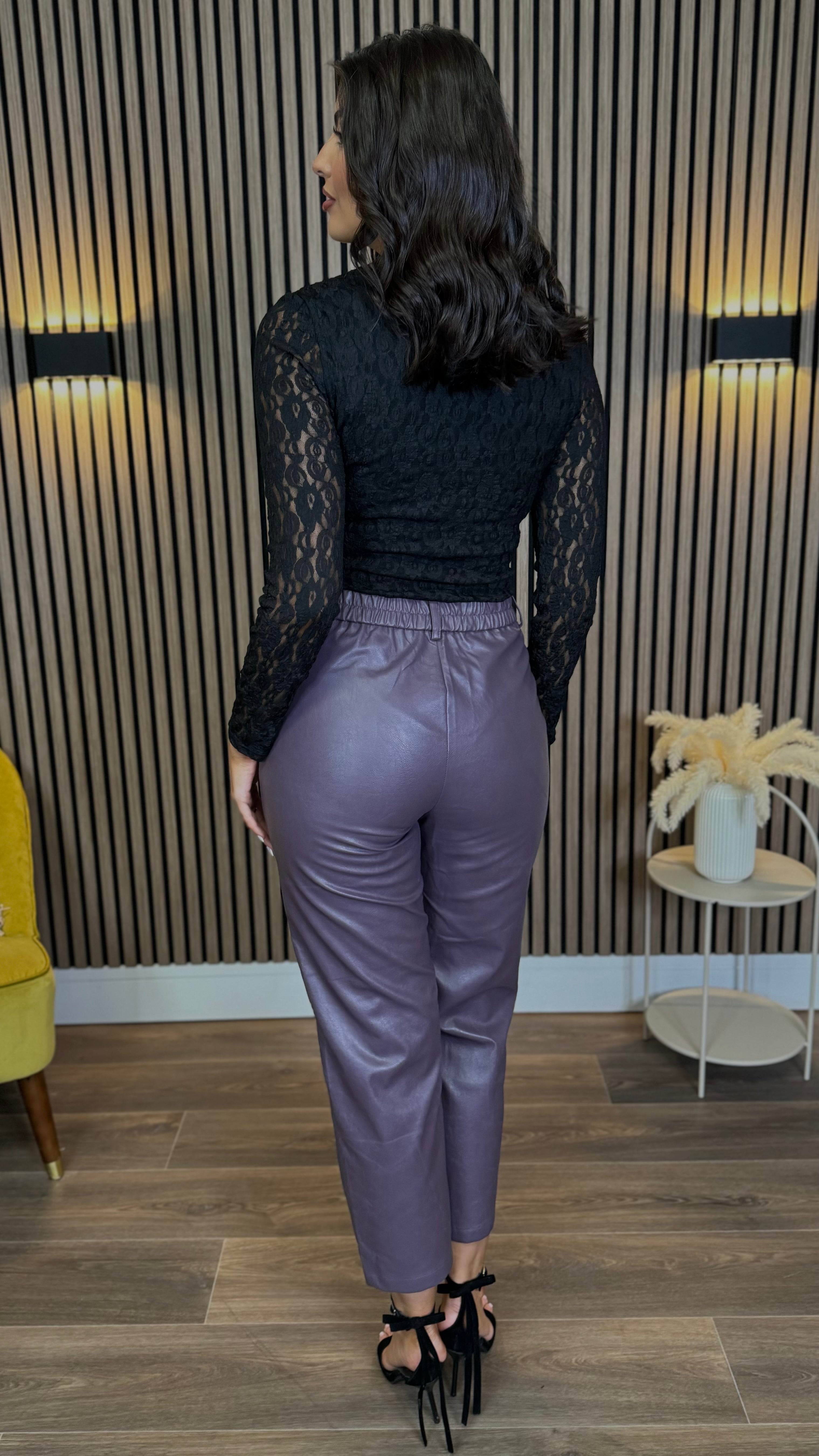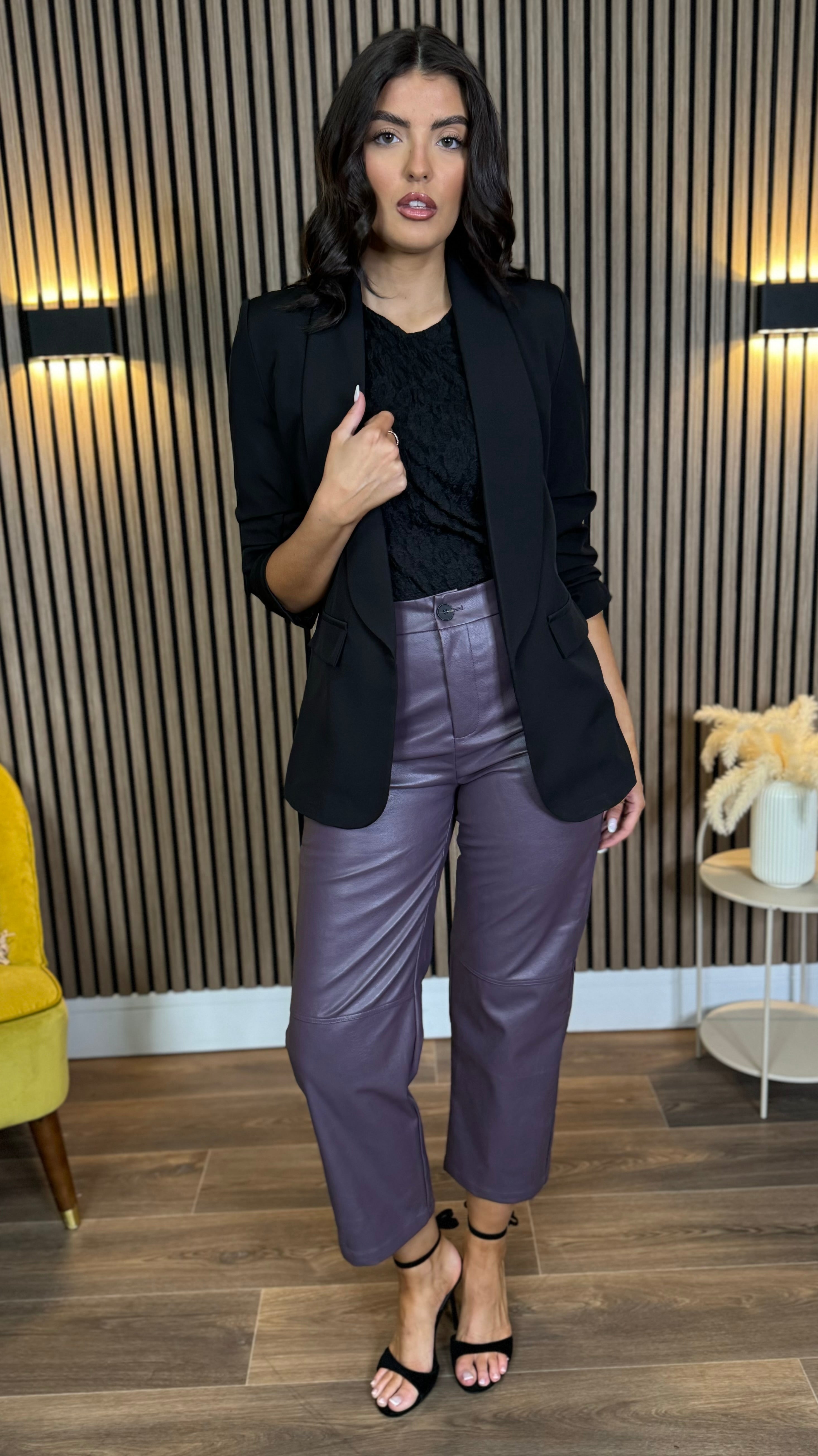 Step into style and comfort with the Oaklee Plum Faux Leather Trousers. Designed with a high-waisted fit and elasticated waistband, these trousers hug your waist just right while offering flexible wear. Belt loops add flair and function, perfect for accessorizing. Featuring a button and fly fastening alongside handy pockets, they combine practicality with chic vibes. The ankle-length cut shows off your favorite shoes, making these trousers a fun and versatile addition to any wardrobe.