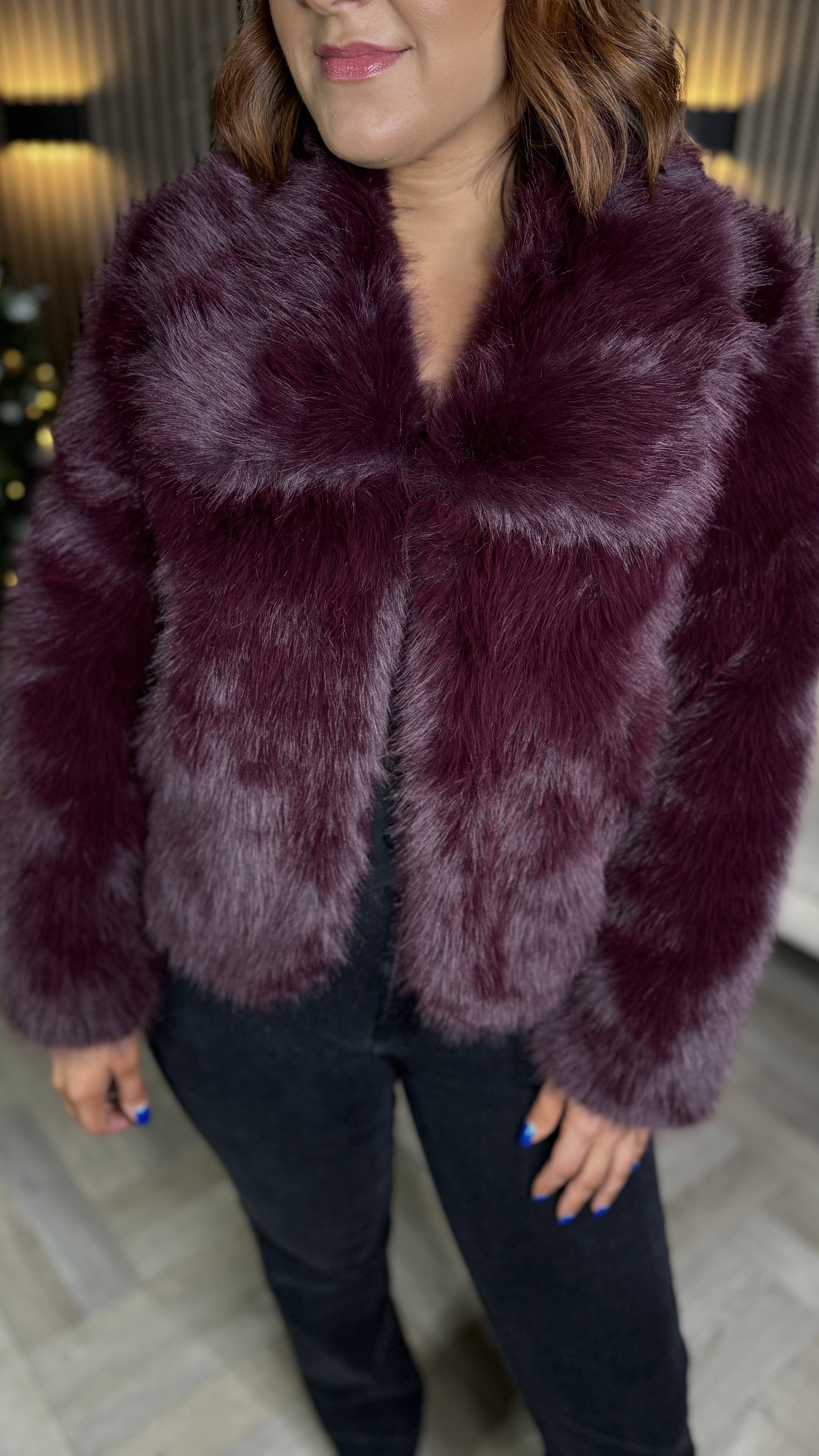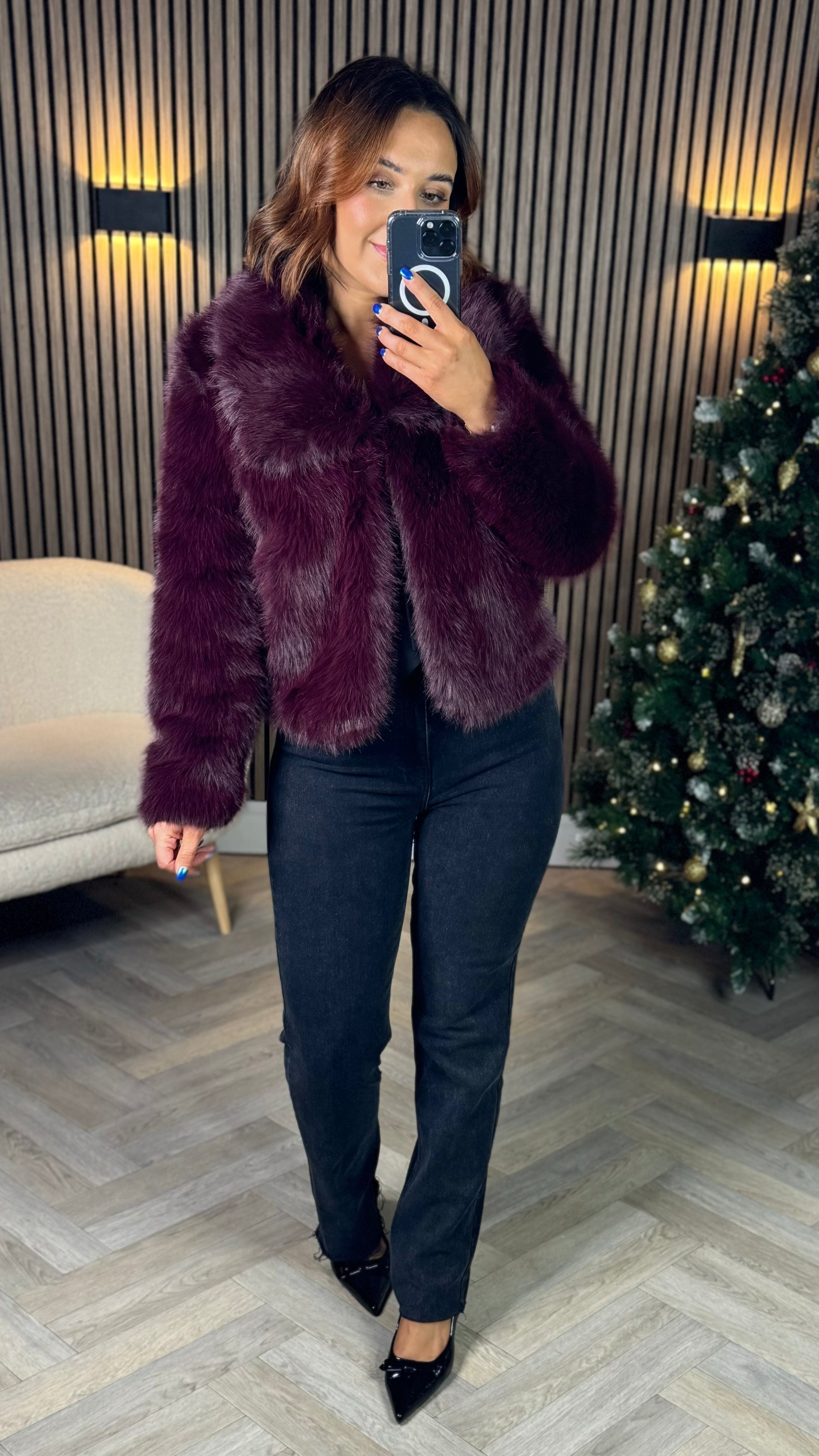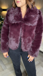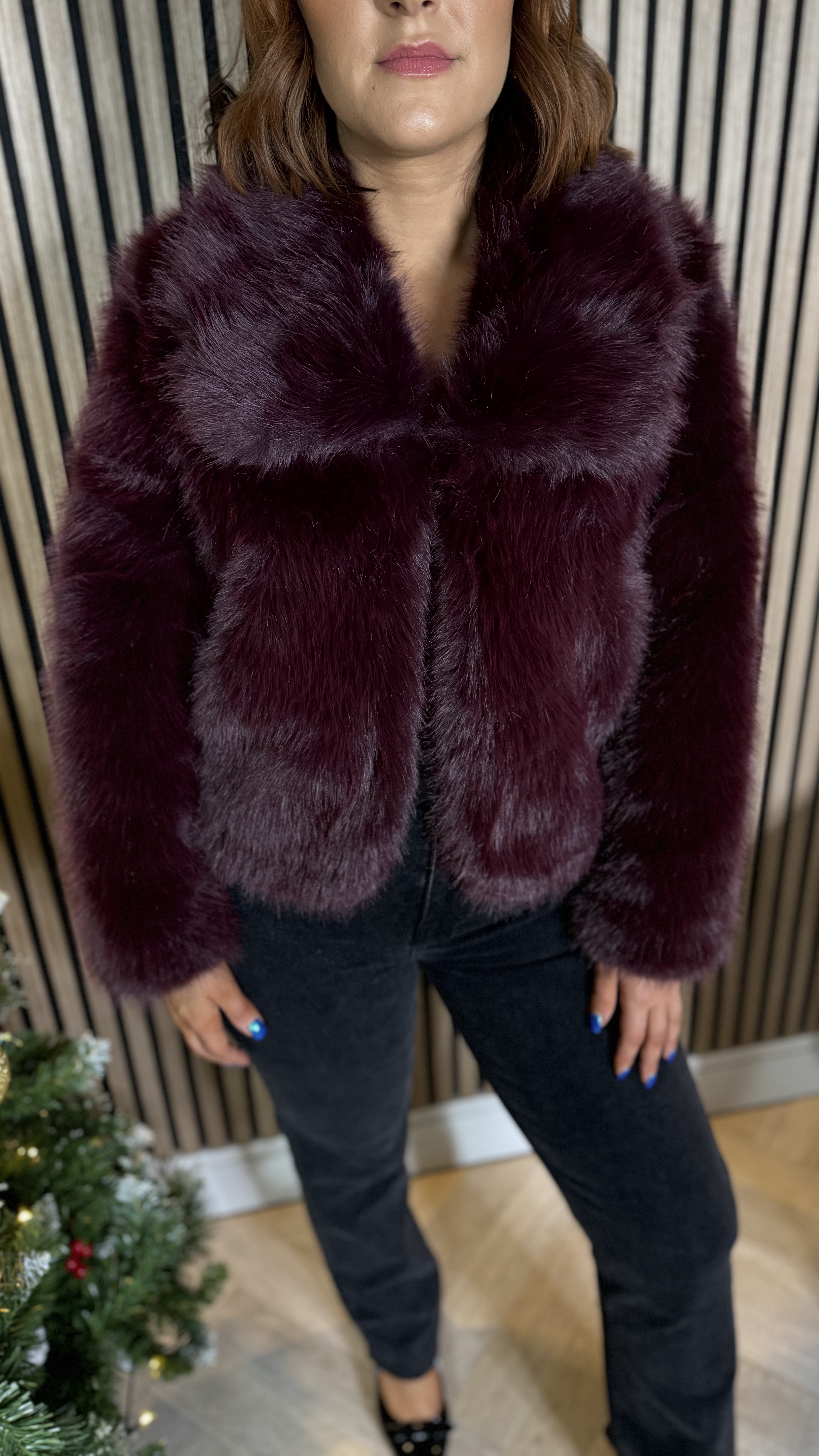 Introducing the Georgia Burgundy Collared Fur Detail Jacket. Stay cozy and stylish with its warm fur detailing and unique burgundy color. Perfect for a chilly night out or a fun day exploring the city. Make a statement and turn heads with this one-of-a-kind jacket.