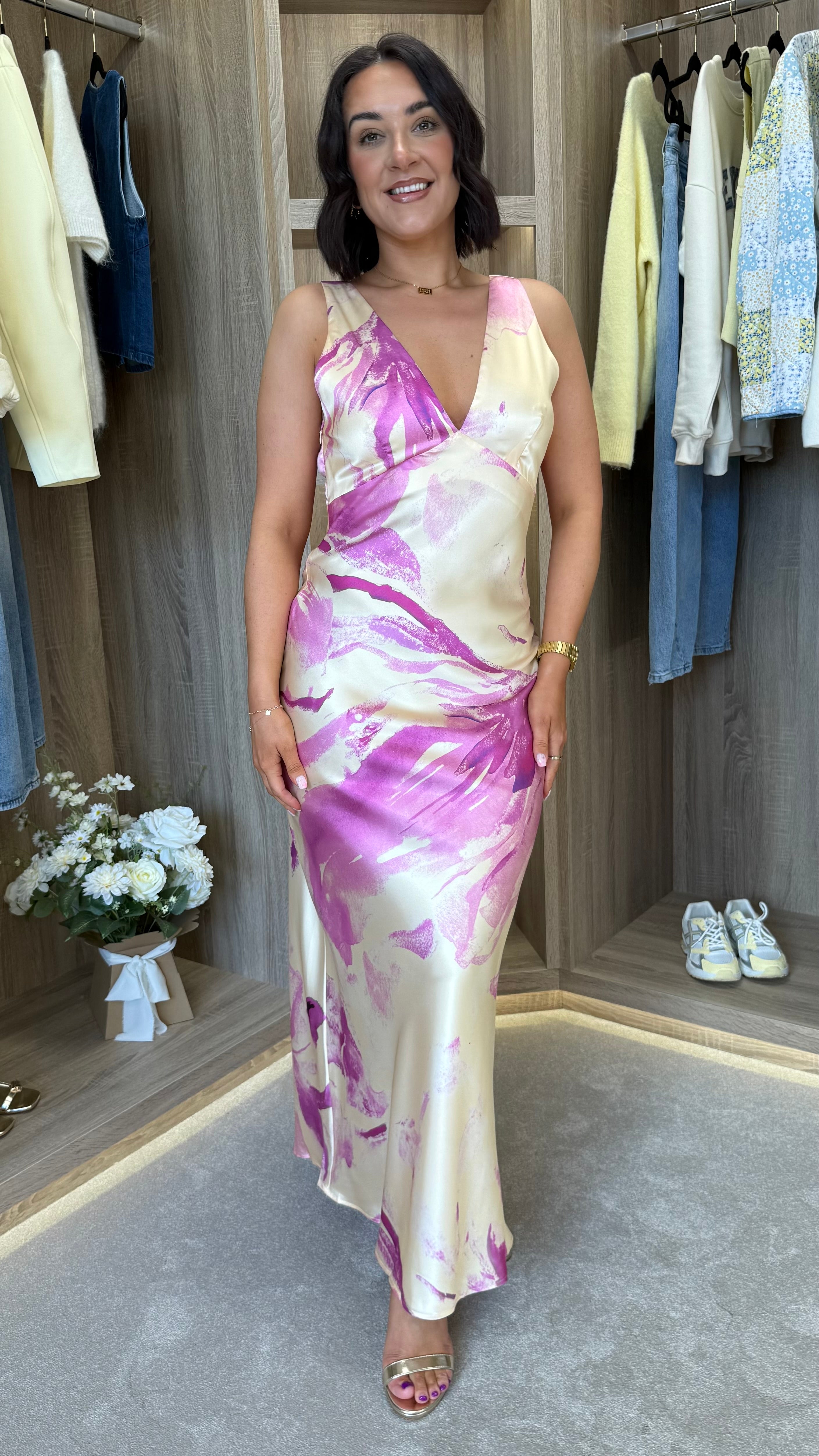 Elevate your wardrobe with this striking midaxi dress, featuring a flattering v neckline and luxurious silky fabric that drapes beautifully. The criss-cross back detail with subtle opening adds contemporary flair, while the concealed side zip ensures a seamless, polished finish. Perfect for occasions where you want to blend sophistication with modern style.