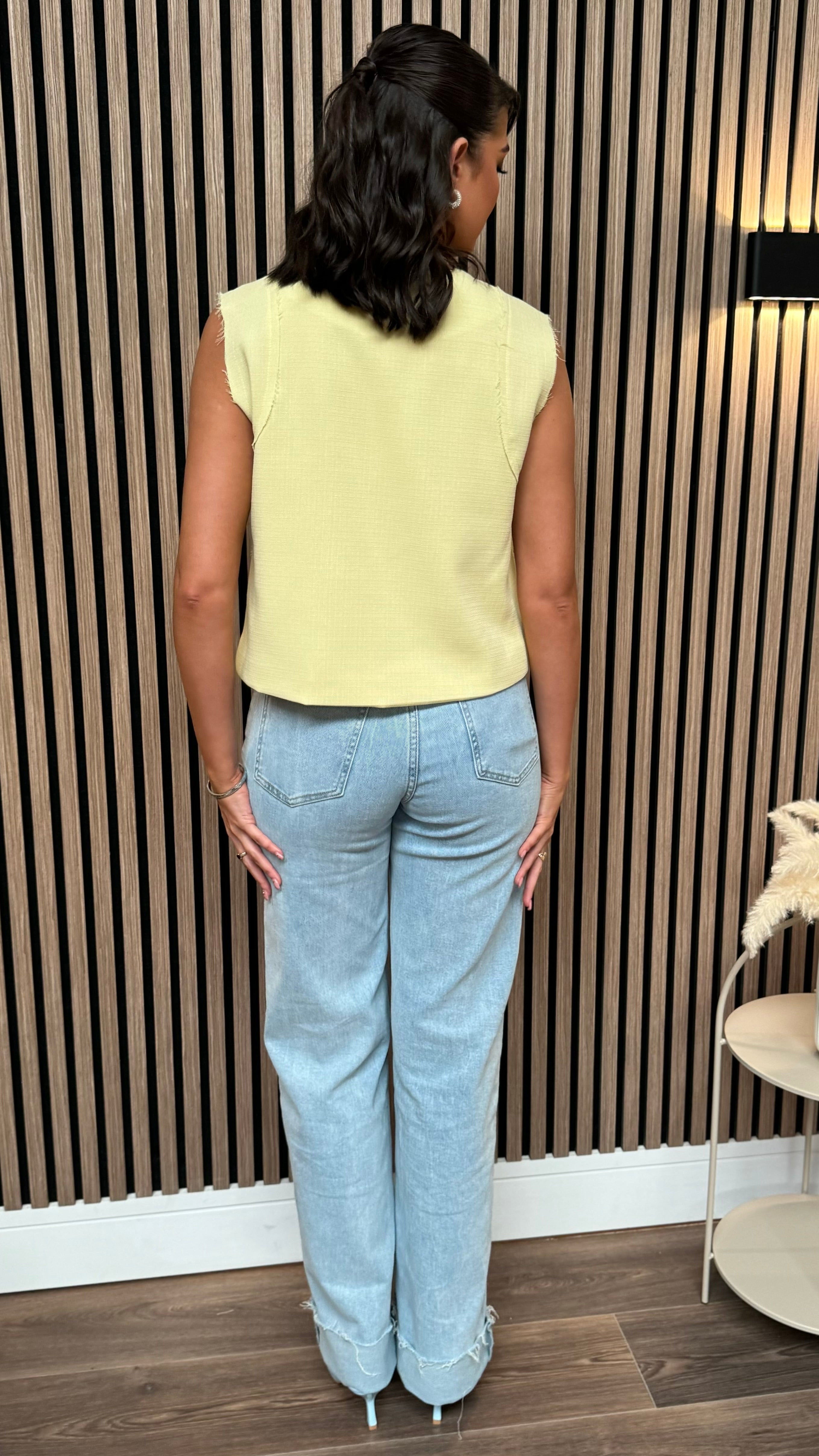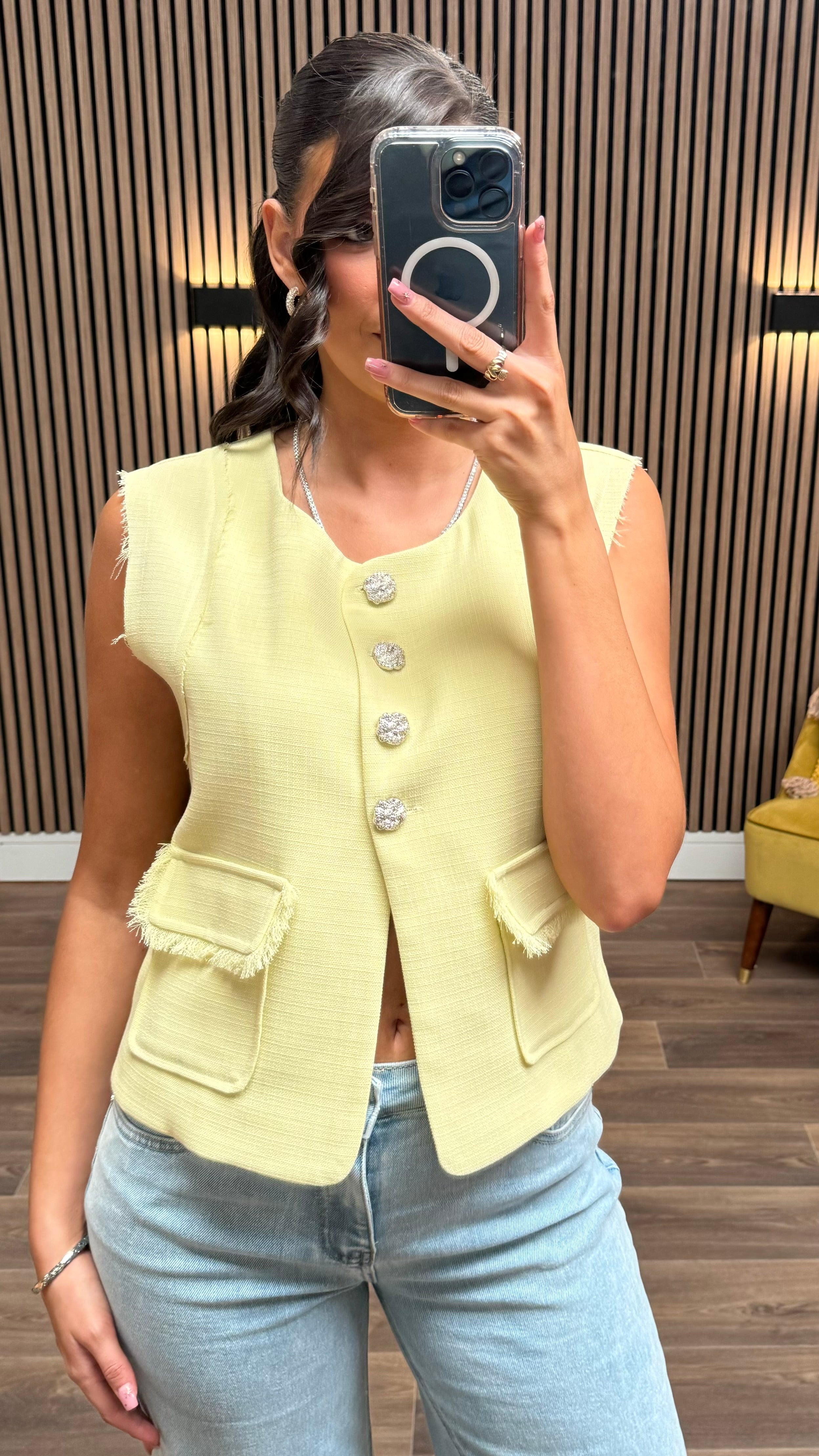 Stay trendy and elegant with the Rosabel Yellow Button Down Waistcoat 🎩 This sleeveless vest features round metal buttons and pockets with cut-out details for a unique touch. Perfect for layering and making a statement!