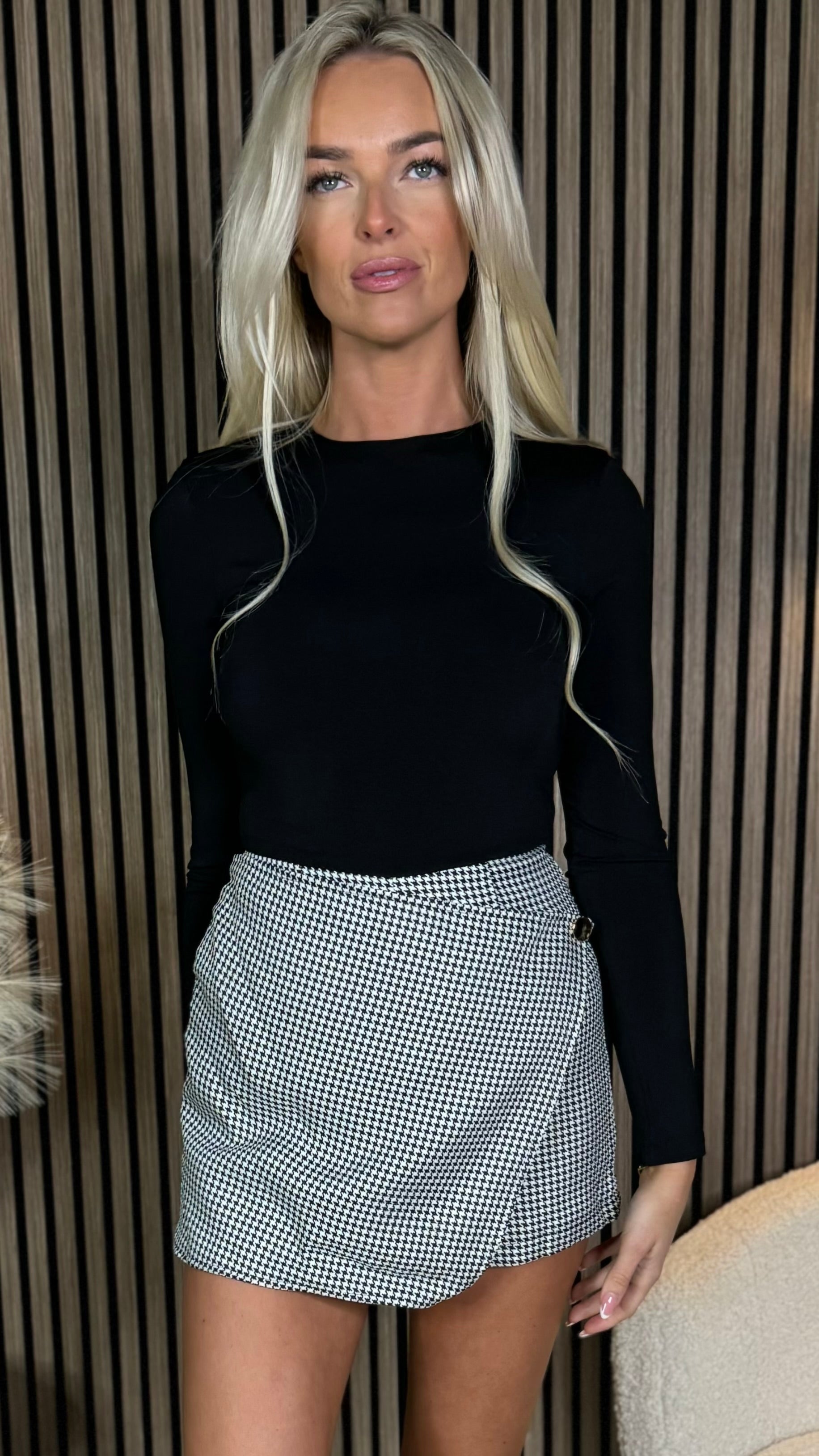This Samira Black And White Houndstooth Playsuit is a must-have for staying on trend. With a versatile 2 in 1 design, it features a fitted long sleeve top with shoulder pads and houndstooth shorts with wrap over front detail. Dress it up for a night out or keep it casual with sneakers. 🔥💃