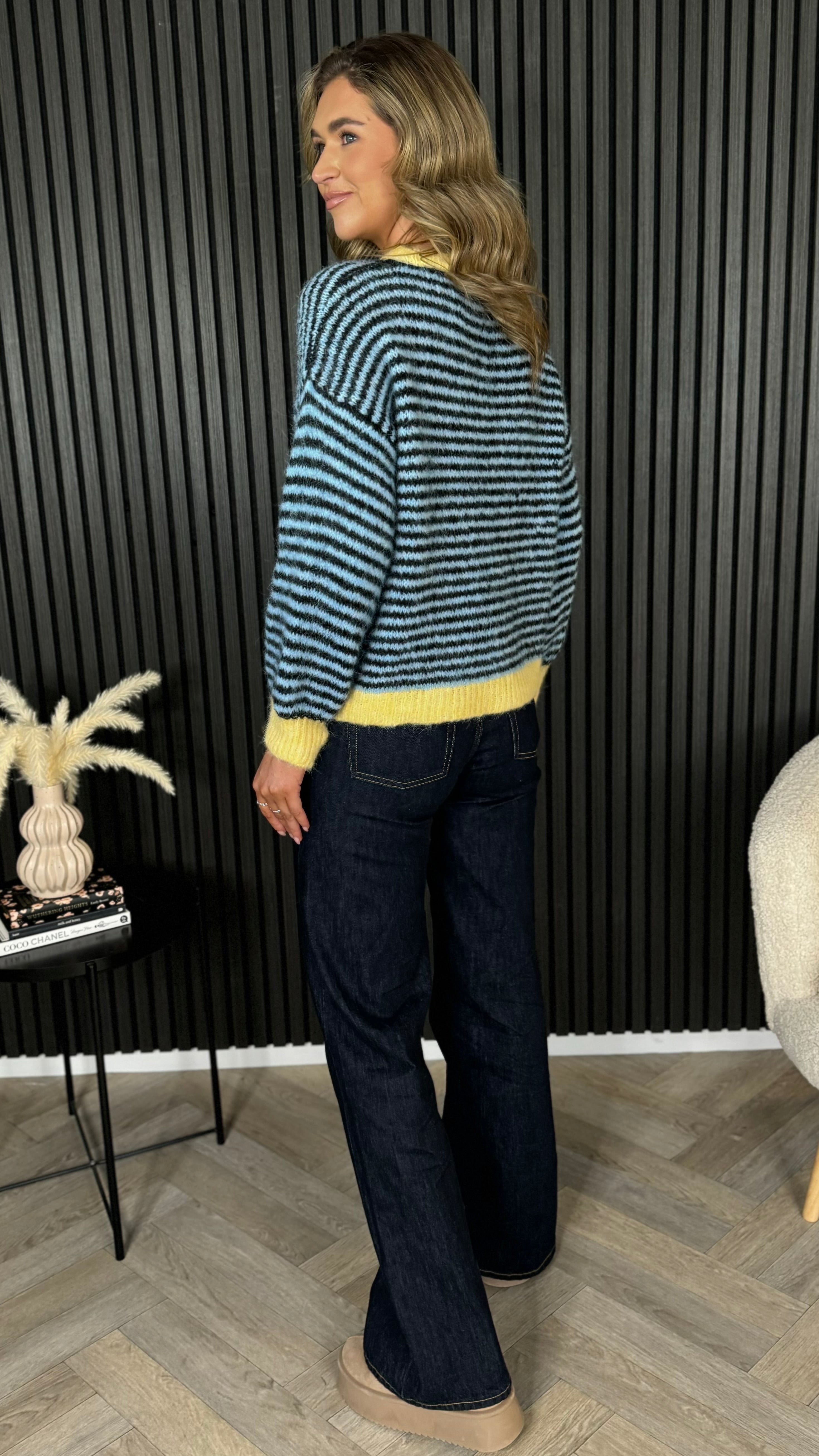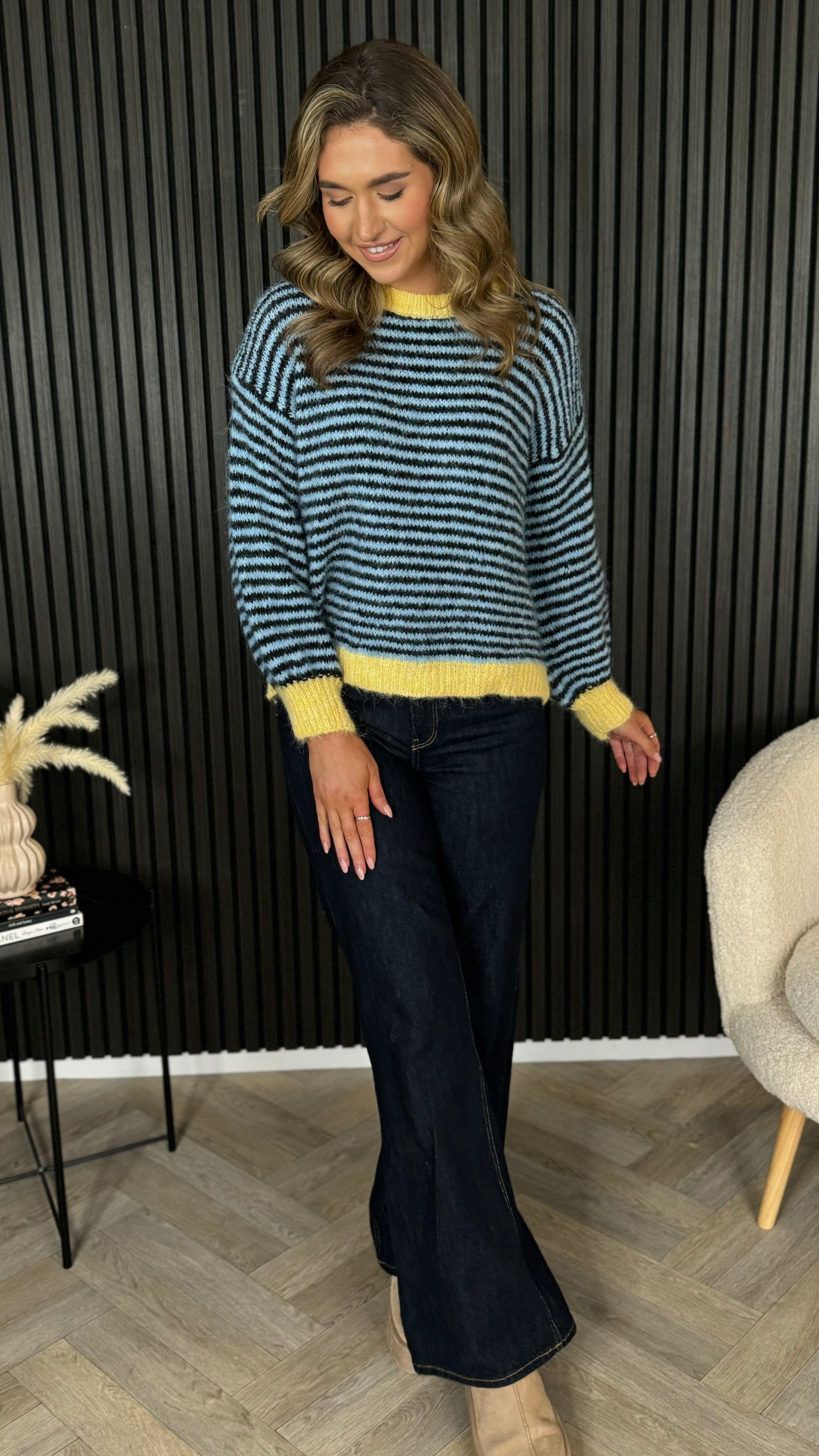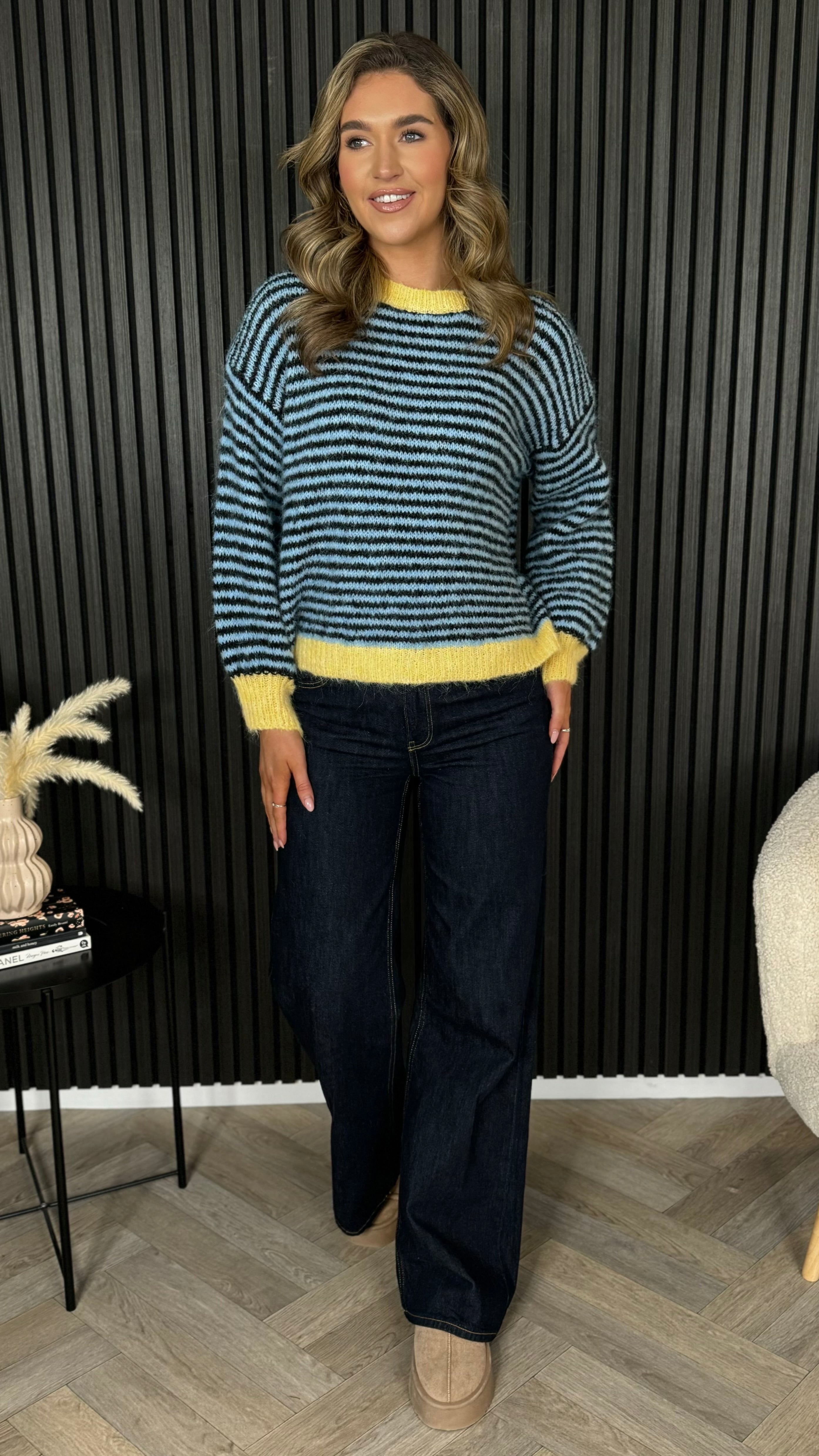 Cosy up in this oversized striped jumper that's equal parts comfort and charm. Featuring bold blue and yellow stripes, a relaxed round neckline, and ribbed cuffs and hem for that perfectly polished finish, it's your new go-to for effortless style. Layer it, dress it down, or wear it solo—this playful piece works harder than it looks.