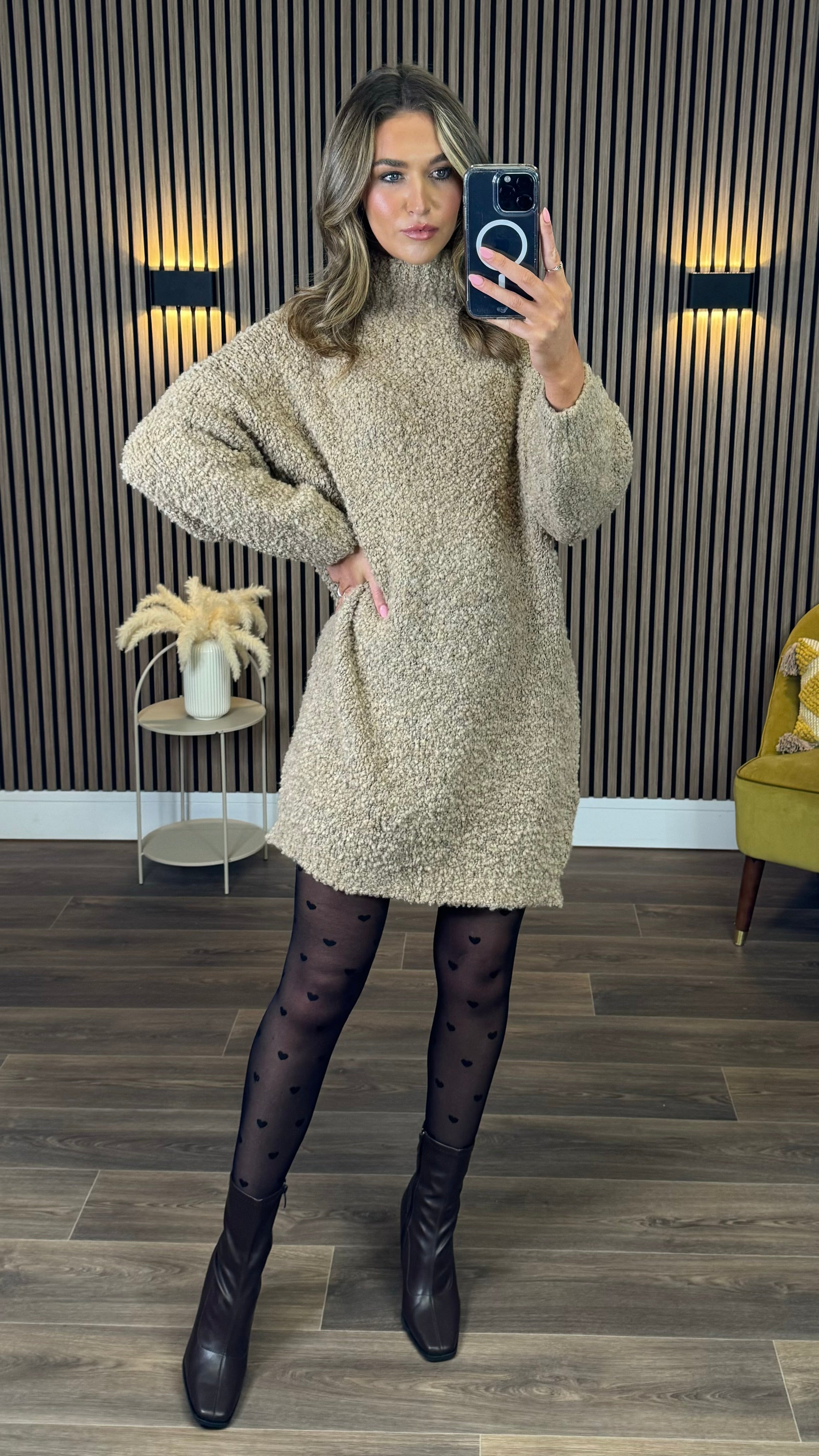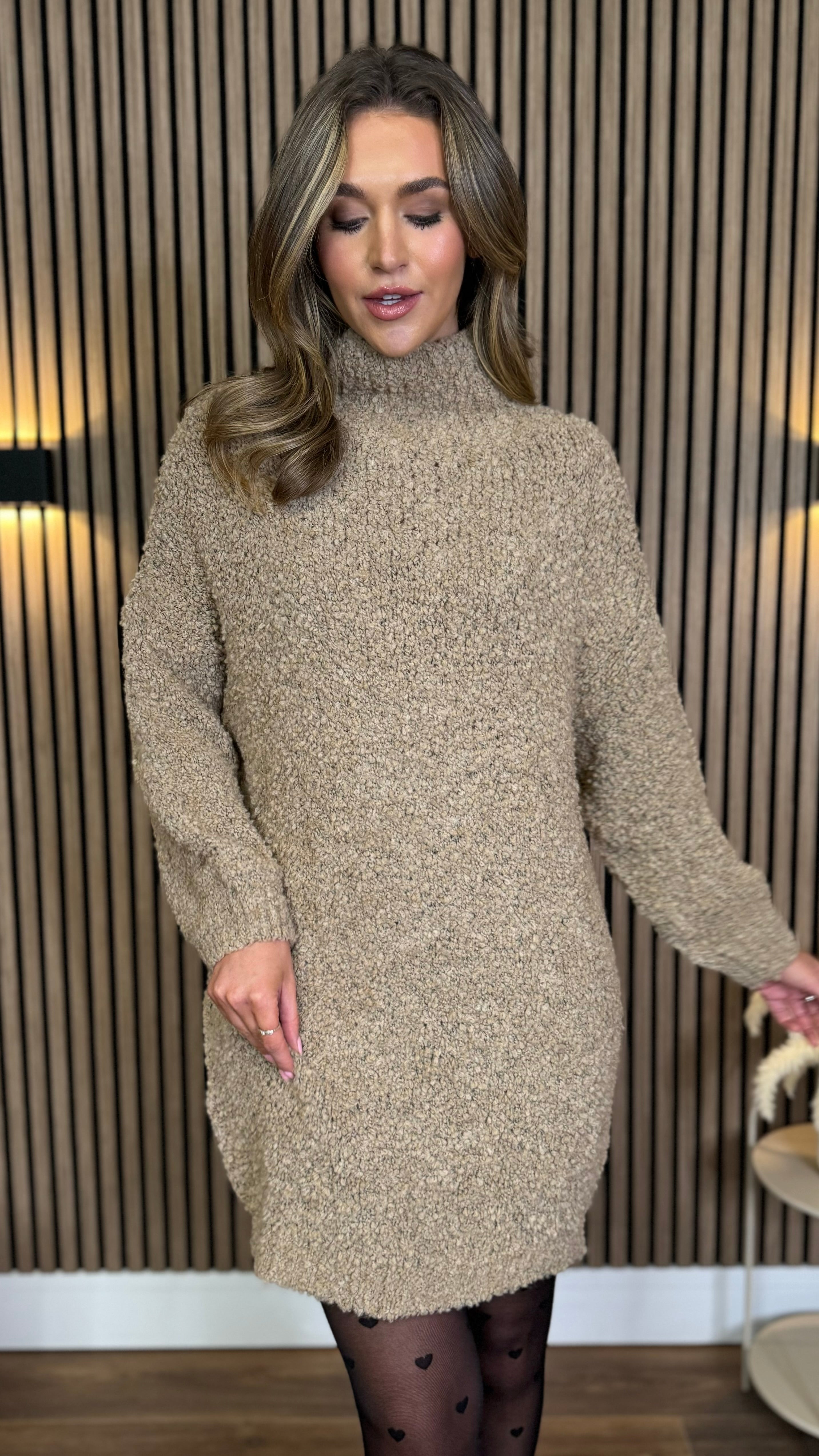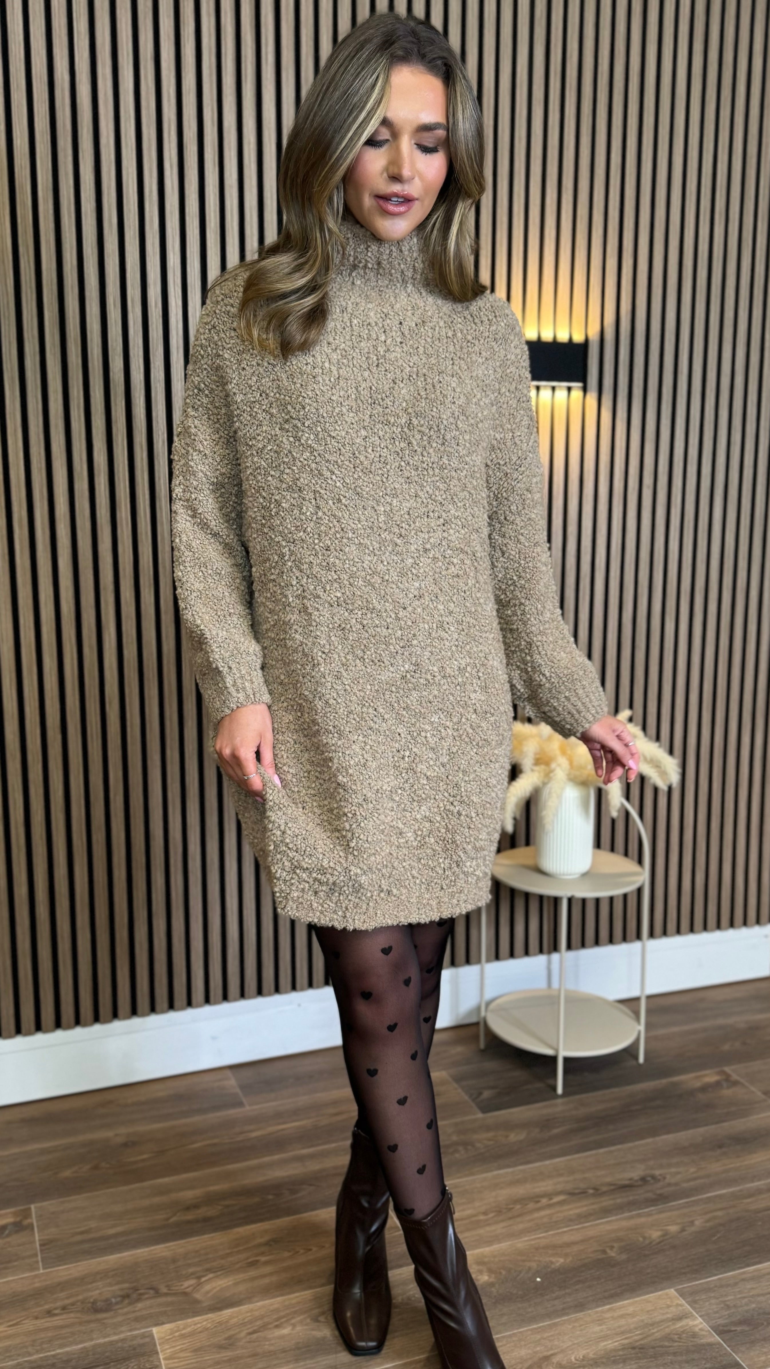 Stay cosy and stylish with our Sadie Taupe Chunky Knit Jumper Dress. Perfect for cooler days, this dress features a high neck for added warmth. Embrace the chunky knit trend and elevate your winter wardrobe with this must-have piece.