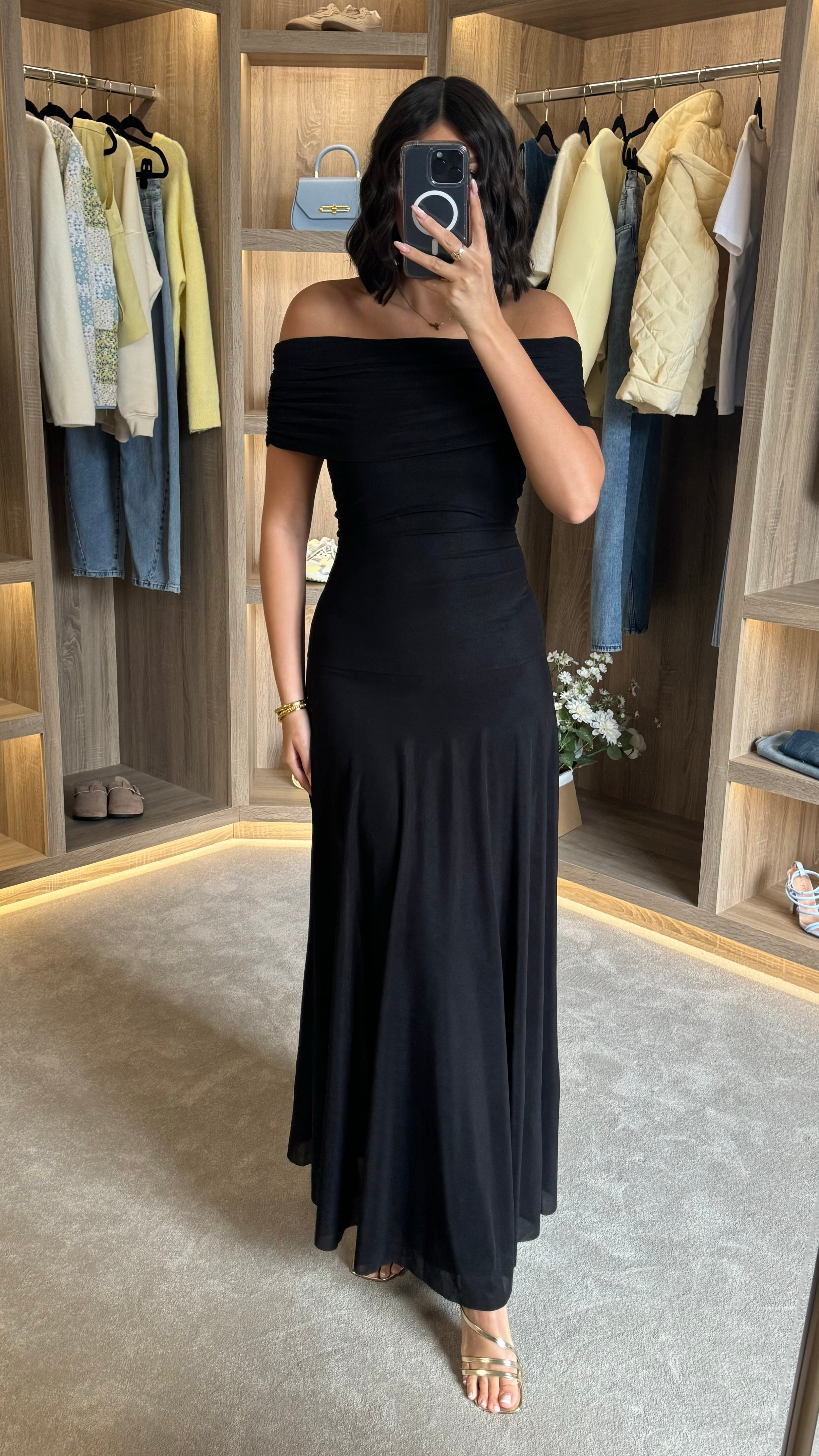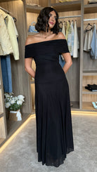 Effortlessly elegant, the Emma Black Off Shoulder Flared Maxi Dress combines romantic styling with contemporary ease. The gathered off-shoulder neckline creates a flattering, feminine silhouette, while the pleated skirt adds graceful movement and dimension. A drop-waist design elongates your frame, and the maxi length delivers sophisticated coverage perfect for evening occasions or special events. Crafted for those who appreciate timeless pieces with modern appeal.