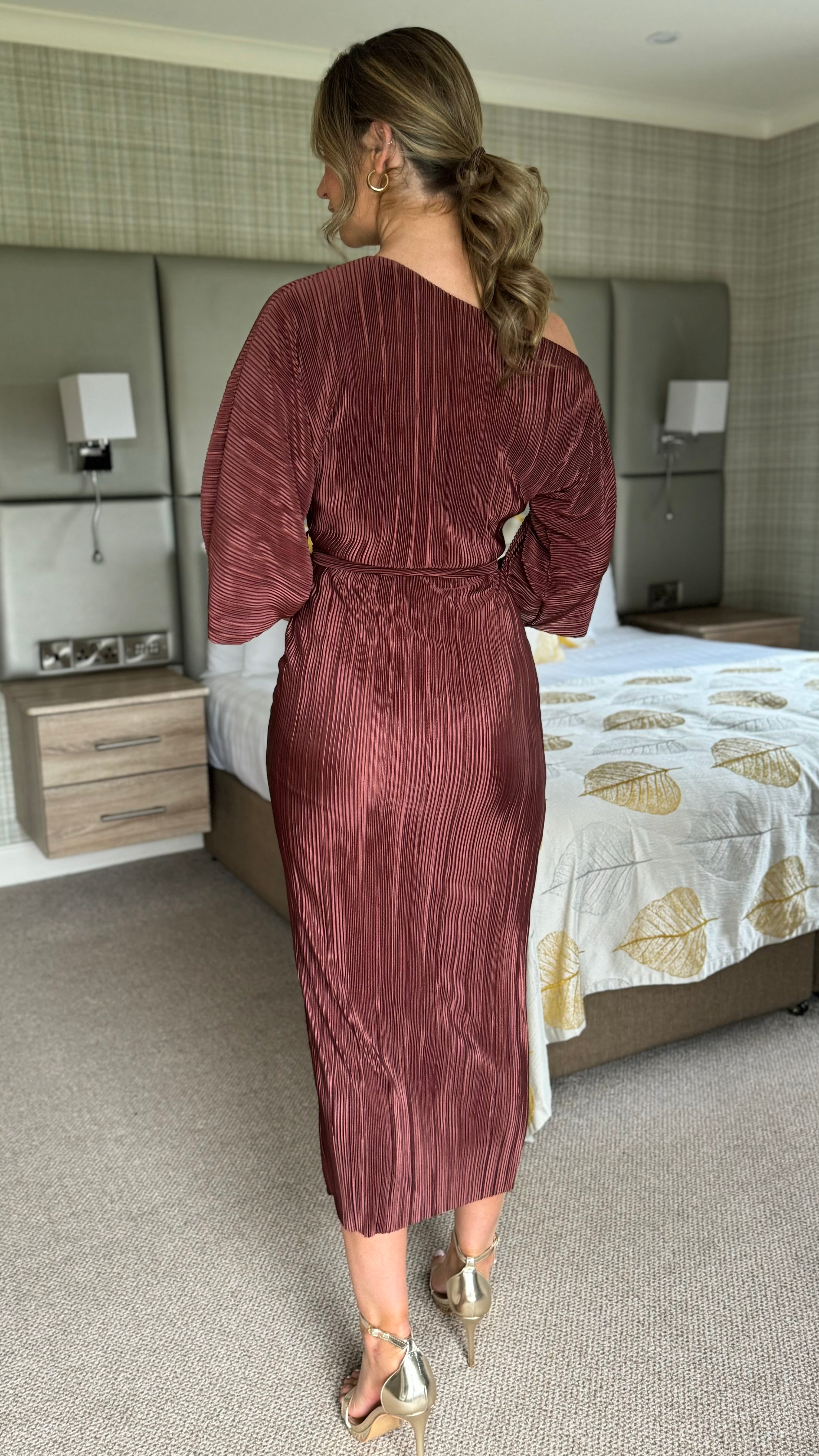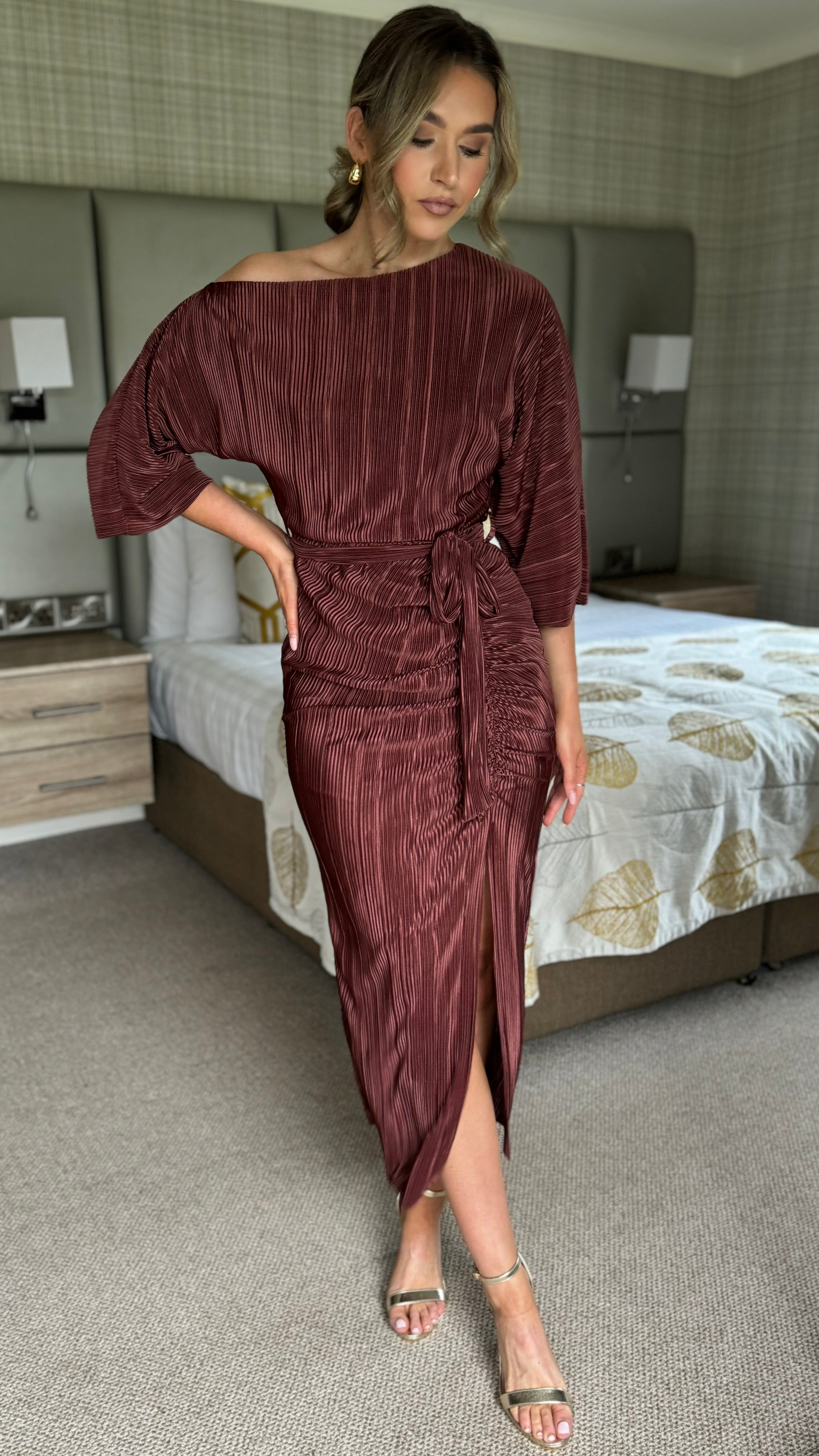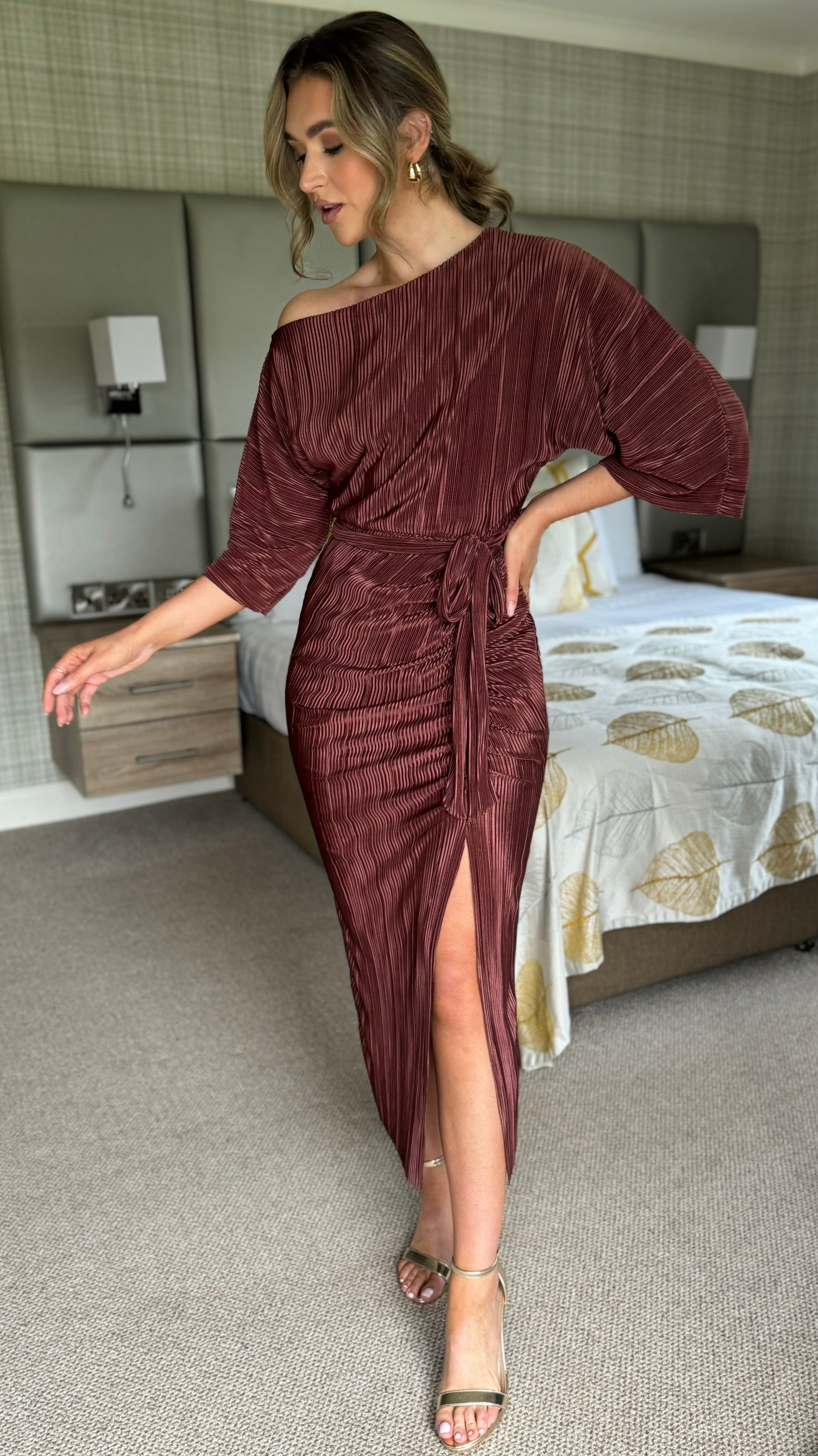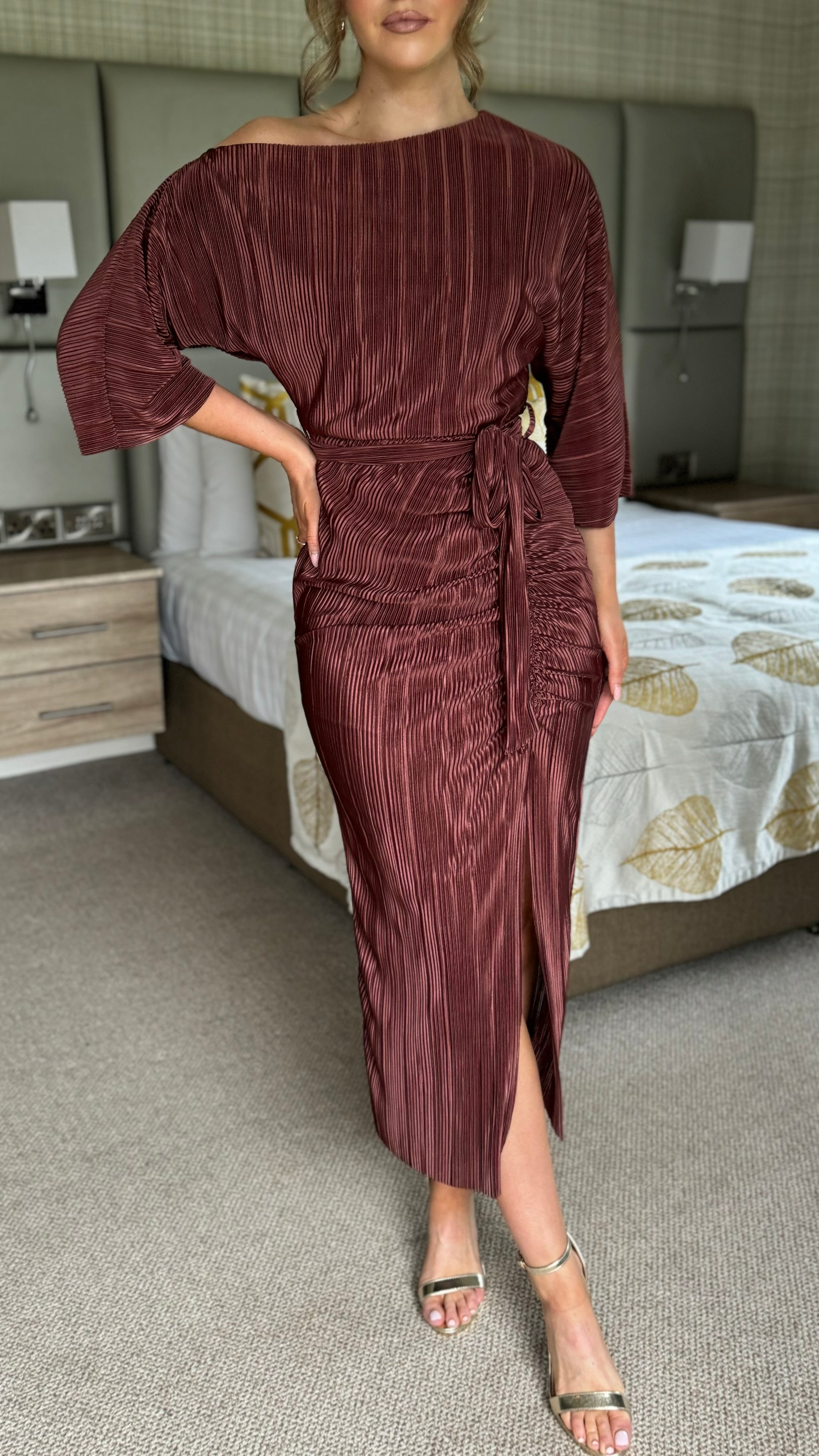 Slip into effortless elegance with this stunning burgundy off-shoulder dress. Crafted from luxuriously soft plissé fabric that drapes beautifully, it features a chic belted waist to define your silhouette and a flirty slit detail for movement and style. Whether you're dressing up for a night out or making a statement at an event, this dress delivers that perfect blend of glamour and comfort.