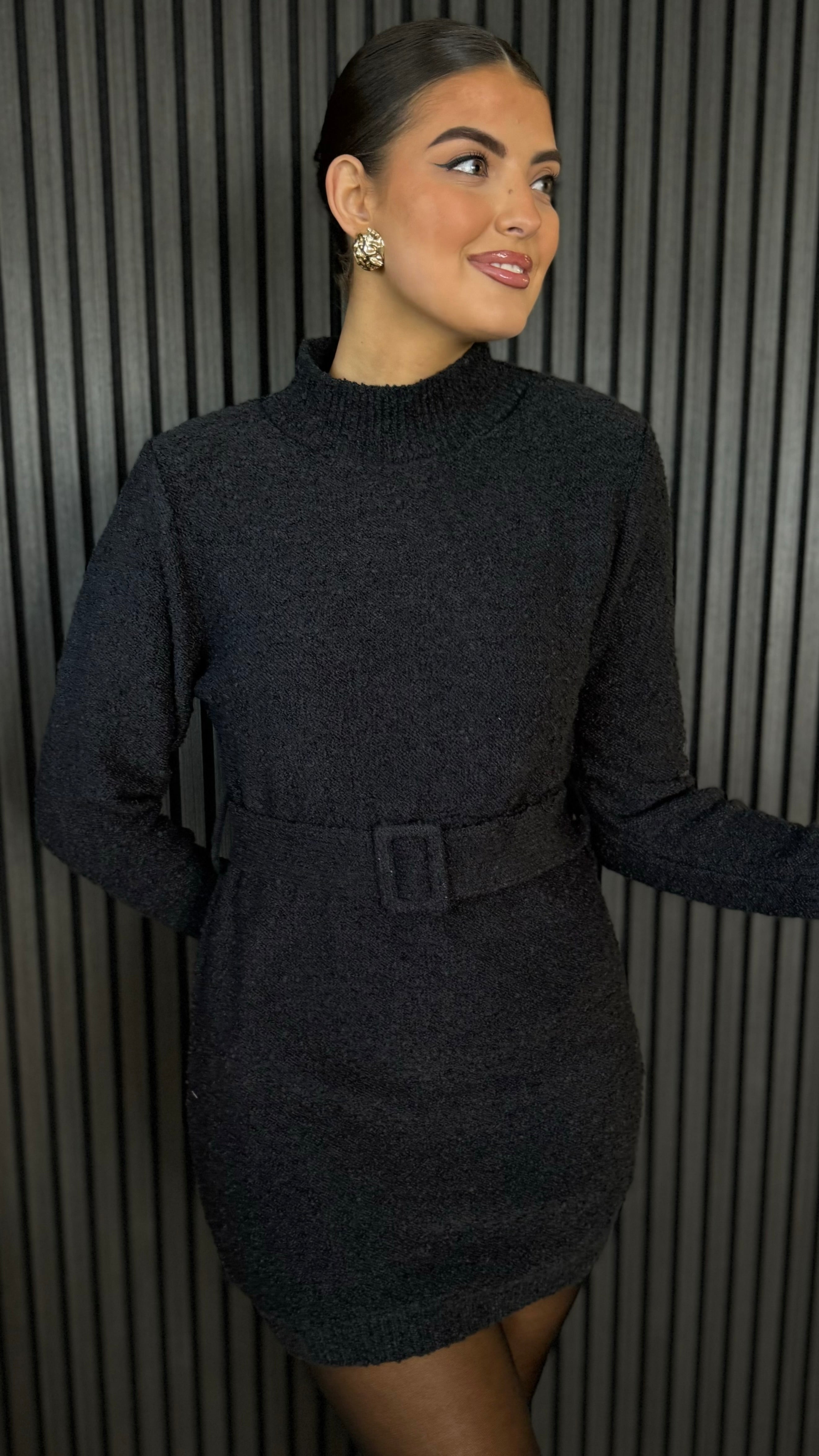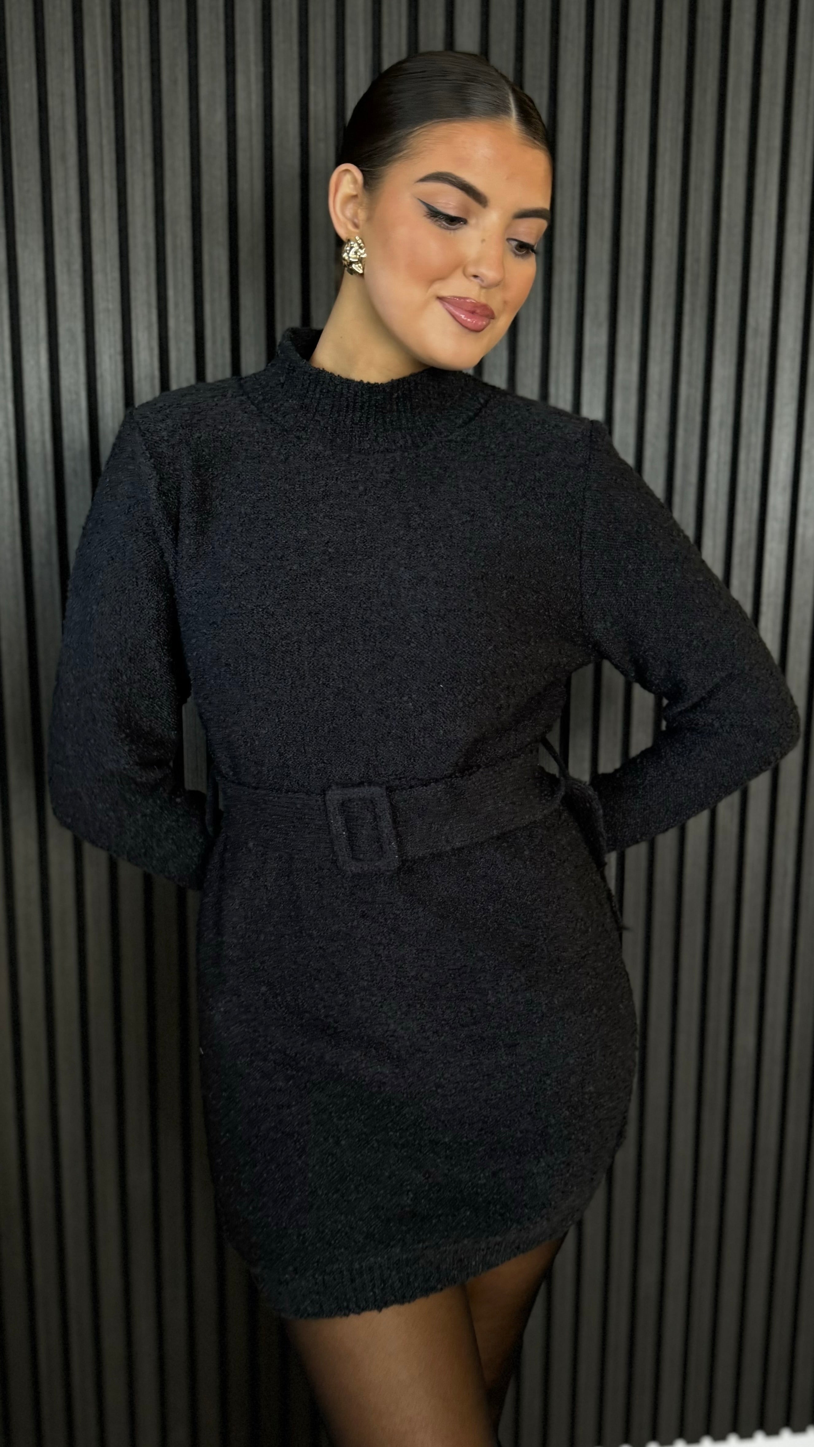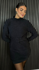 Elevate your everyday style with the Corin Black High Neck Knitted Belted Mini Dress—your new go-to for effortless chic. This cosy knit features a flattering high neckline that frames your face beautifully, while the thick black belt cinches your waist for a defined silhouette. Soft and snuggly fabric keeps you comfortable all day long, whether you're heading to brunch or a casual night out. The belt loops ensure your statement belt stays perfectly in place. Simple, stylish, and undeniably wearable.