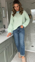 Make a statement with the Adelina Blue & Green Stripe Jumper, where bold stripes meet effortless style. This oversized beauty features charming balloon sleeves that add a playful twist, while the relaxed round neckline keeps things casual and cool. Contrast detailing at the neck and hem adds a cheeky pop of definition. Perfect for layering or wearing solo, it's the kind of piece that turns heads and sparks joy.