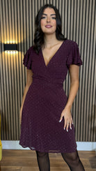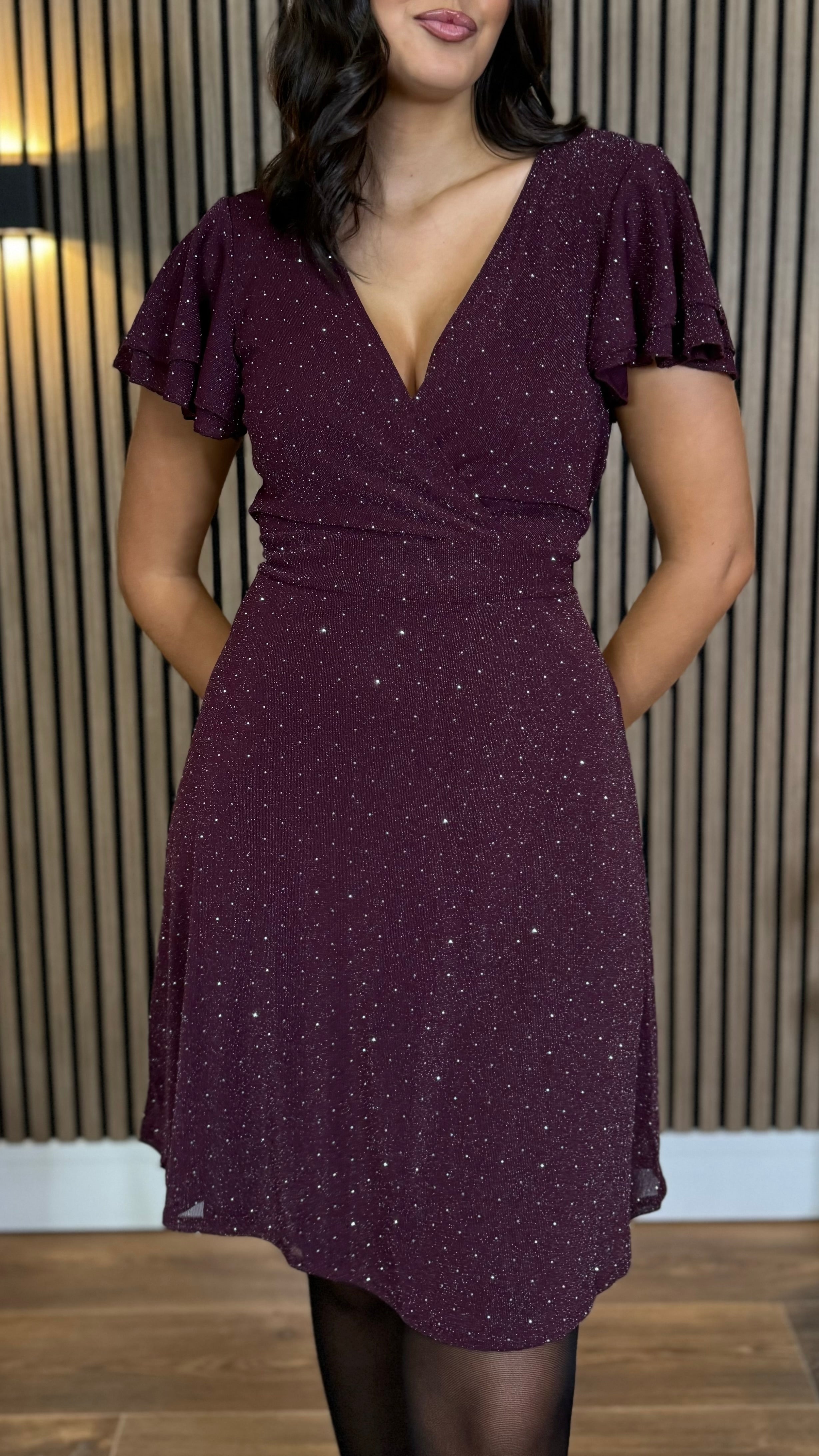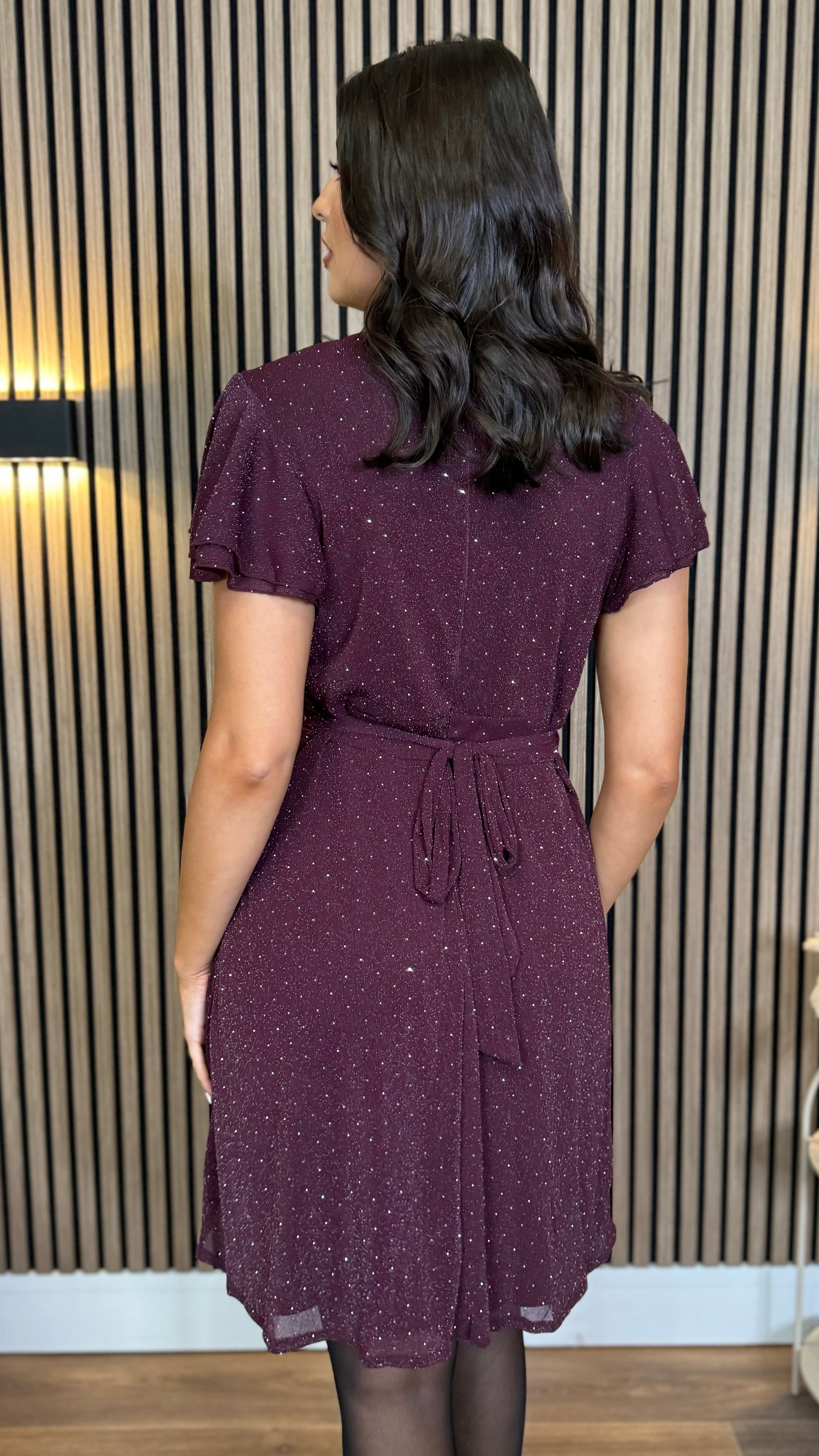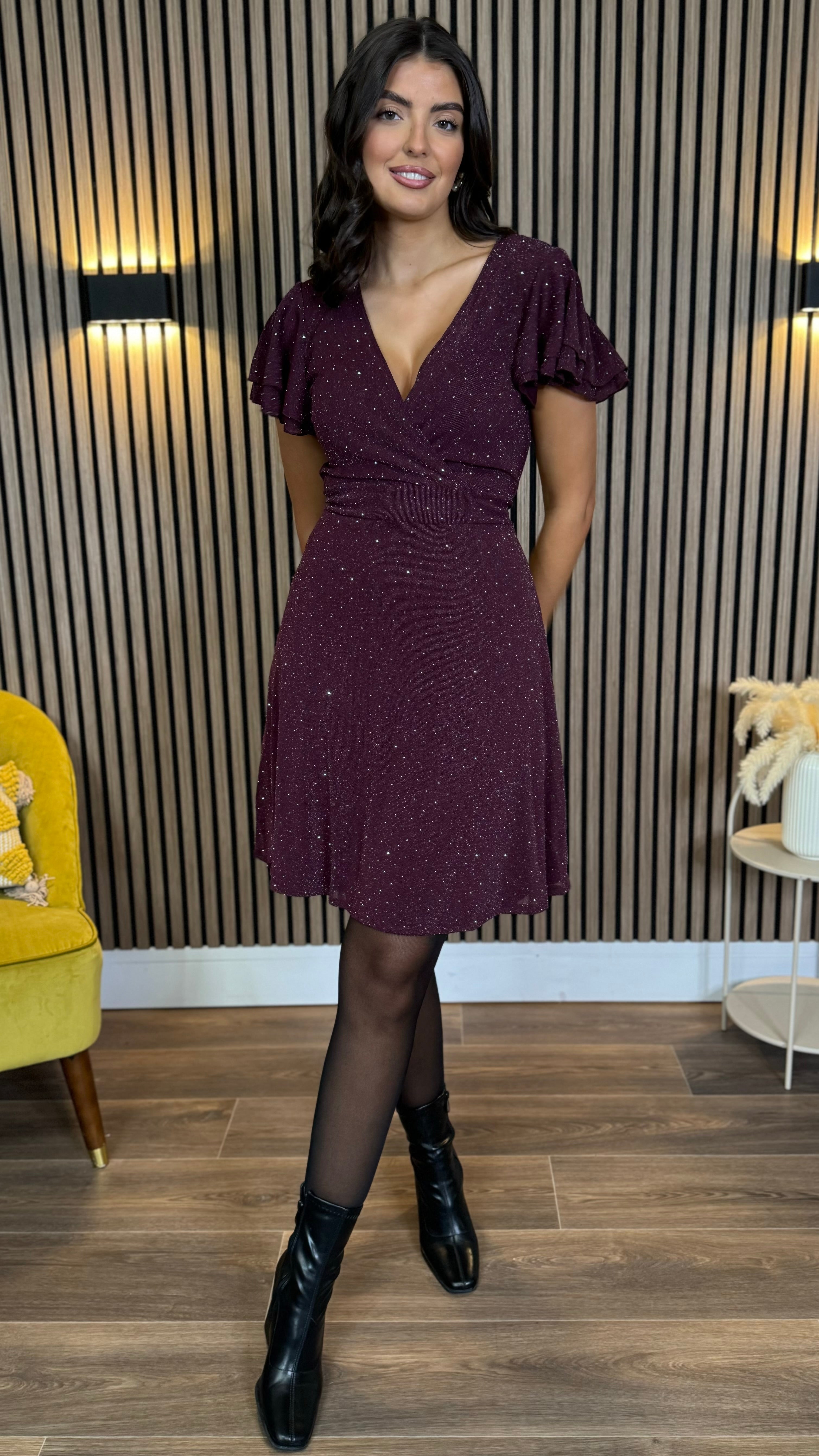 Angie Burgundy Flutter Sleeve Diamante Faux Wrap Mini Dress