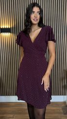 Slip into effortless elegance with this burgundy mini dress that's equal parts chic and fun. ✨ Flutter sleeves add a dreamy, whimsical vibe while the faux wrap silhouette hugs you in all the right ways. 💃 Sparkling diamante details shimmer with every twirl, and the tie detail at the back creates an adorable finishing touch. The V-neckline keeps things sophisticated without overthinking it. Perfect for nights out, special occasions, or whenever you want to feel absolutely fabulous! 🎉