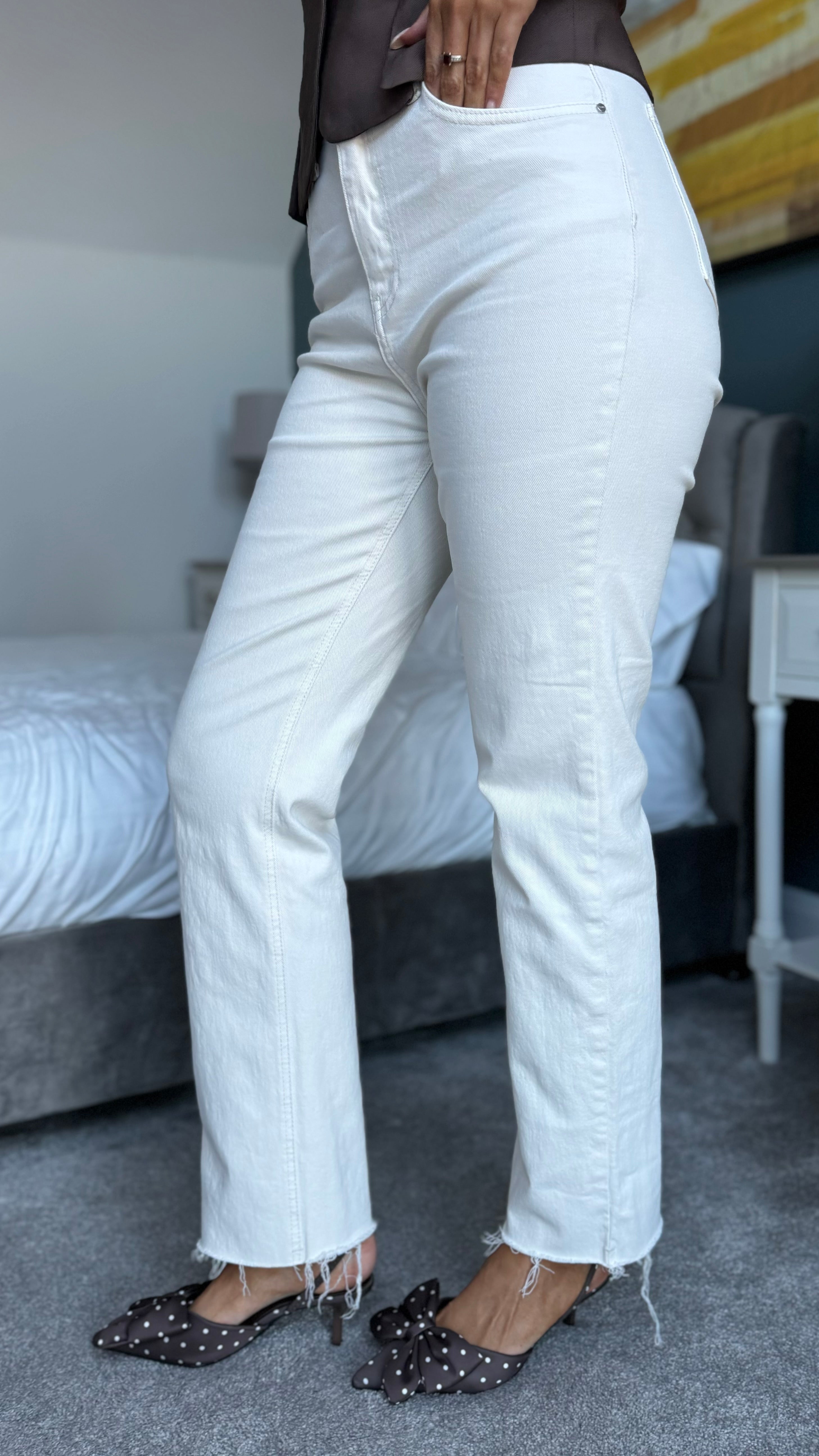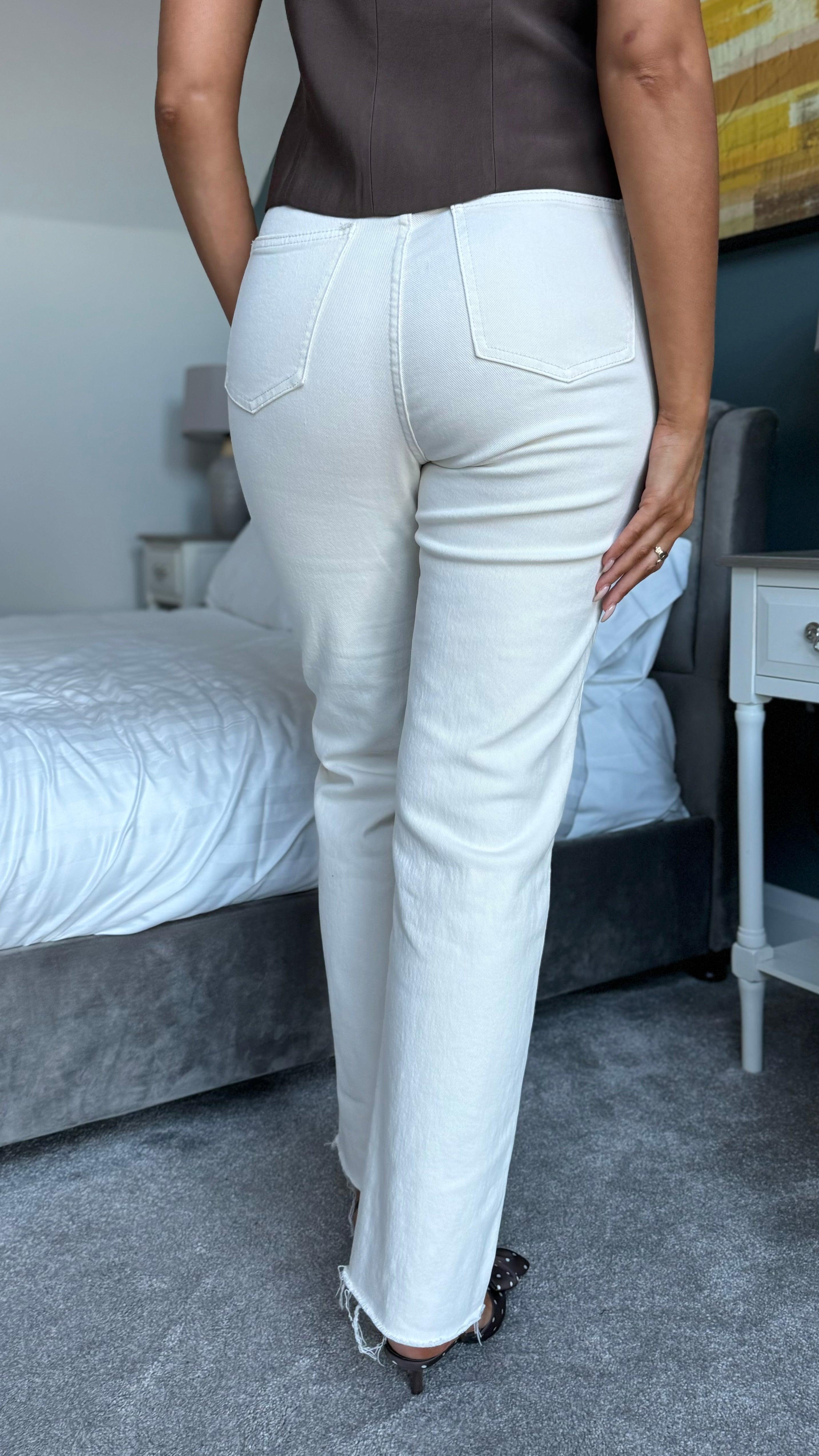 Introducing the Antonia Cream Straight Leg Jeans – your new wardrobe essential that's equal parts chic and comfy. These beauties feature a flattering high-waisted cut that elongates your silhouette, while soft, stretchy denim moves with you all day long. Practical front and back pockets keep your essentials close, and classic belt loops let you style them however you like. Whether you're dressing up or keeping it casual, the Antonia delivers timeless style with a modern twist. Cream never looked so good.