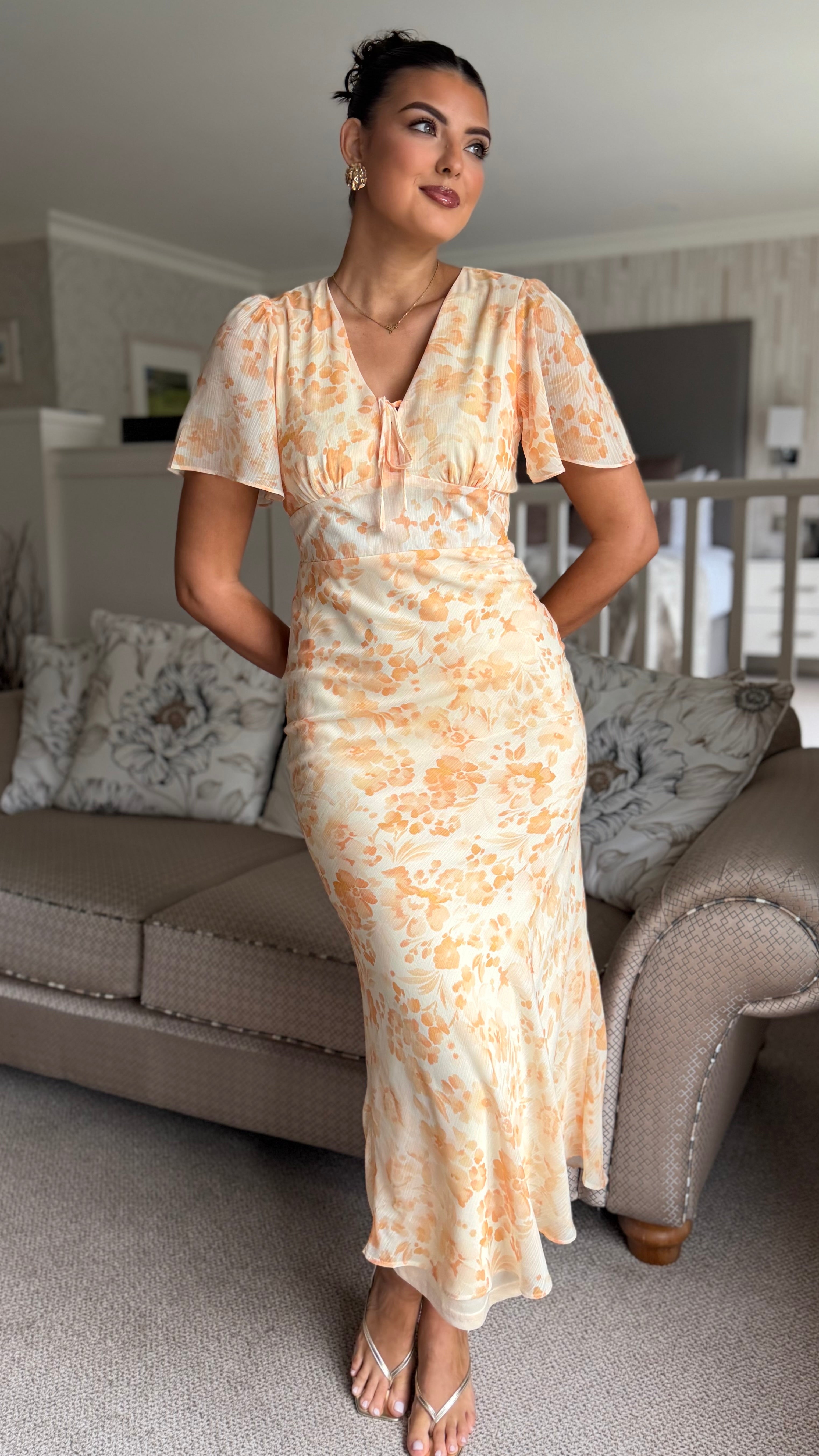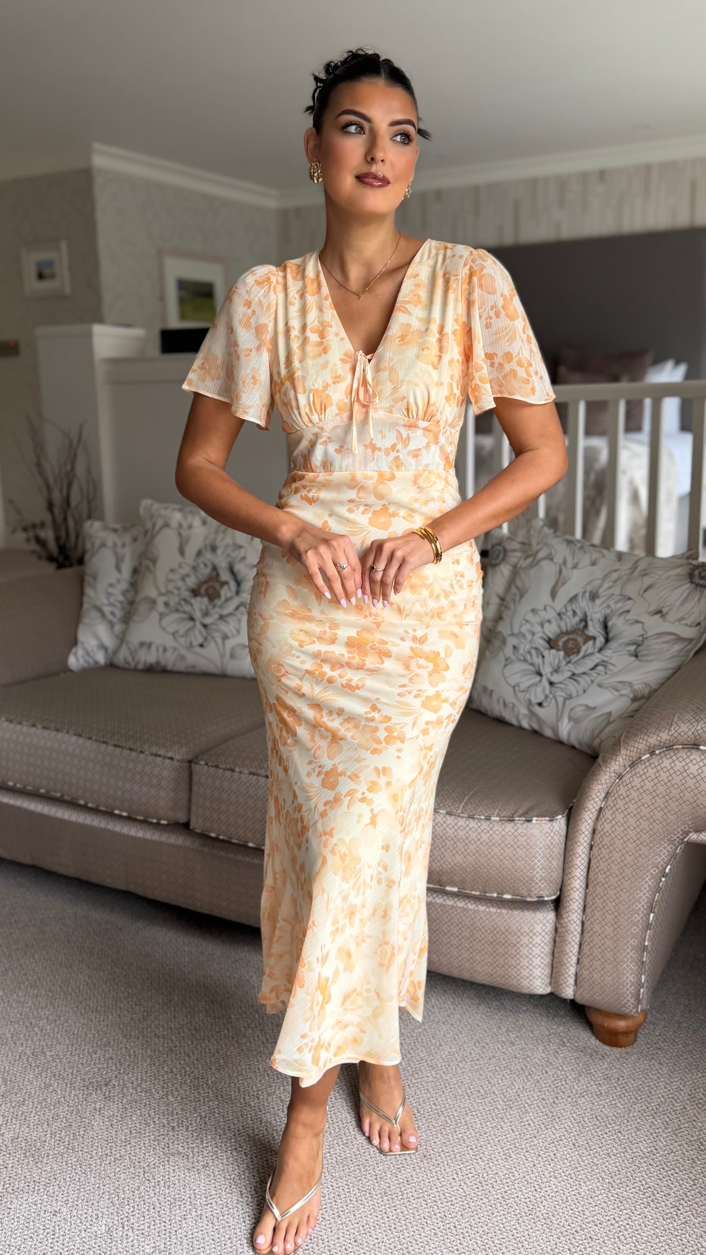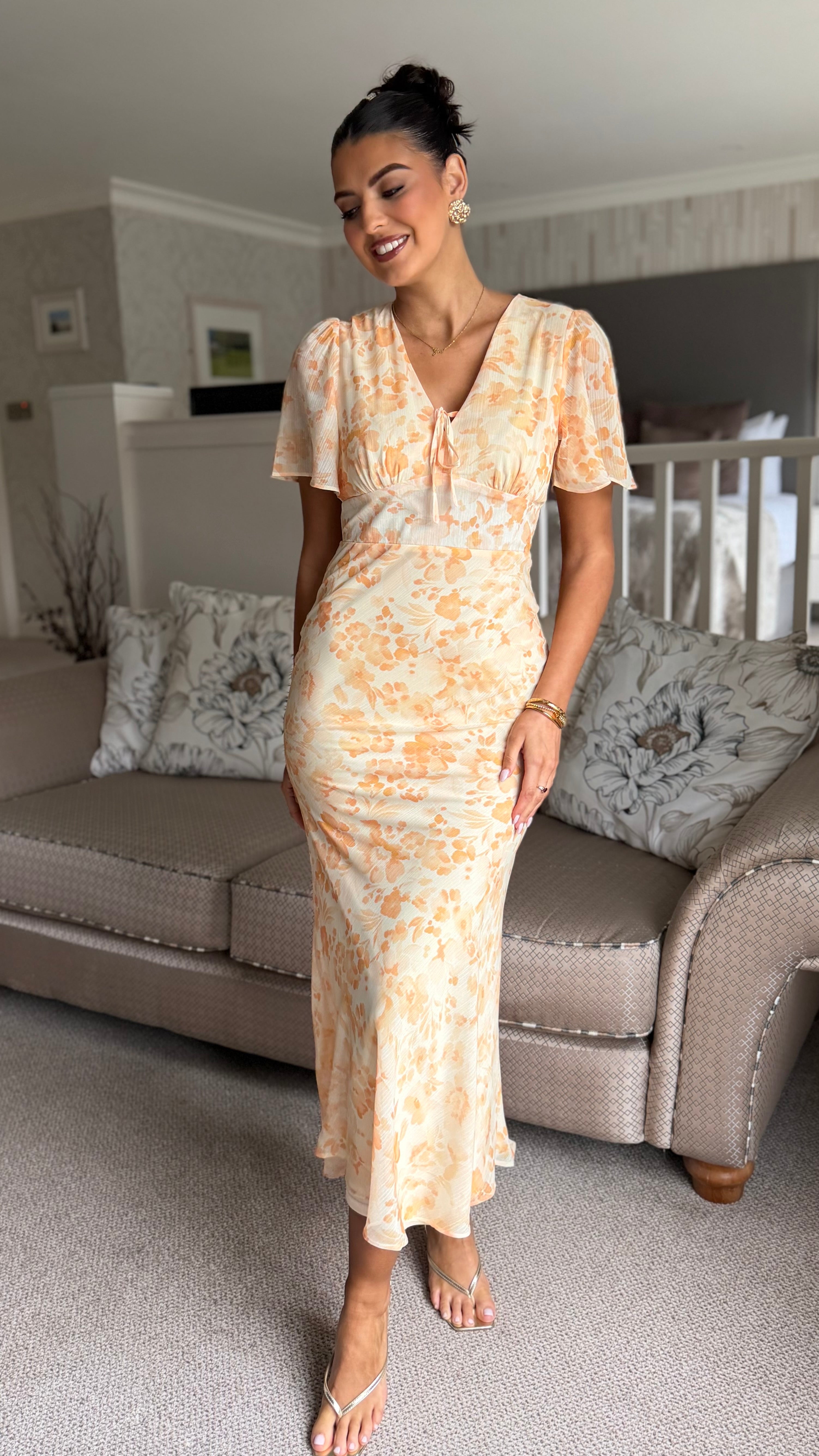Elevate your wardrobe with this stunning floral midi dress, featuring a flattering v neckline and delicate angel sleeves for an effortlessly romantic silhouette. The eye-catching tie detail at the bust adds a playful focal point, while the concealed zip at the back ensures a seamless, polished finish. Fully lined for comfort and confidence, this orange floral design is perfect for occasions that call for understated elegance with a touch of charm.