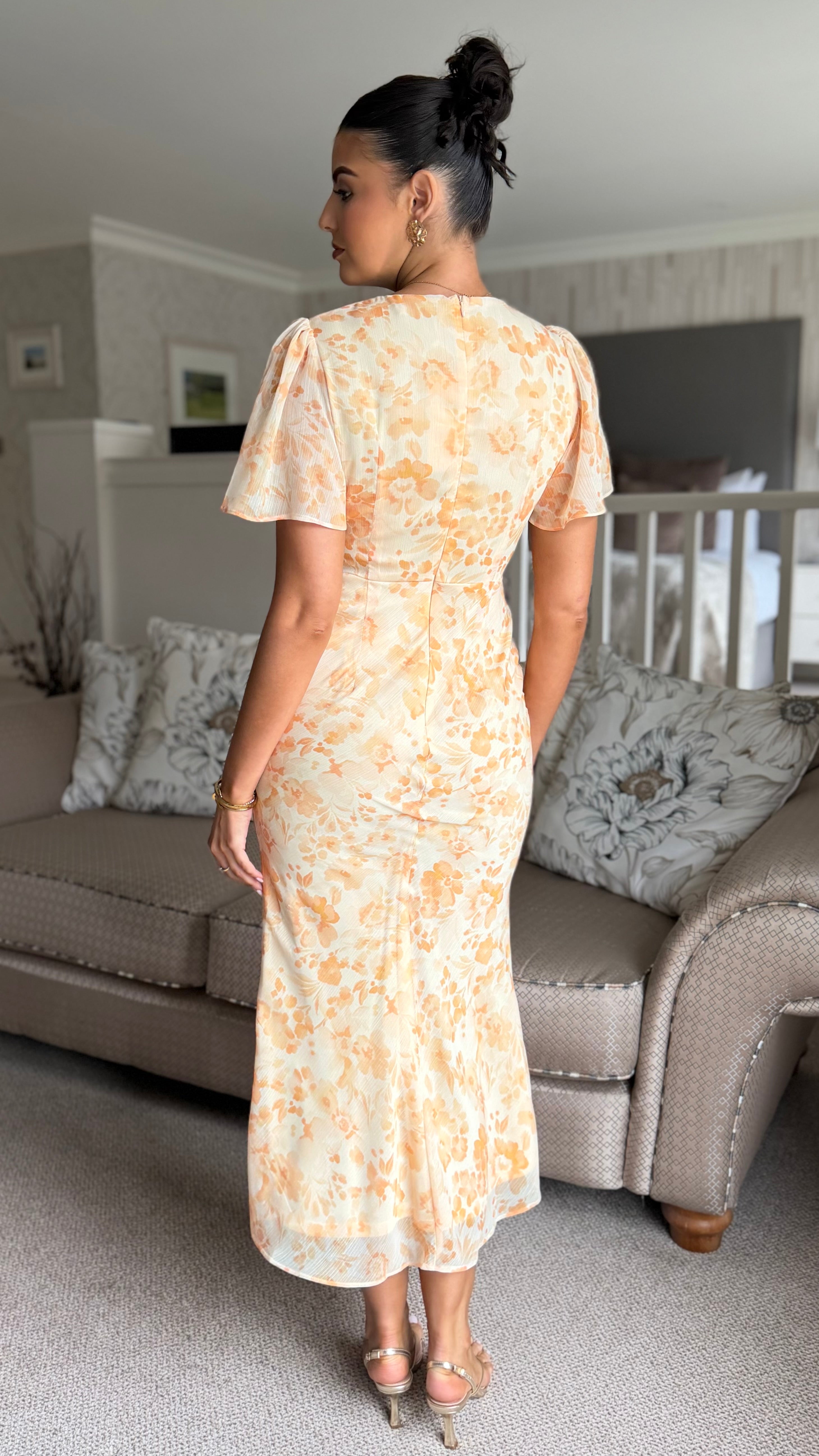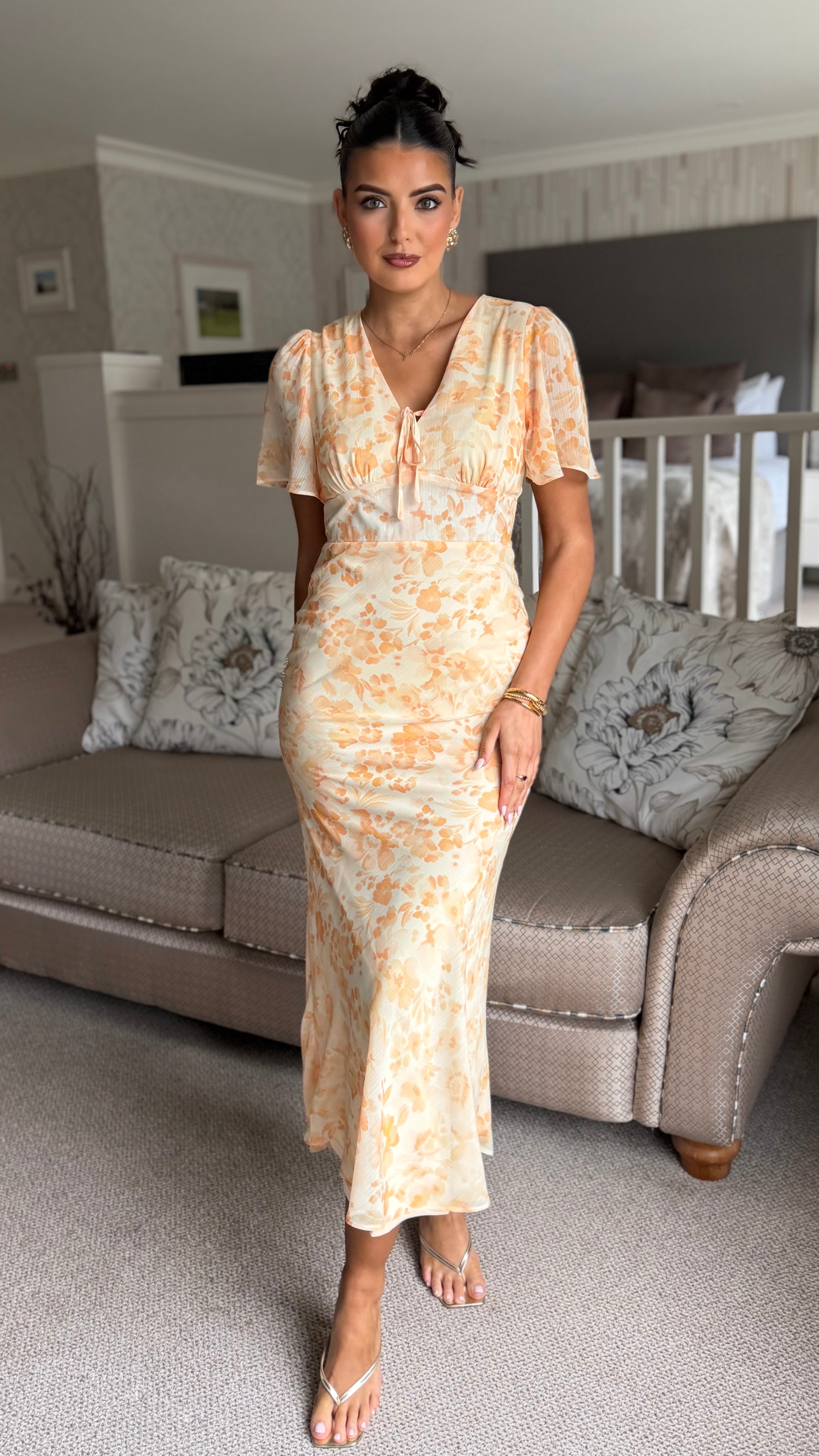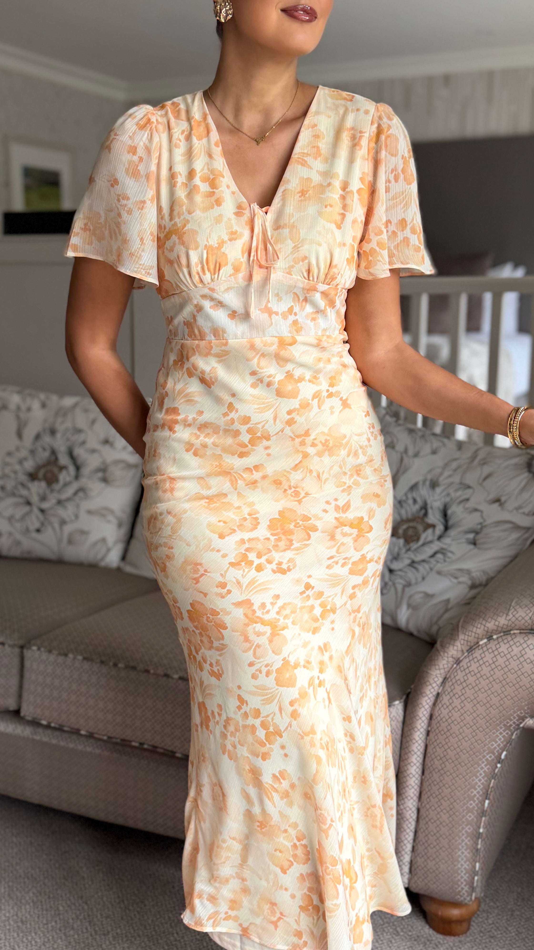 Elevate your wardrobe with this stunning floral midi dress, featuring a flattering v neckline and delicate angel sleeves for an effortlessly romantic silhouette. The eye-catching tie detail at the bust adds a playful focal point, while the concealed zip at the back ensures a seamless, polished finish. Fully lined for comfort and confidence, this orange floral design is perfect for occasions that call for understated elegance with a touch of charm.