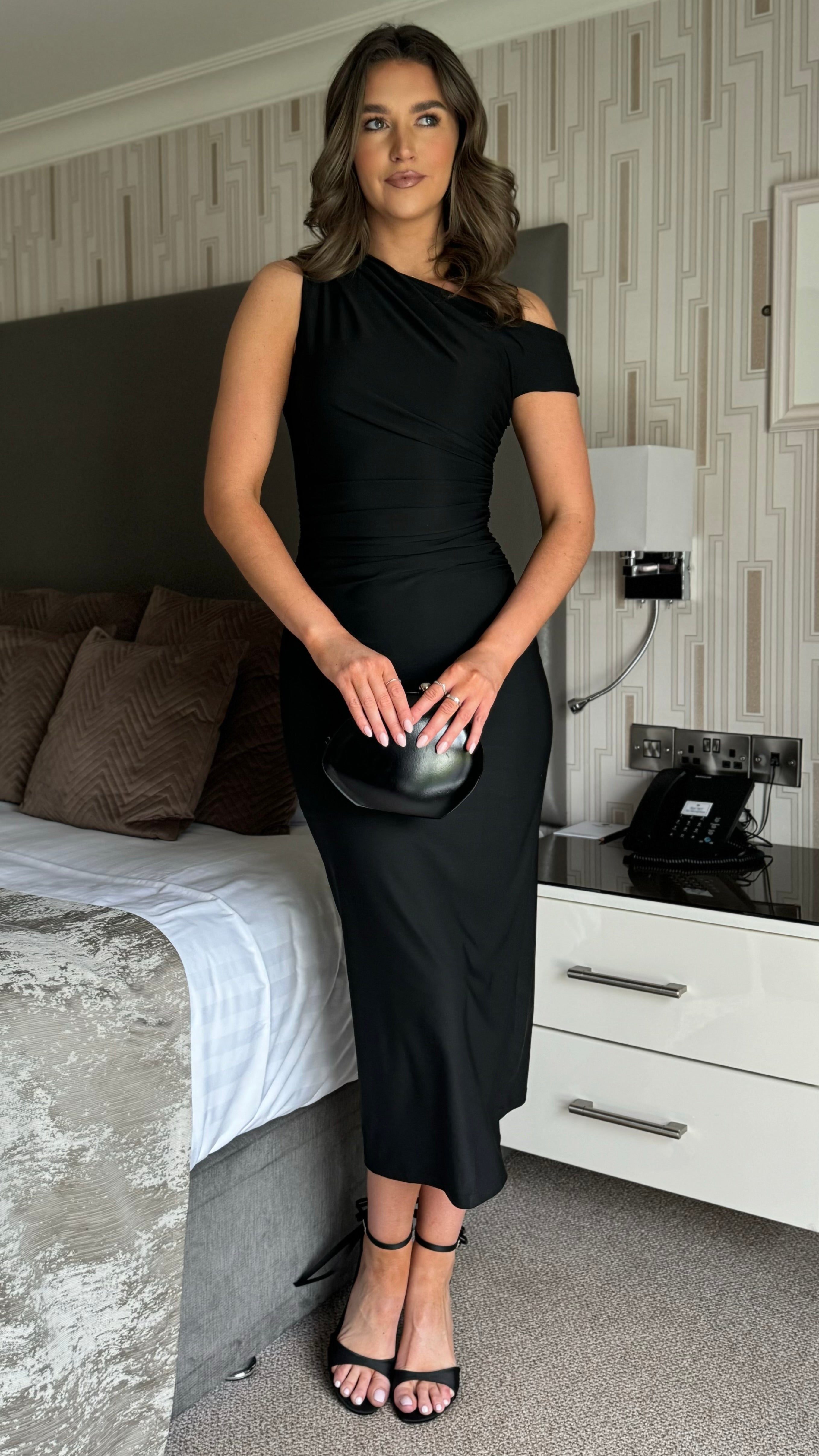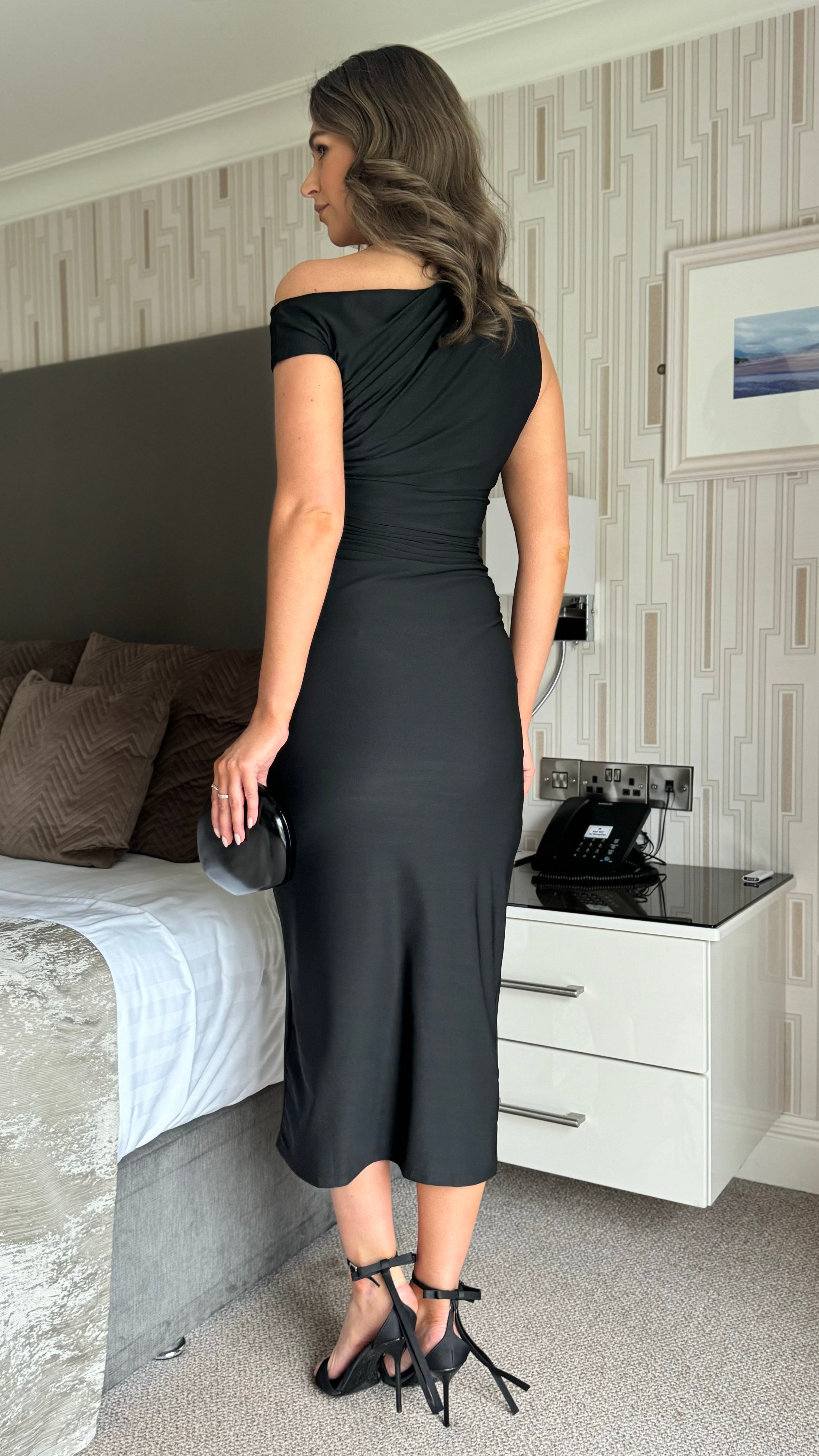 Carly Black Ruched Midi Dress Effortlessly chic meets wonderfully wearable. This midi dress features an eye-catching asymmetric neckline that adds modern edge, while soft, stretchy fabric moves with you all day. Strategic ruching flatters your silhouette and keeps things interesting—no boring lines here. Perfect for everything from brunch to evening plans, this versatile piece proves that comfort and style aren't mutually exclusive.