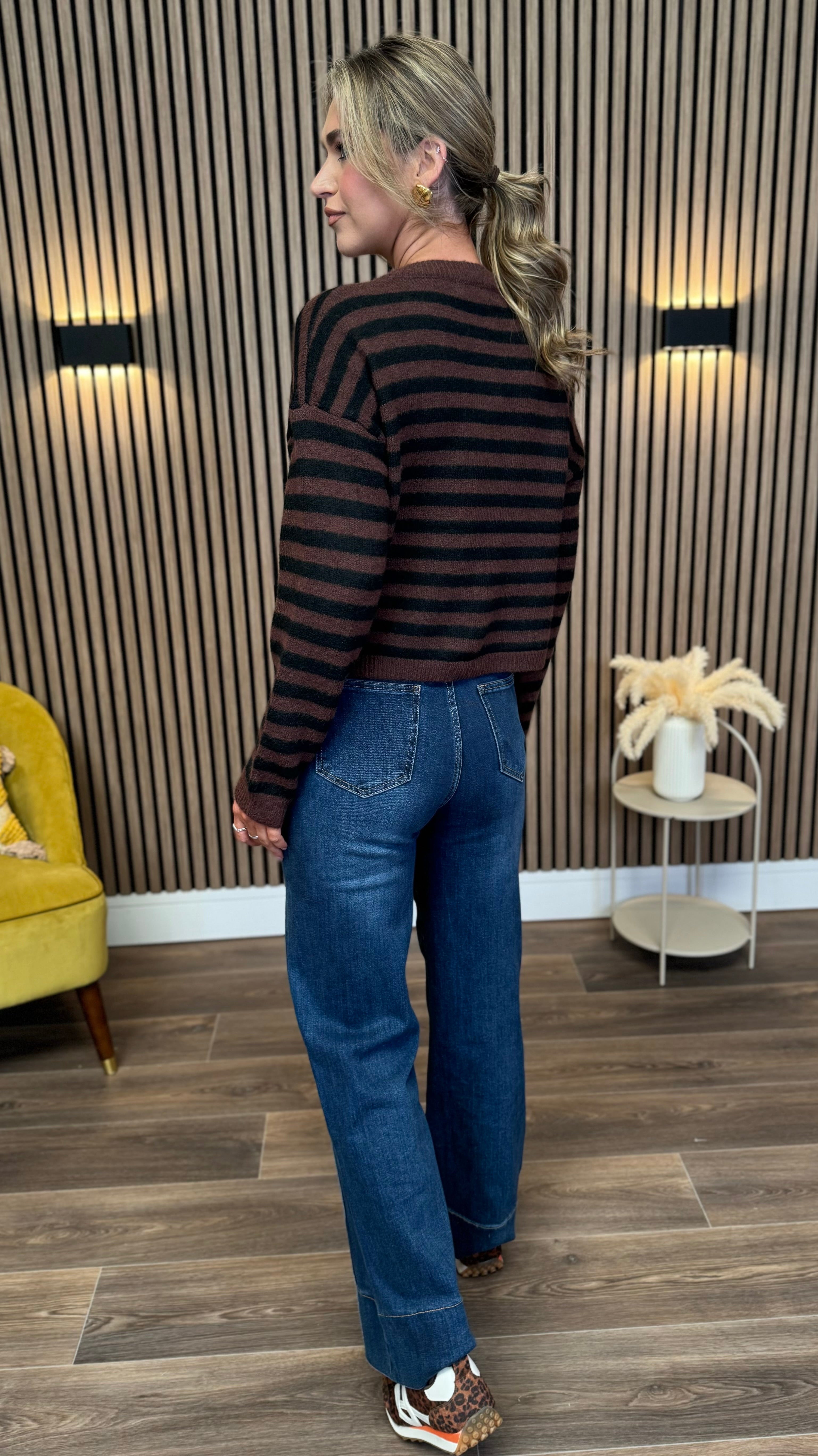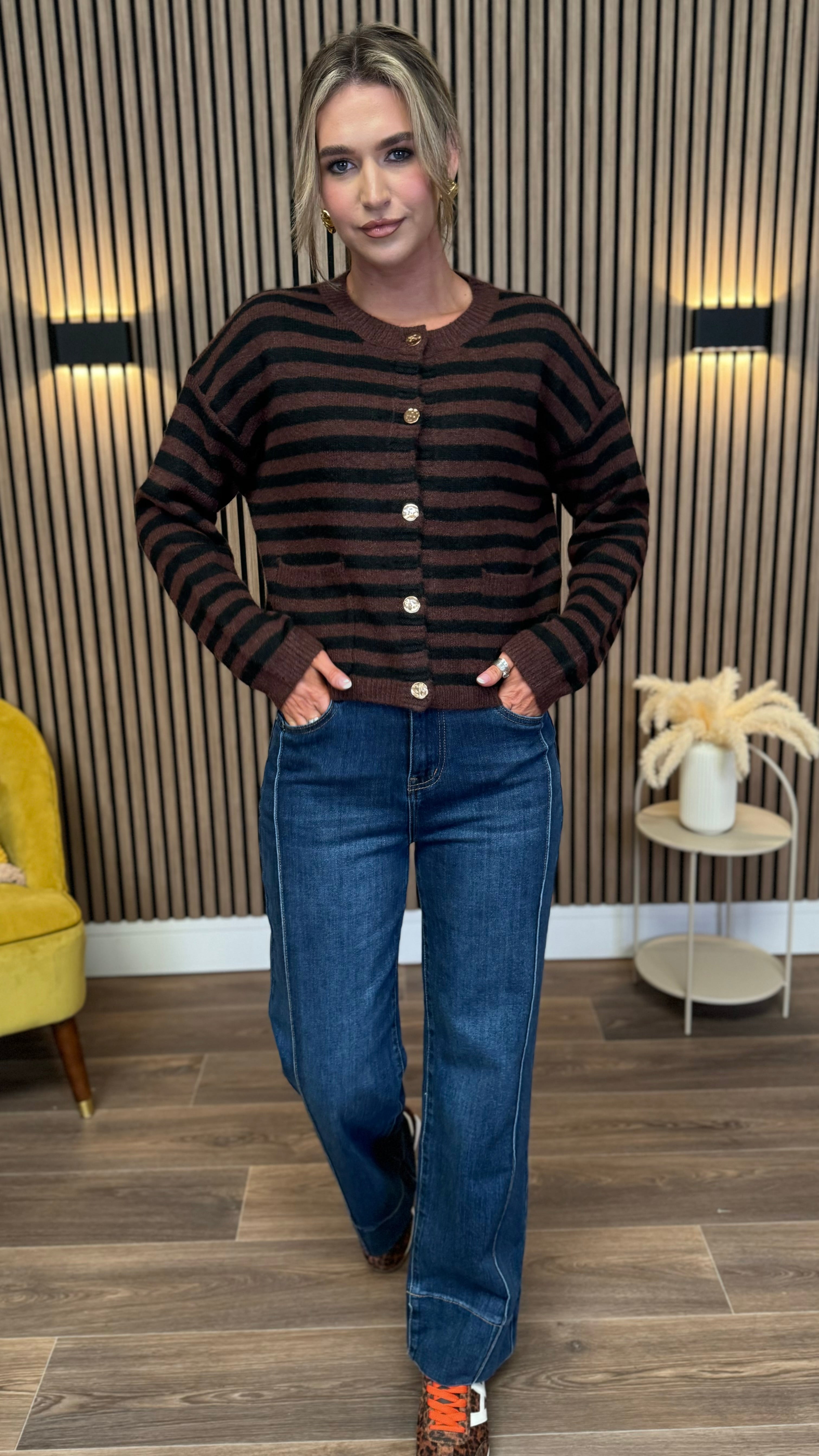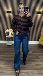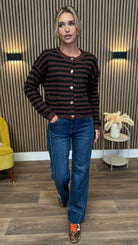 Add a splash of fun to your wardrobe with the Carolina Brown & Black Striped Cardigan. Featuring a cozy round neck and long sleeves, it’s perfect for layering on chilly days. The playful stripe pattern is complemented by chic gold button details, adding a touch of sparkle to your casual look. Comfortable and stylish, this cardigan is ready to brighten up any outfit!