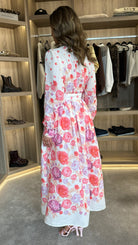Slip into playful elegance with the Coraline Red & Purple Floral Printed Belted Midi Dress. This dress features a dazzling floral print, a covered button down design, and a high neck for a touch of sophistication. The belted waist cinches for a flattering silhouette, while the button detail cuffs add a charming finishing touch. Perfect for any occasion, this dress will have you feeling confident and stylish!
