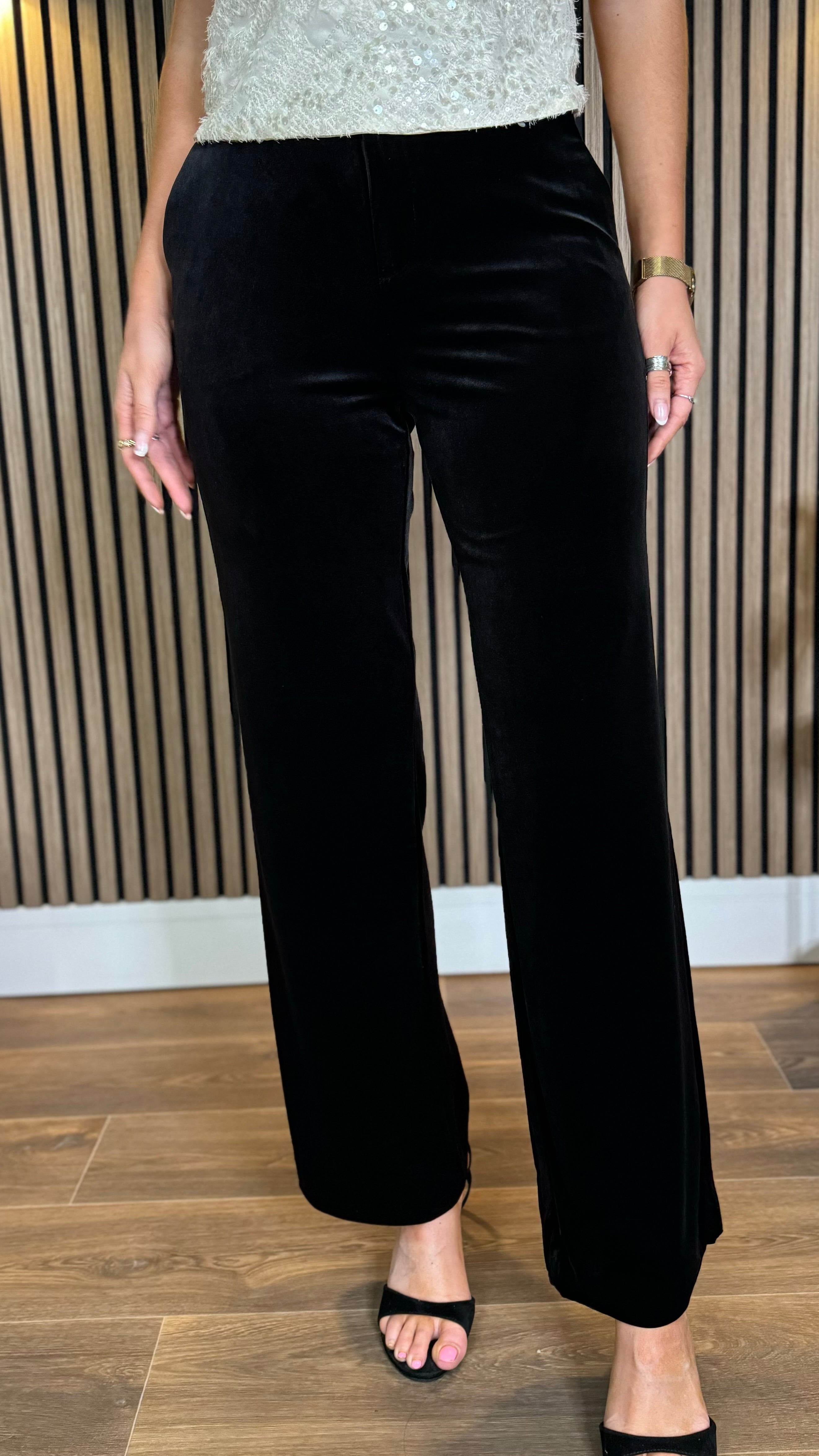 Add a touch of velvet to your wardrobe with Corey Black Velvet Finish Straight Leg Trousers. The slight flare at the bottom adds a hint of playfulness to these sleek and stylish trousers. Perfect for any occasion! 🖤
