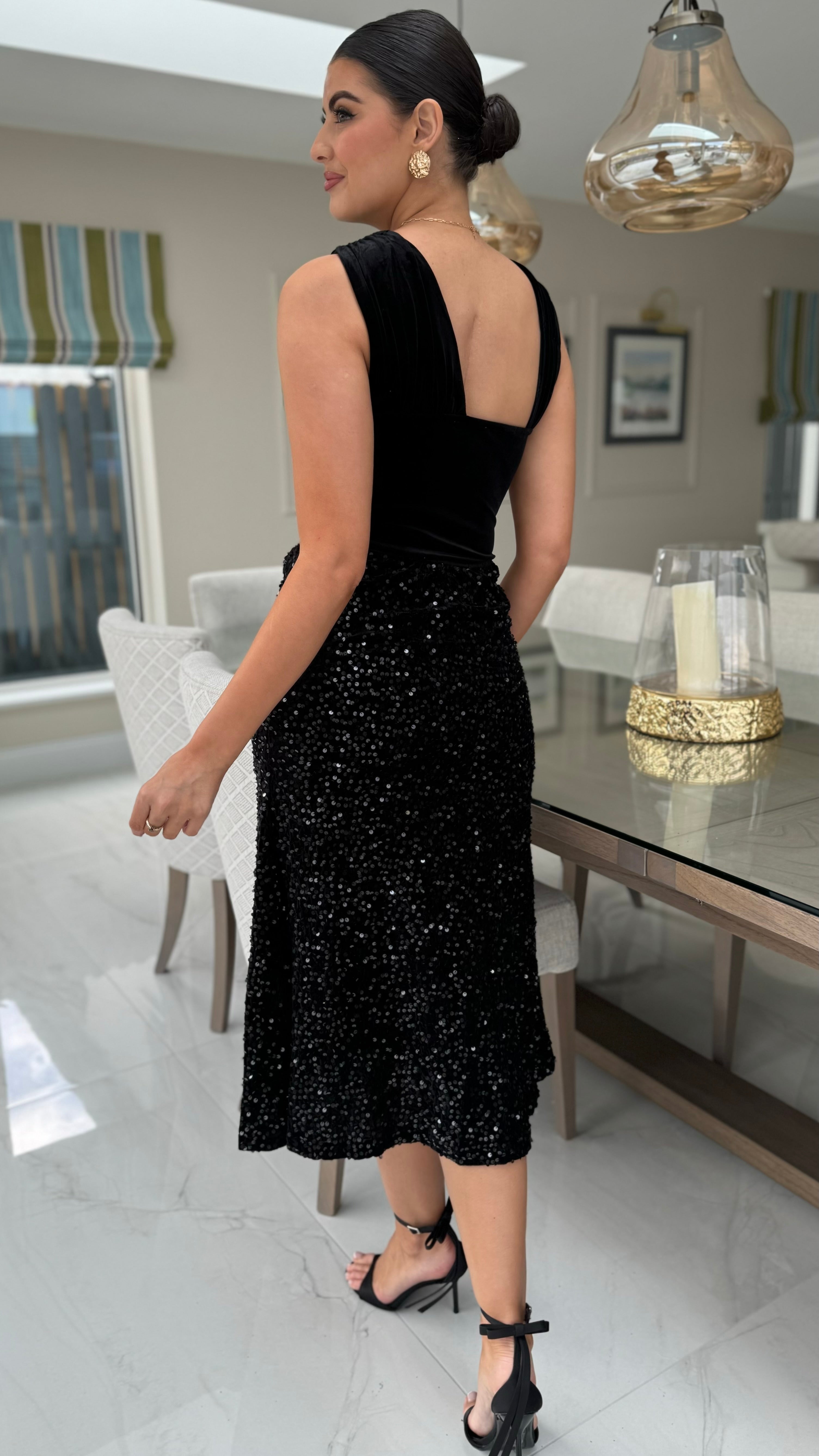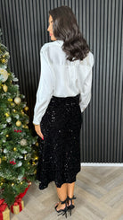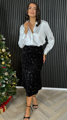 Dazzle in this show-stopping black sequin midi skirt that's ready to turn heads at any occasion. Covered entirely in shimmering sequins, this piece delivers maximum sparkle with minimal effort. The comfortable elasticated waistband ensures an easy, flattering fit, while the soft lining keeps you feeling fabulous all night long. Perfect for parties, nights out, or whenever you want to add some serious glam to your wardrobe.