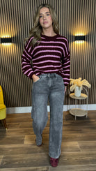 Cozy up in the Dylan Burgundy & Pink Stripe Jumper, featuring a charming round neckline and playful stripes that brighten your day. With long sleeves and a ribbed finish at the cuffs and hem, it offers a relaxed fit that feels as soft and cuddly as a hug. Perfect for adding a splash of fun to your comfy wardrobe!