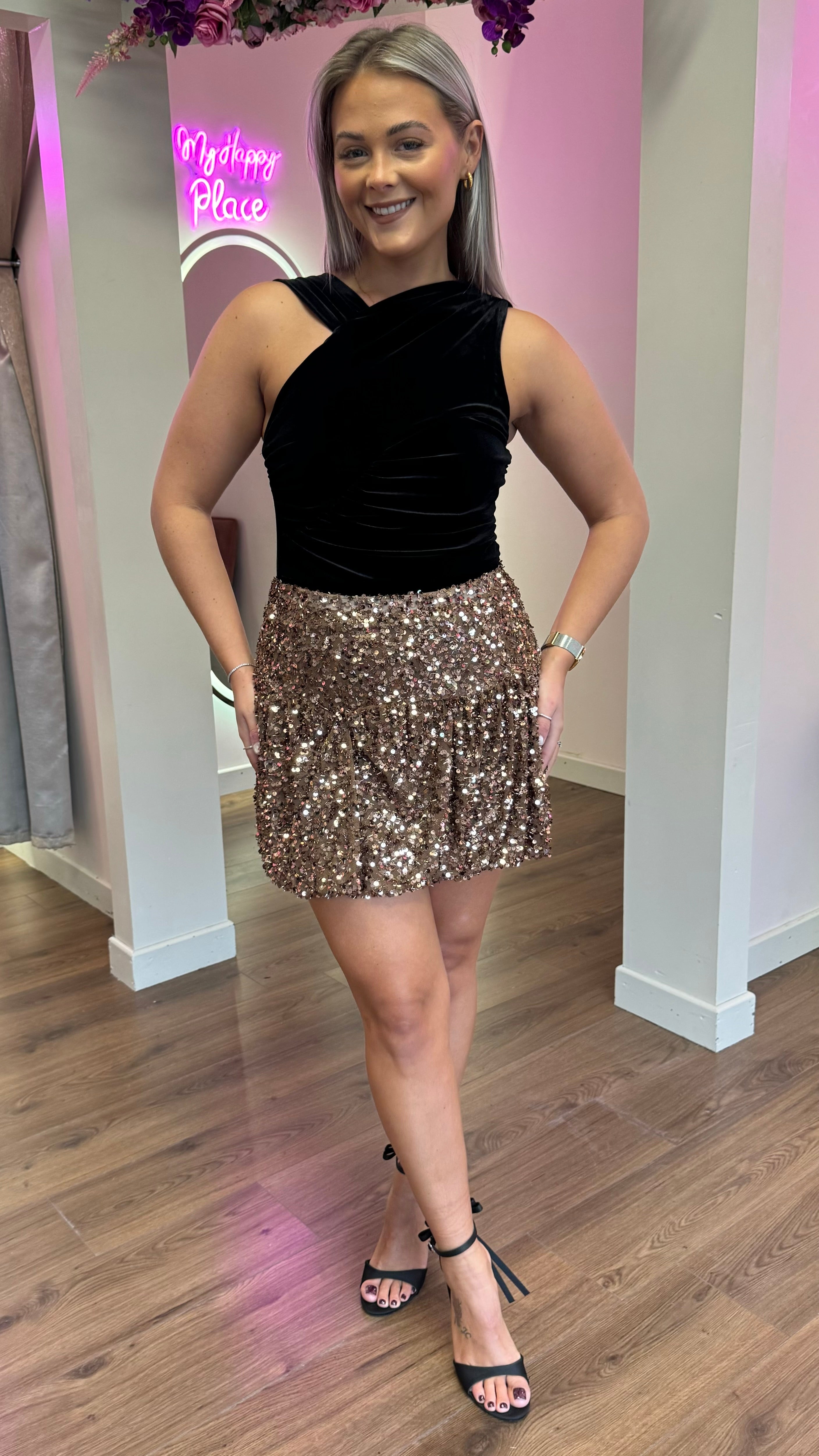 Shimmer and twirl in this show-stopping mini skirt! Covered in eye-catching sequins from top to bottom, it's guaranteed to catch the light—and all the compliments. The playful frill hem adds a flirty touch, while the elasticated waistband ensures a comfortable, secure fit all night long. Perfect for parties, nights out, or whenever you want to add some sparkle to your wardrobe.