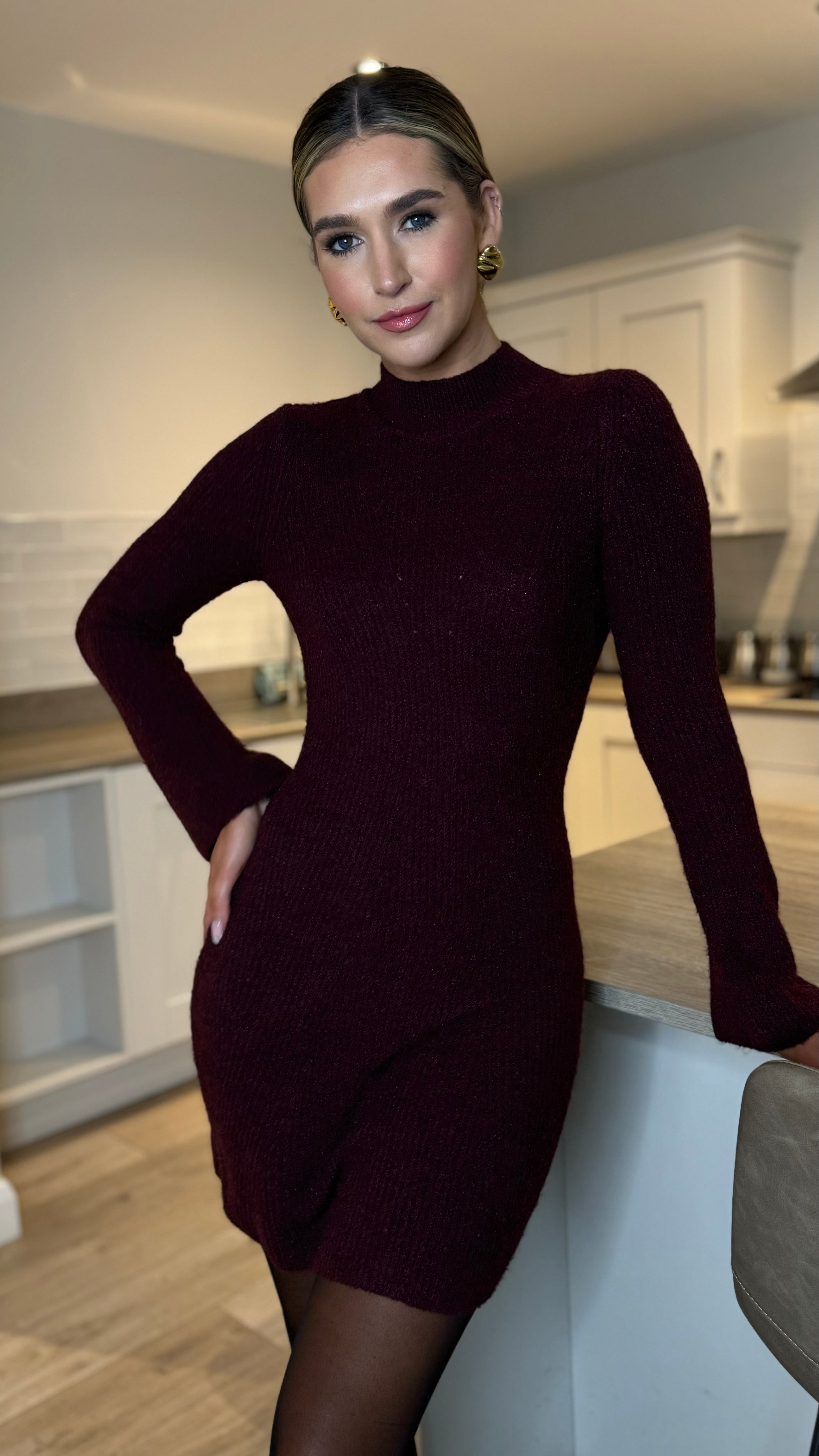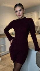 Introducing the Serenity —your new go-to for effortless elegance with a playful twist! This burgundy knitted mini dress features a chic high neckline and long sleeves that keep you warm and stylish. The standout frill detailing on the sleeves adds a flirty touch, while the soft, ribbed knit fabric wraps you in cosy comfort all day long. Perfect for layering over tights or pairing with your favourite boots, this dress transitions seamlessly from casual hangouts to evening plans. Snuggle into luxury without sacrificing style!