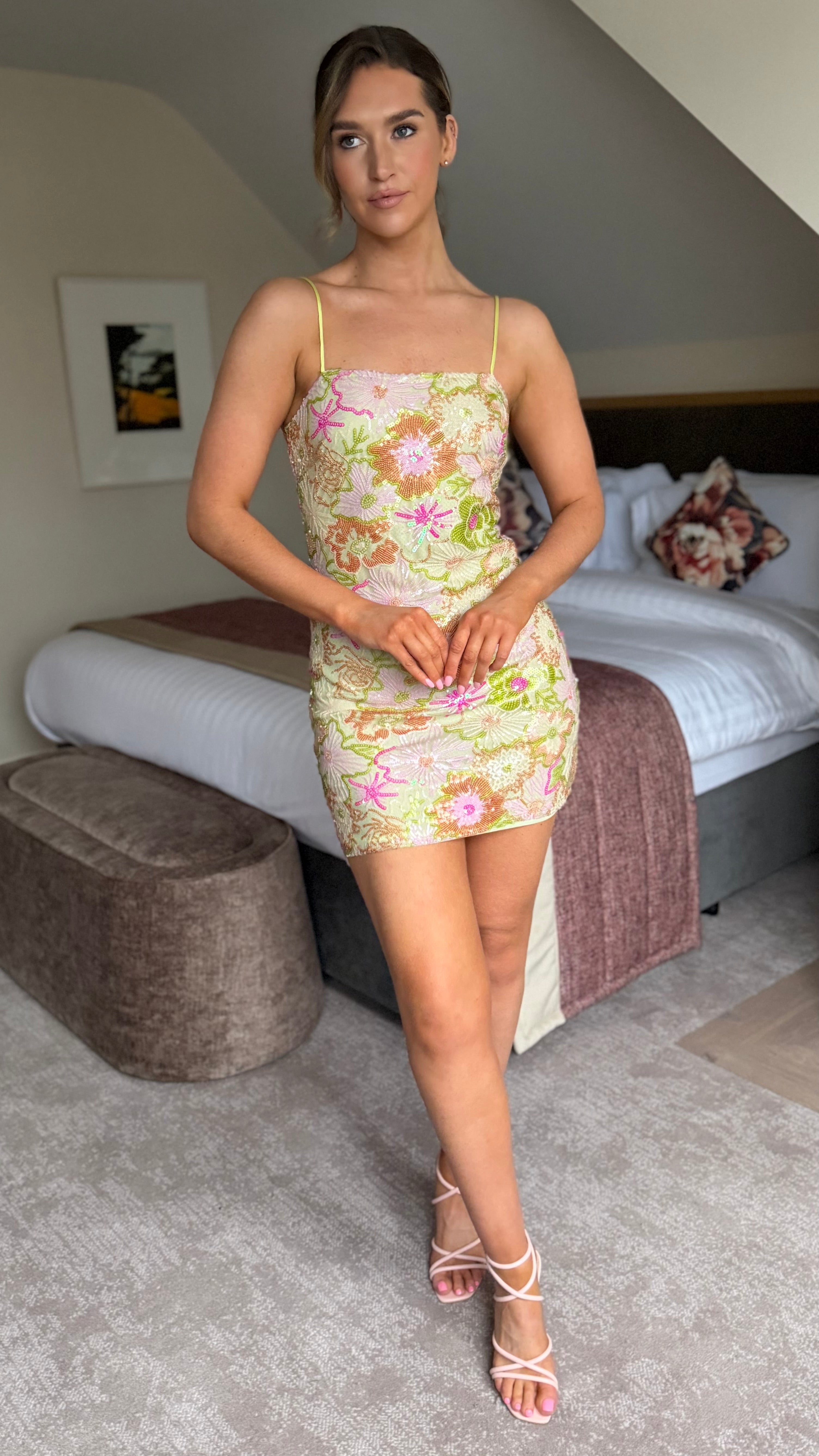 Delicate cami straps frame the shoulders of this enchanting mini dress, while intricate floral embellishments catch the light with every movement. The lined silhouette ensures comfort and confidence, offering a polished finish that transitions seamlessly from day to evening. Perfect for those seeking a touch of botanical elegance with a hint of sparkle.