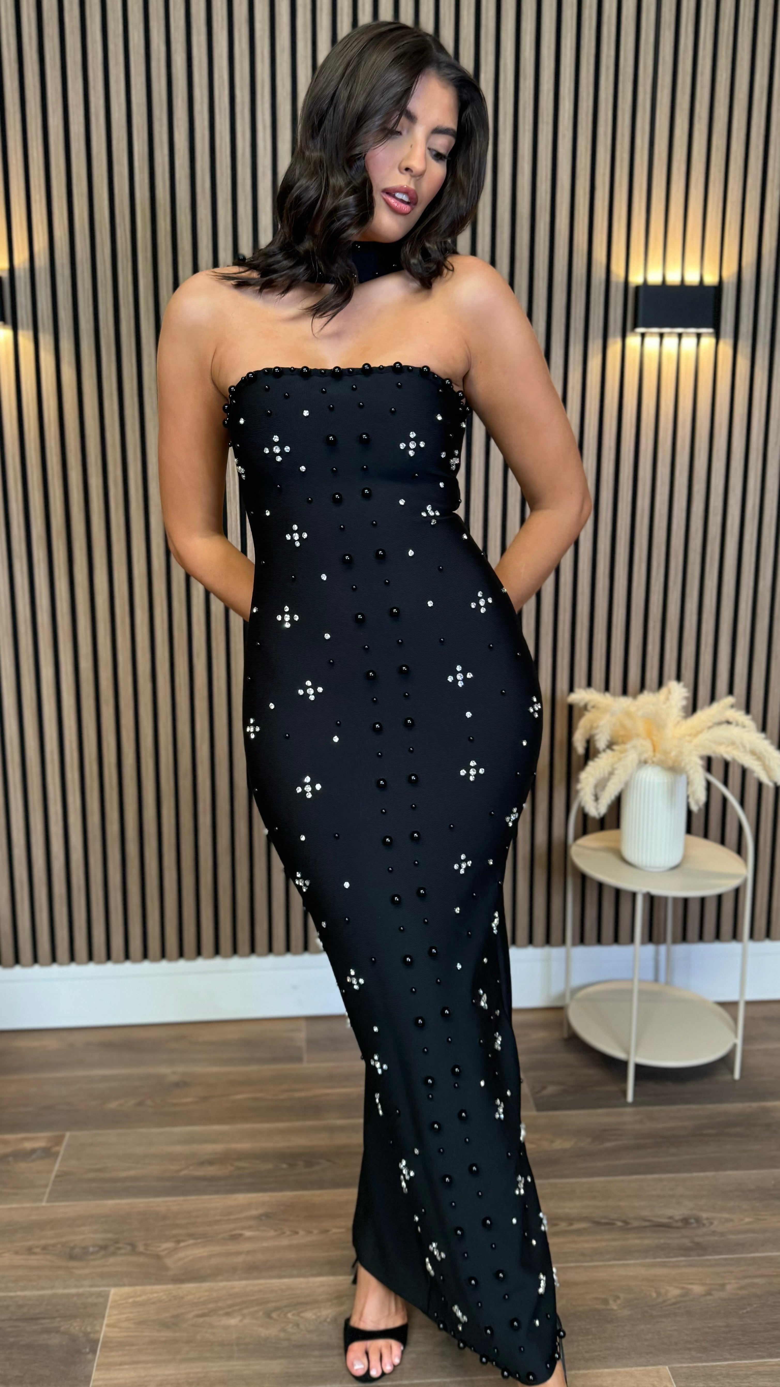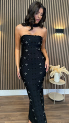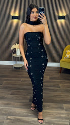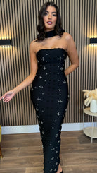 Turn heads in the Hailee Black Embellished Collar Detail Midi Dress—a show-stopping piece that's equal parts elegant and edgy. The dramatic faux scarf collar frames your face beautifully, while intricate embellishments scattered across the fabric catch the light with every move. A chic bandeau silhouette keeps things sleek, supported by adjustable back straps for the perfect fit. Hidden zip fastening and a subtle back slit add practical sophistication to this statement midi. Perfect for nights when you want to look absolutely unforgettable.