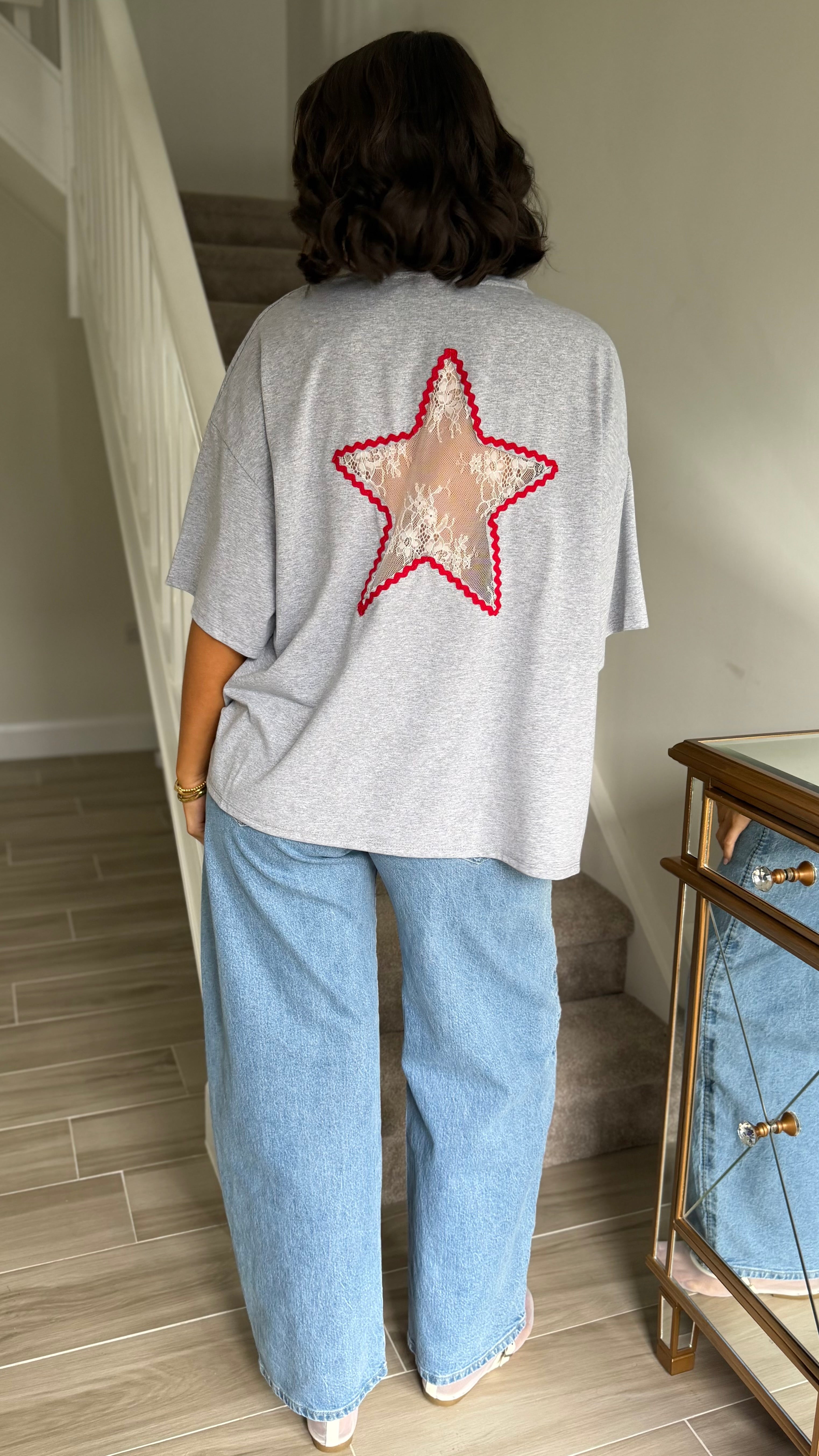 Effortless style meets eye-catching detail with this oversized tee. Crafted in a relaxed fit with dropped sleeves for that coveted laid-back silhouette, it features a striking red star stitch design on the back, beautifully layered with delicate lace for added texture and dimension. The classic round neckline keeps it versatile, making it perfect for casual everyday wear or dressed up with your favourite pieces.