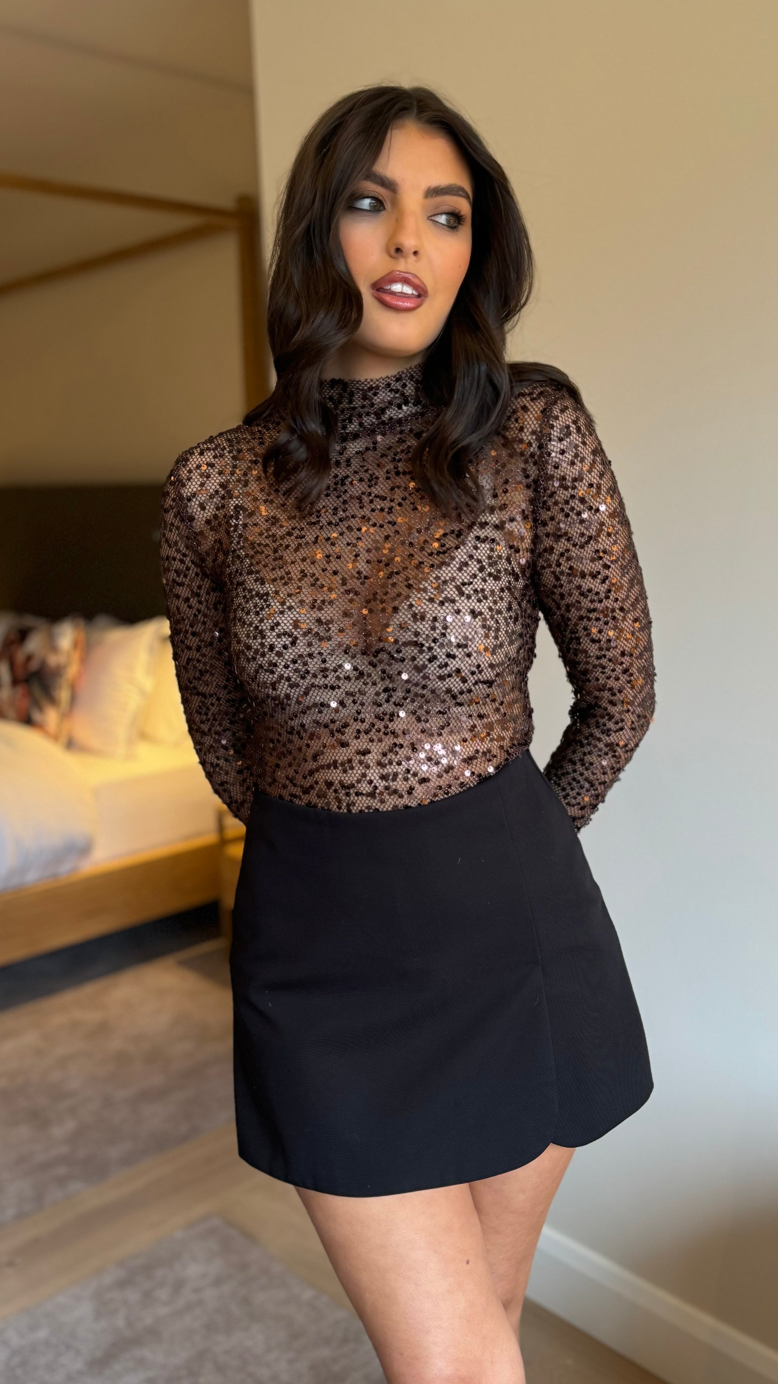 Jacey Brown Sequin Mesh Long Sleeve Top