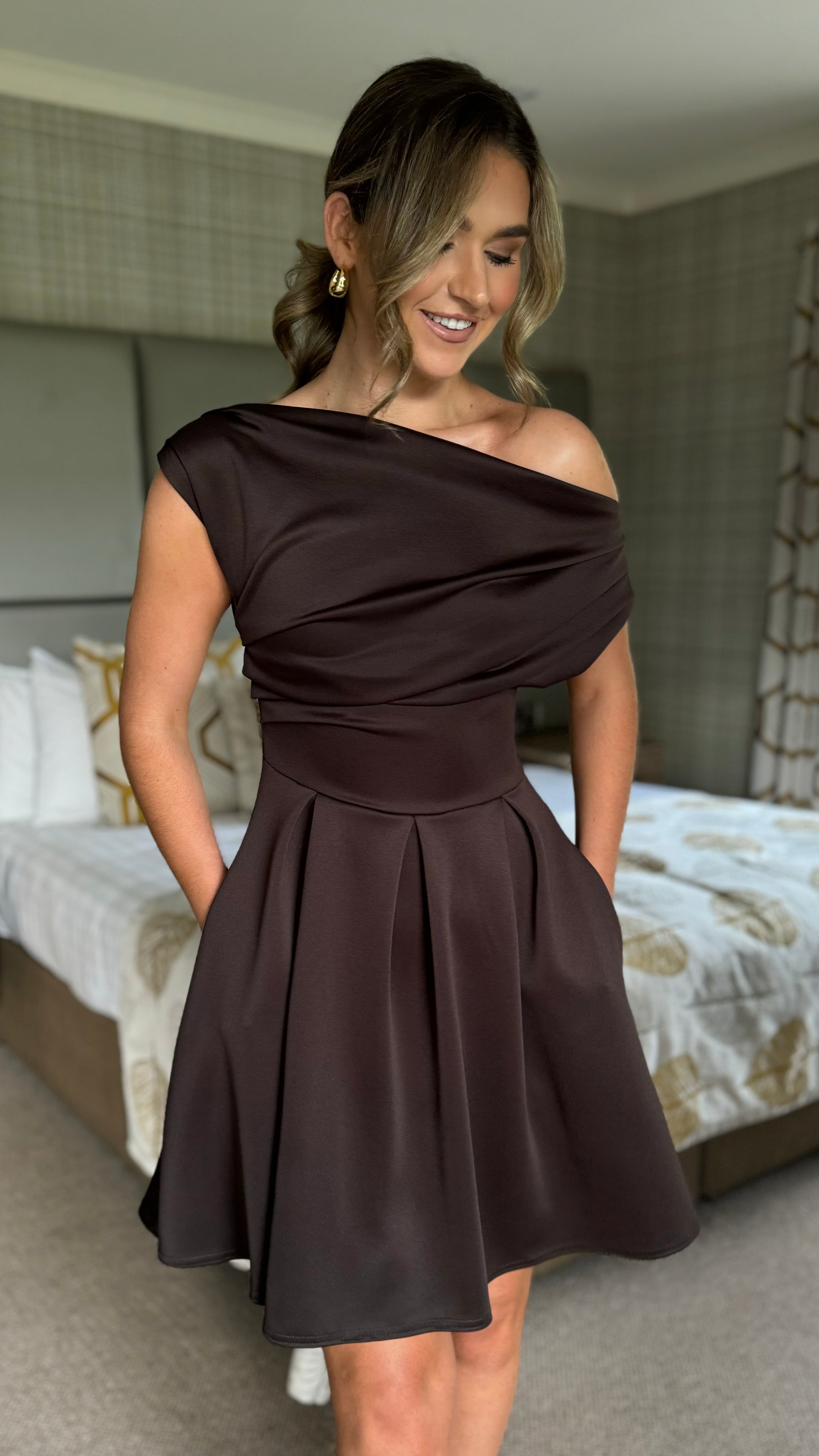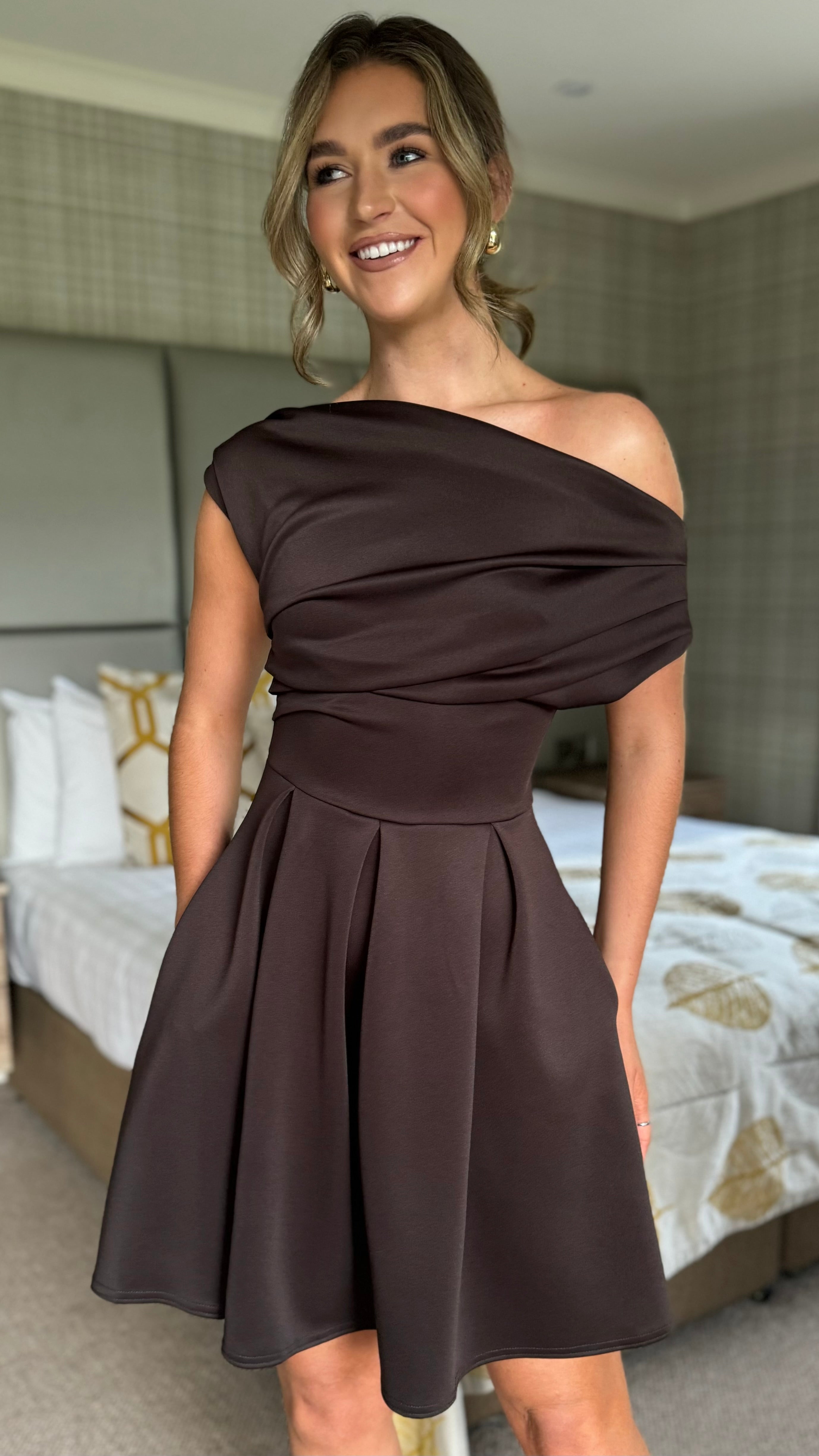 Elevate your everyday style with the Lilianna Brown Asymmetric Neckline Mini Dress—a playful piece that's as practical as it is chic. This dress features a flattering asymmetric neckline that adds instant edge, paired with a fun skater-style skirt for effortless movement. Hidden pockets keep your essentials close, while a concealed side zip ensures a seamless silhouette.