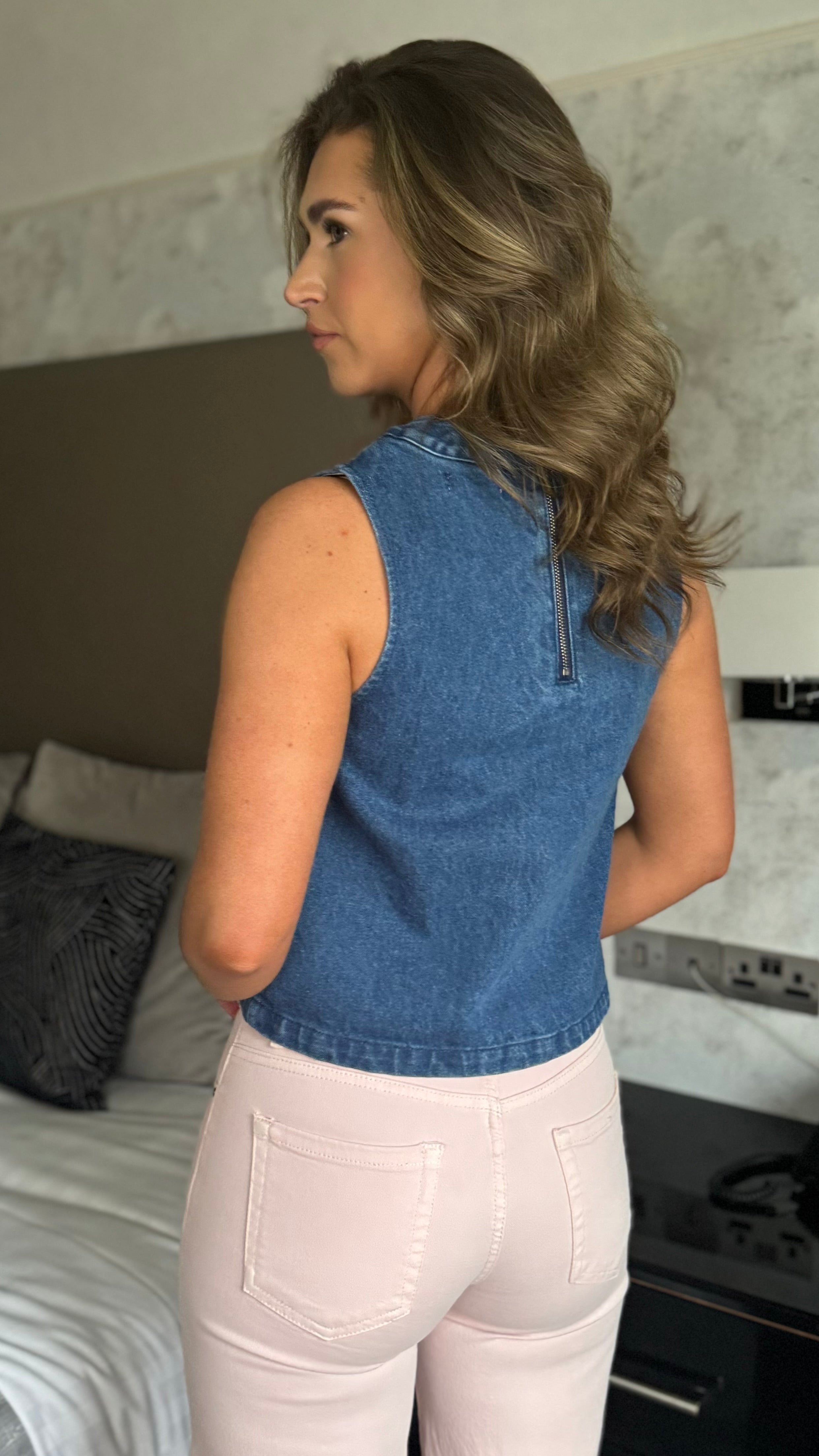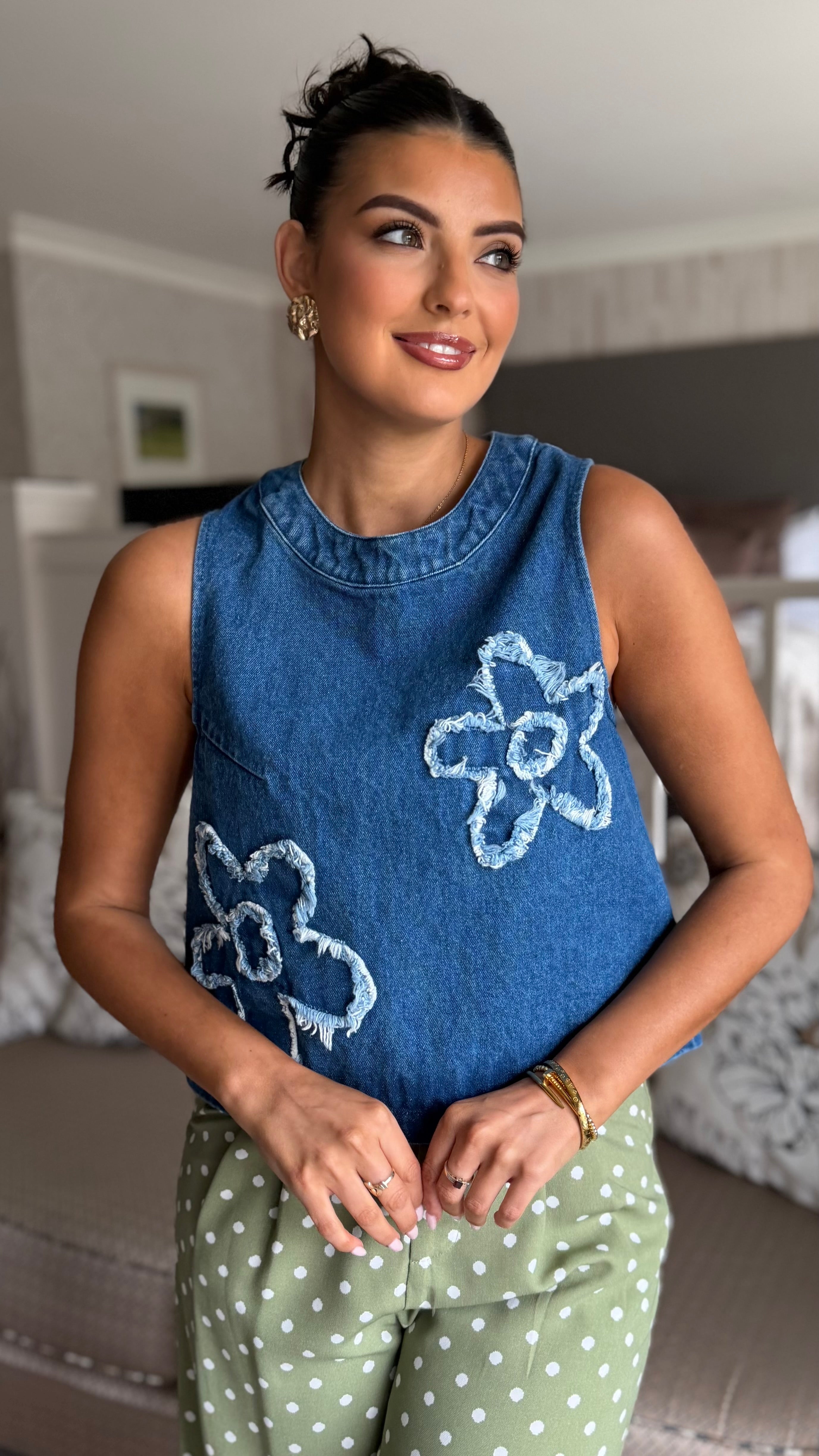 Sleek denim top with delicate flower embroidery across the chest. Round neckline and sleeveless cut offer a modern, versatile silhouette perfect for layering or wearing solo. Functional metal zip at the back adds an unexpected design detail and easy on-off convenience. Structured denim fabric holds its shape beautifully, making this a wardrobe essential for contemporary styling.