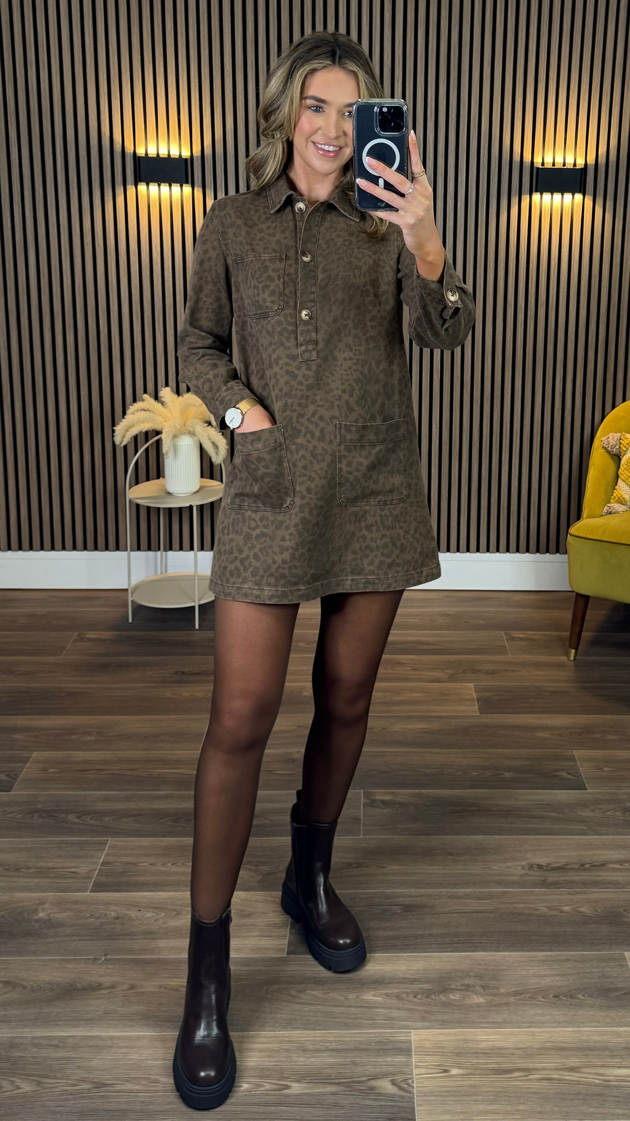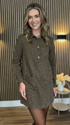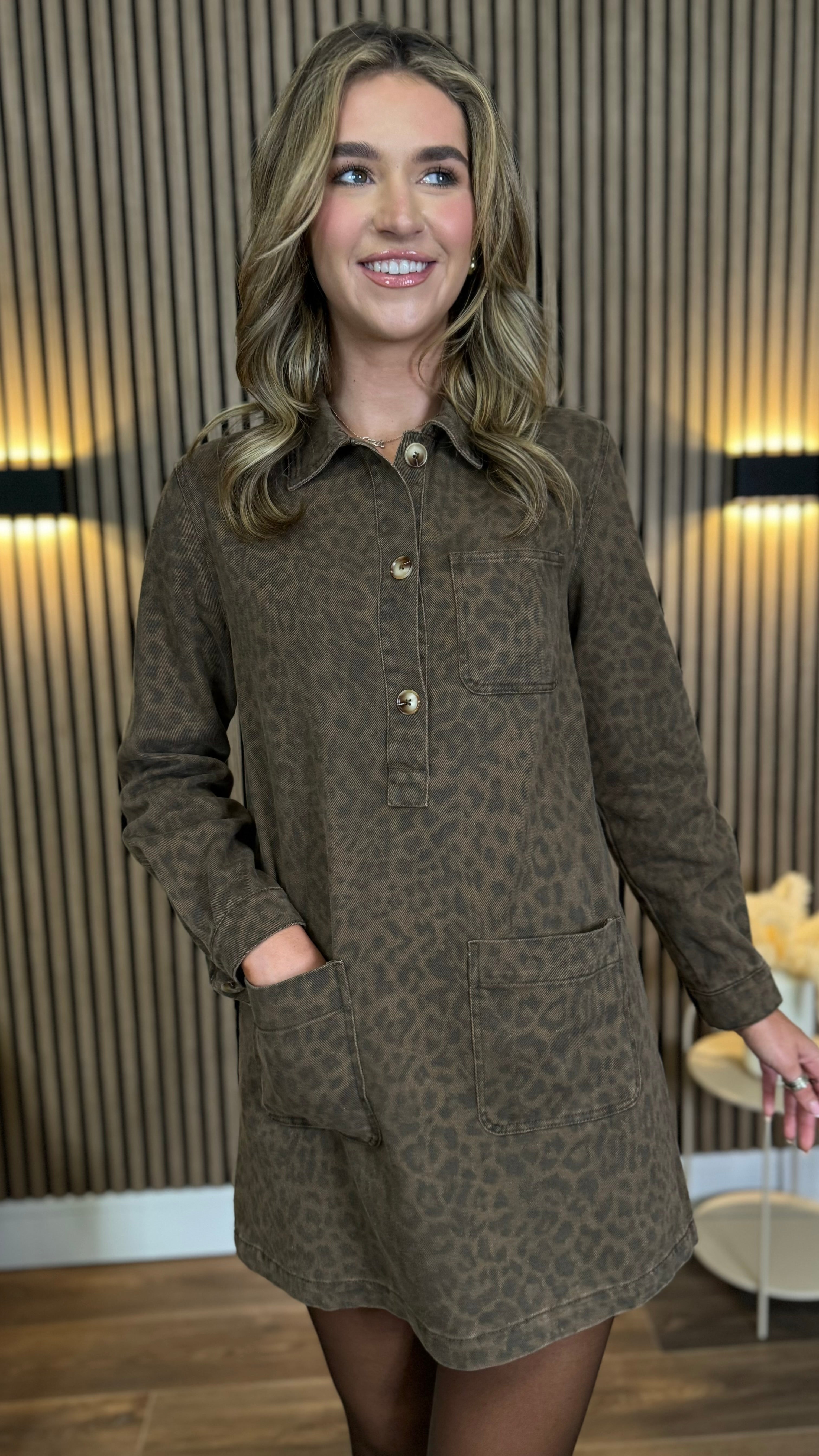 This playful Martha Leopard Denim Utility Style Mini Dress brings fun to your wardrobe with its standout collar detail and stylish button accents. Featuring long sleeves with button cuffs and handy functional pockets, it combines practicality with chic. The mini length adds a flirty edge, perfect for turning heads wherever you go.