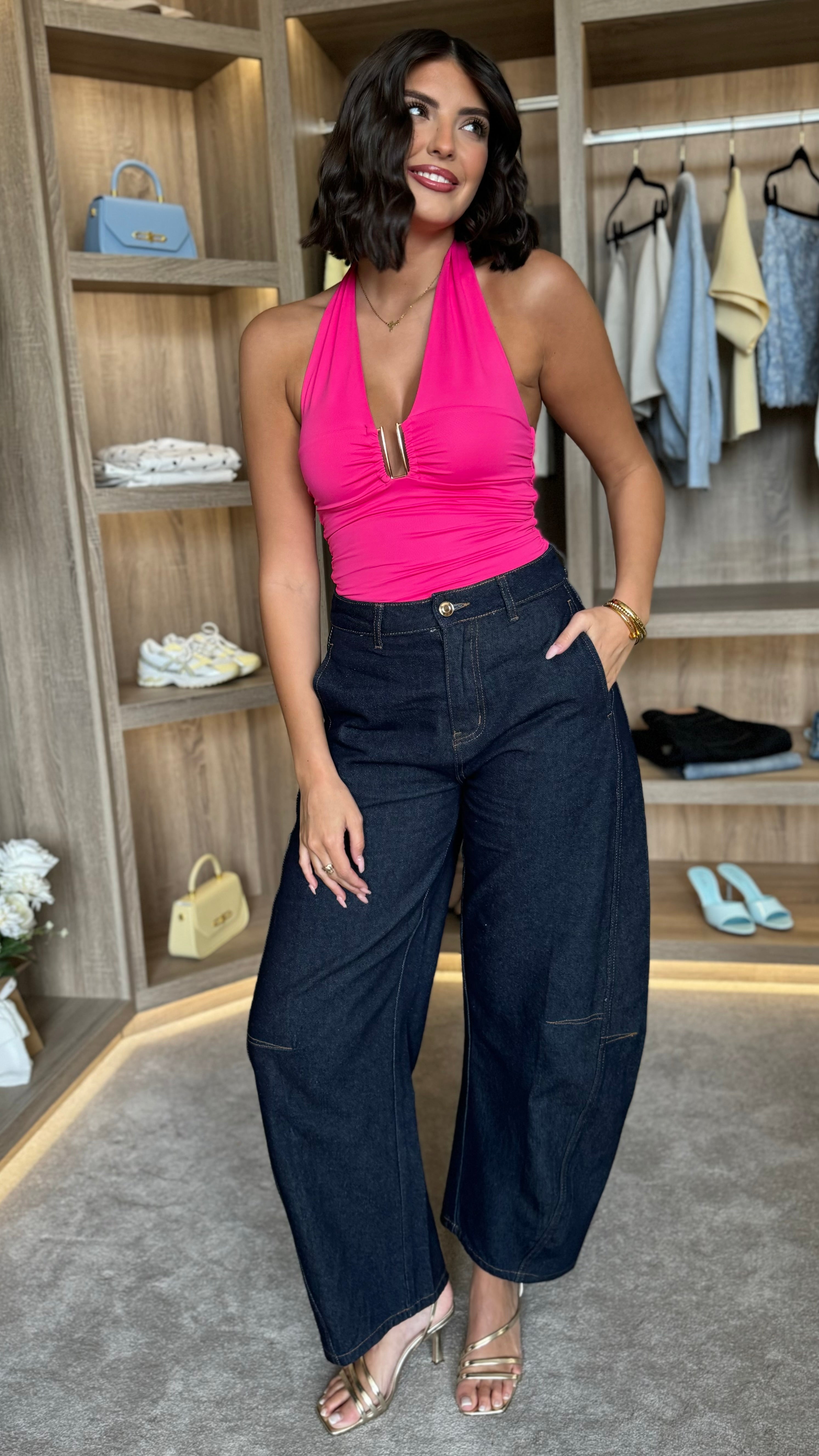 Striking halterneck top with a daring plunge neckline and a distinctive gold bar detail at the bust. Ties securely at the back of the neck for a flattering, adjustable fit. The leopard print adds edge and versatility to your wardrobe, pairing effortlessly with tailored trousers, skirts, or layered under sheer pieces. A contemporary essential for confident styling.
