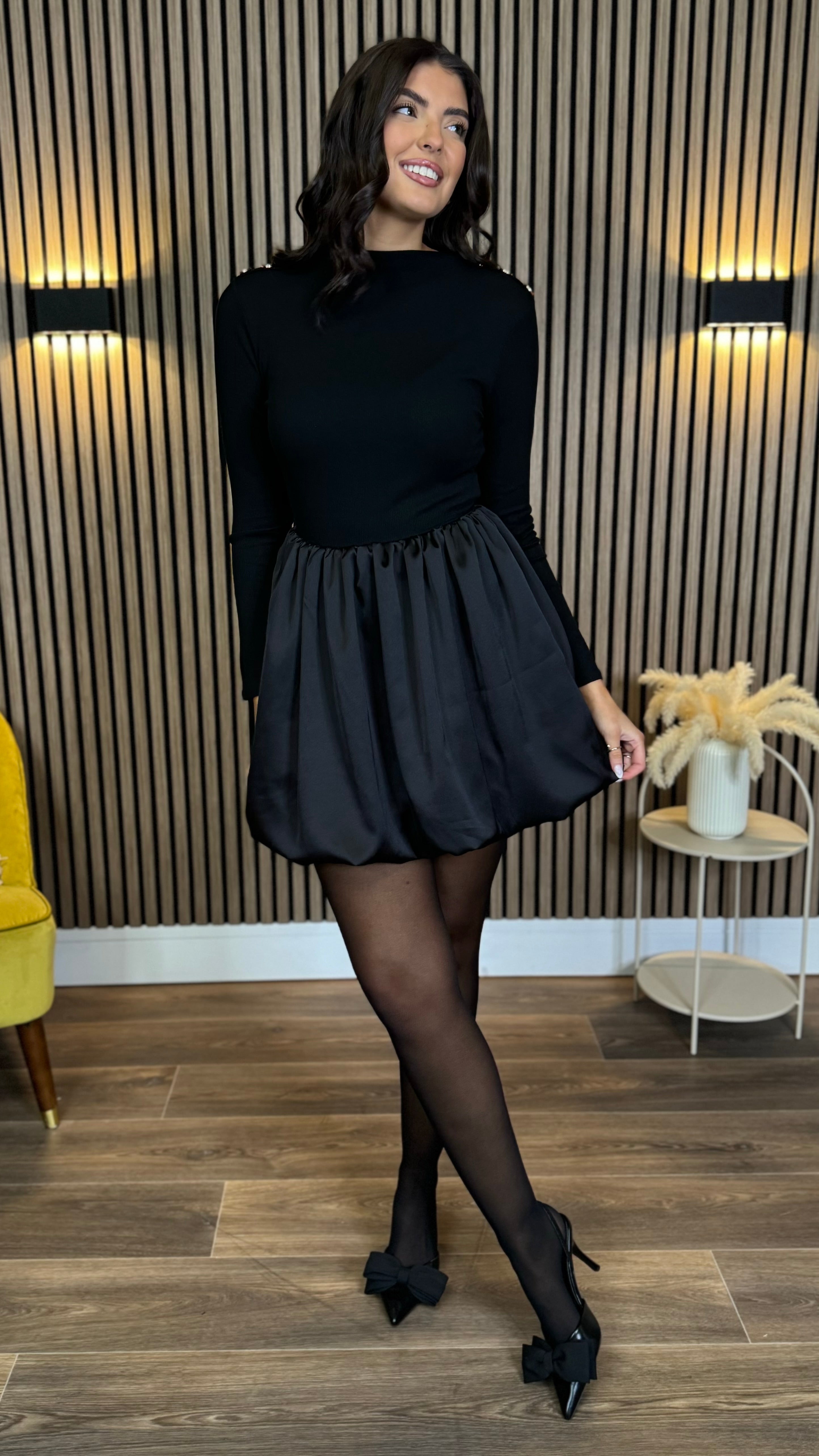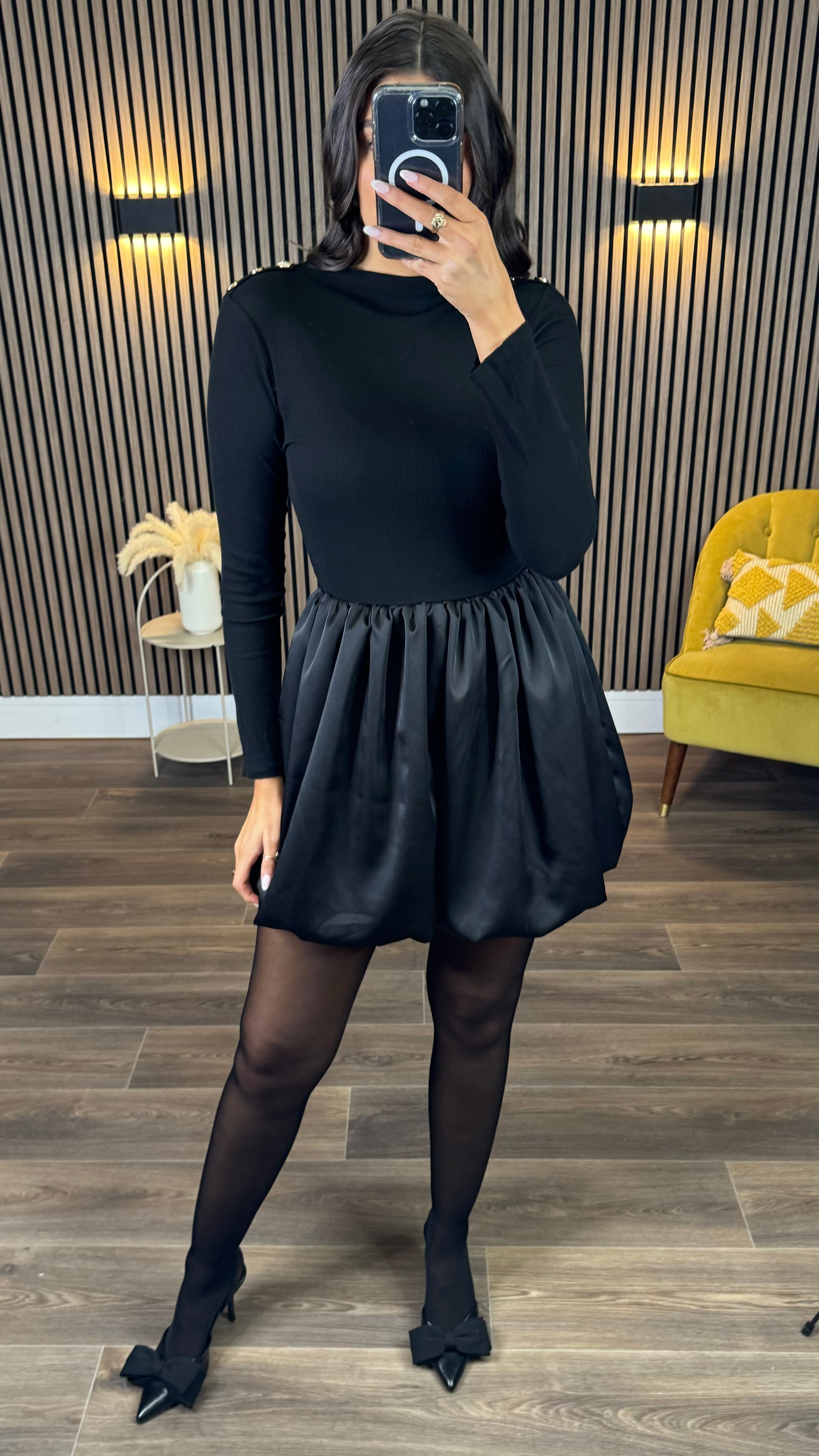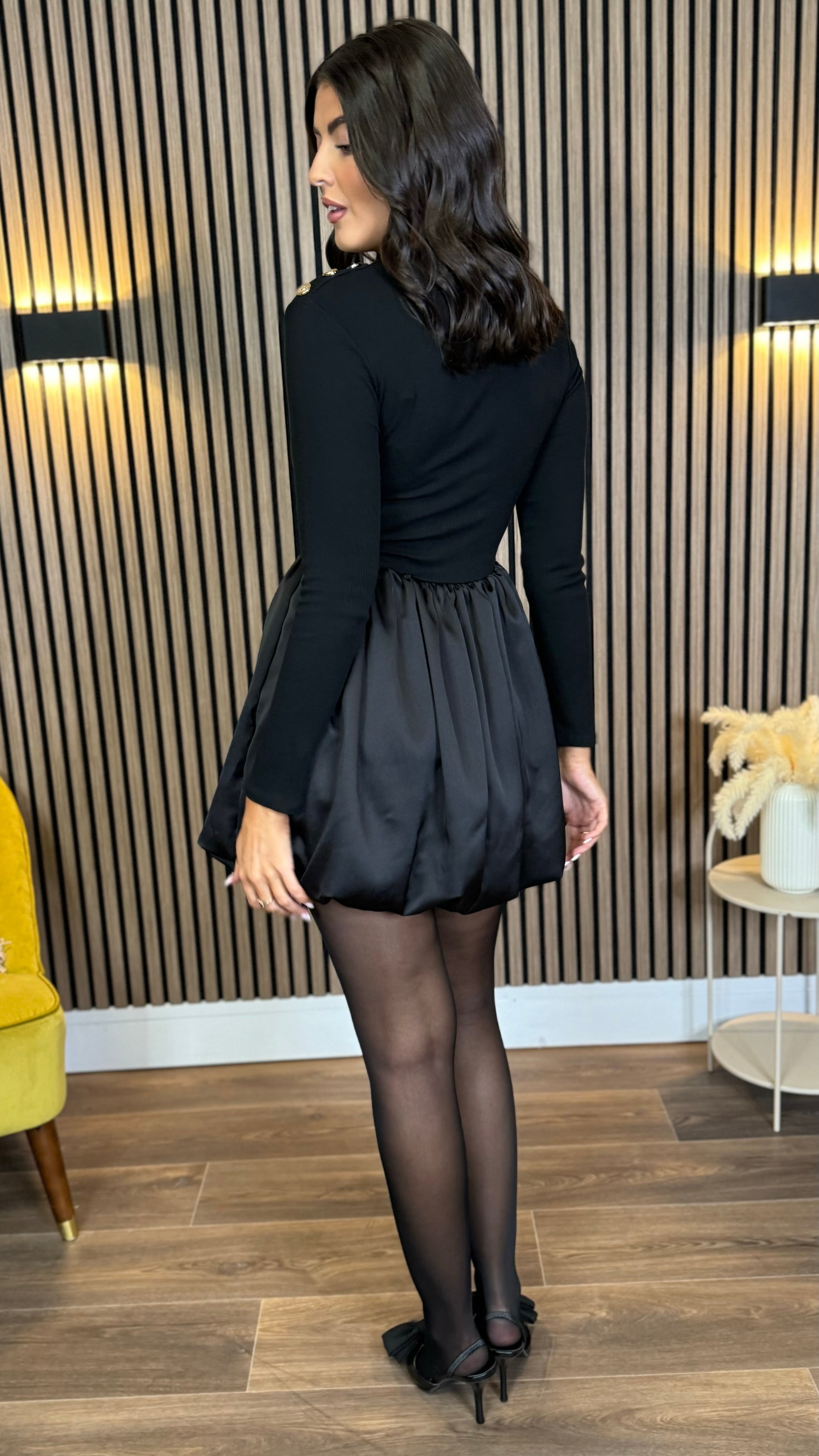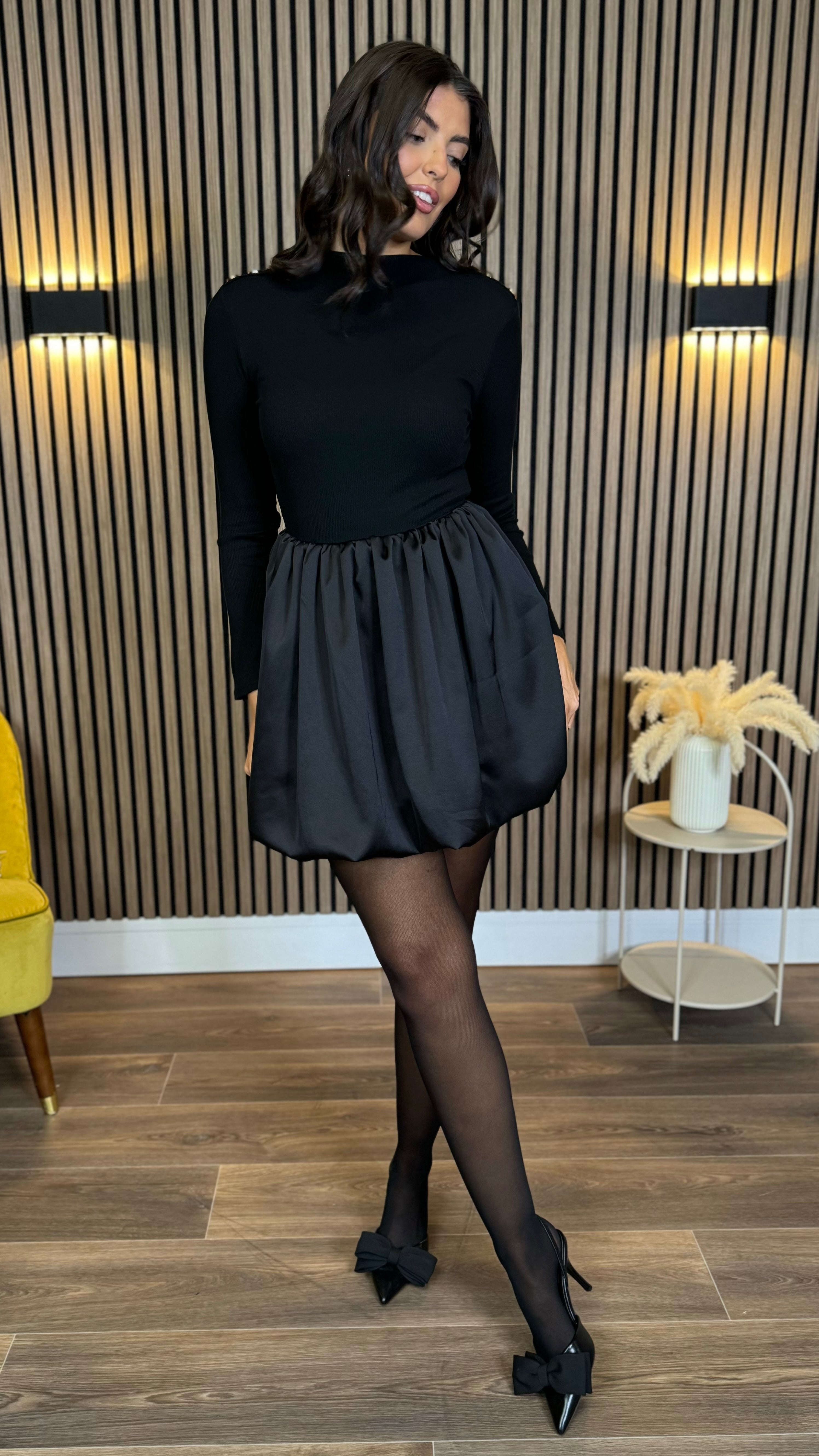 Sara Black Ribbed Long Sleeve With Satin Skirt Mini Dress ✨ Elevate your evening look with this dreamy dress! 🖤 Featuring a fitted ribbed long sleeve top that hugs in all the right places, paired with a luxuriously silky satin skirt. The romantic button design adds a touch of vintage charm, while the mini length keeps things modern and flirty. 💃 Perfect for date nights, parties, or whenever you want to feel effortlessly chic. This satin blend beauty is your new go-to for turning heads and feeling fabulous! 🌹
