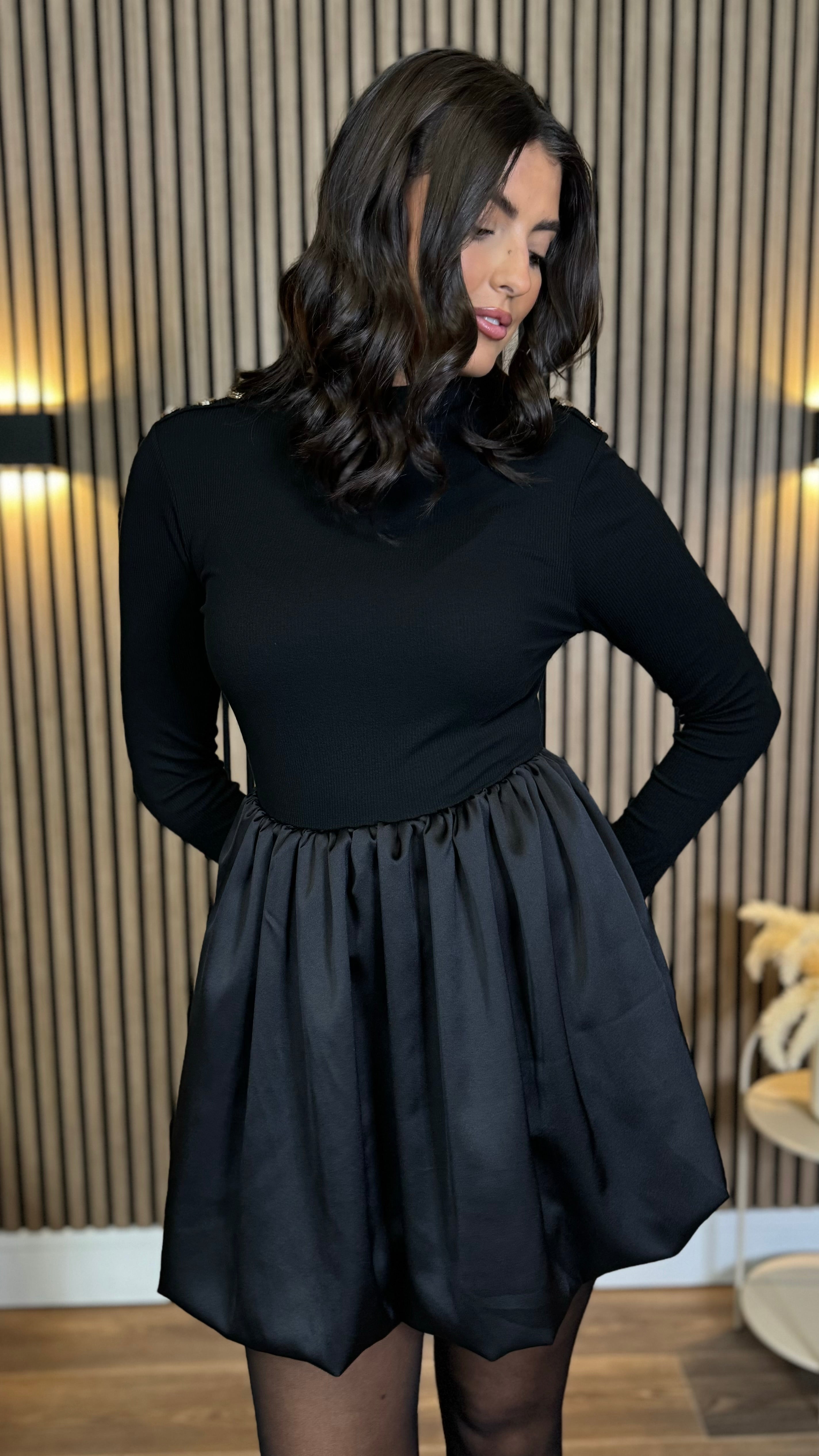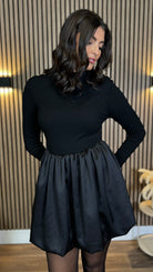 Sara Black Ribbed Long Sleeve With Satin Skirt Mini Dress