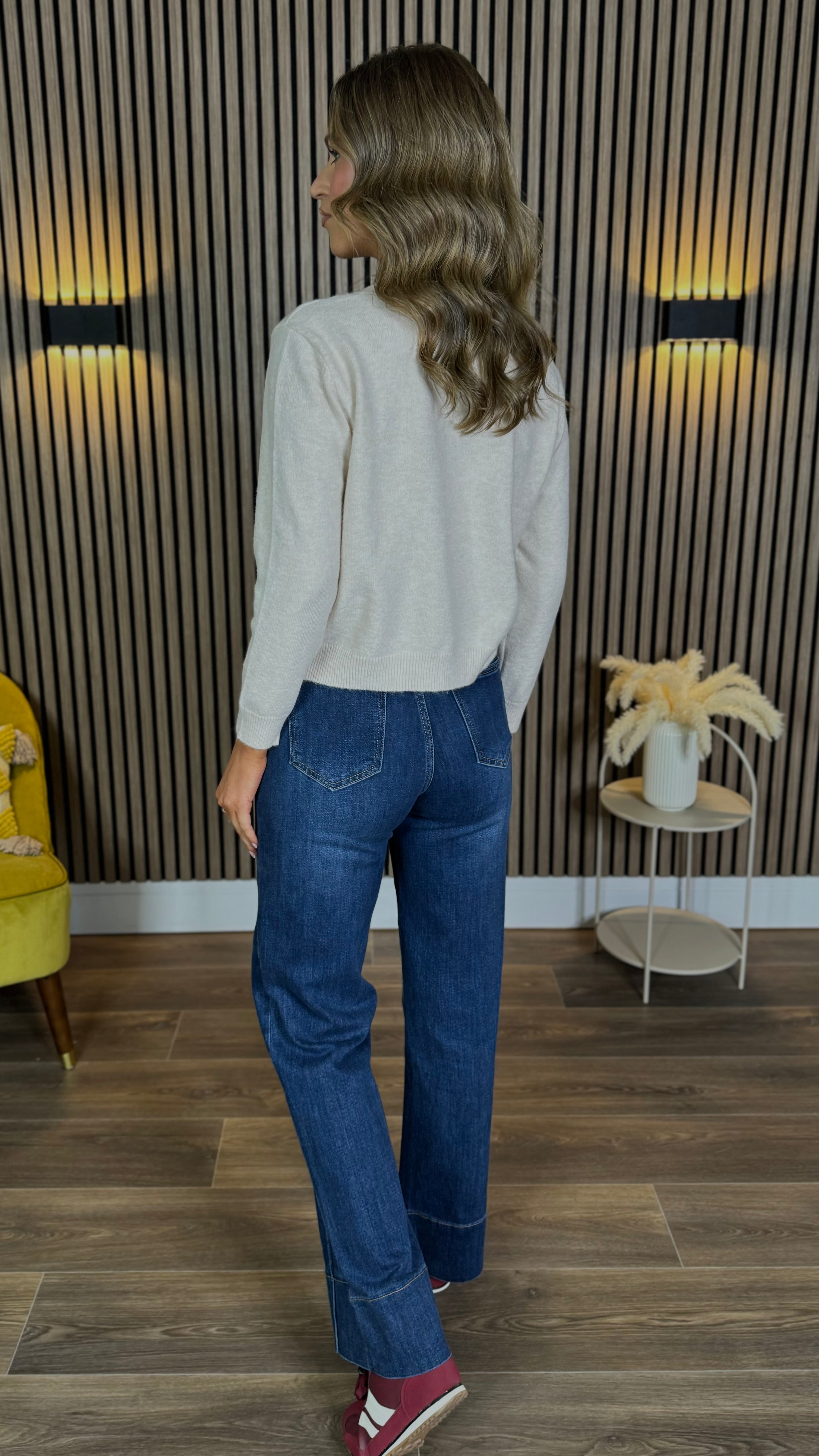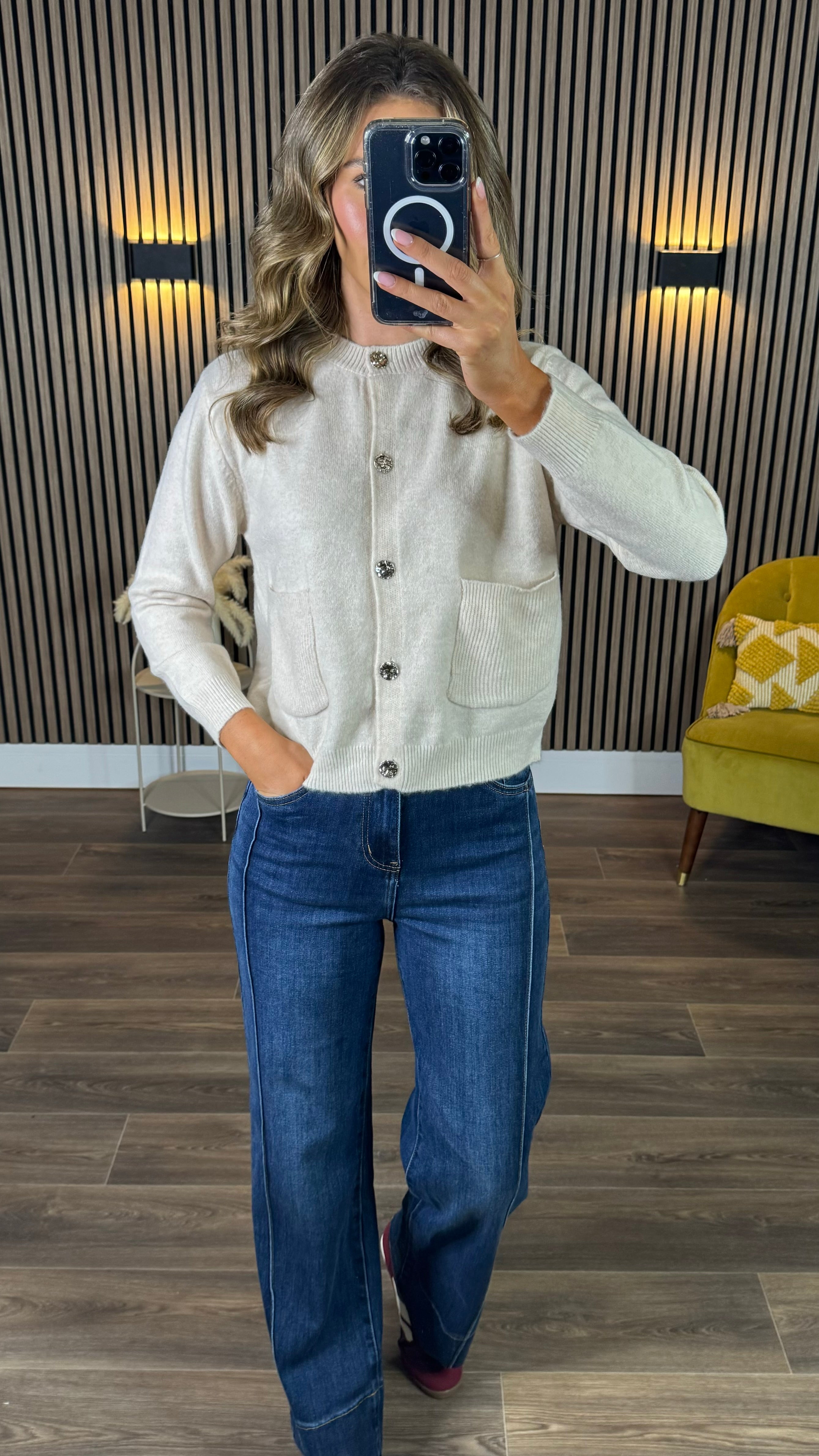 Wrap yourself in cozy charm with the Stormi Beige Soft Knit Cardigan. Its soft, fluffy fabric feels like a gentle hug, while sparkling jewel buttons add a touch of sparkle to your day. The round neckline and ribbed hem and cuffs complete the playful yet polished look, making it perfect for layering anytime you want to stay comfy and cute.