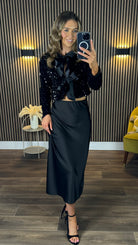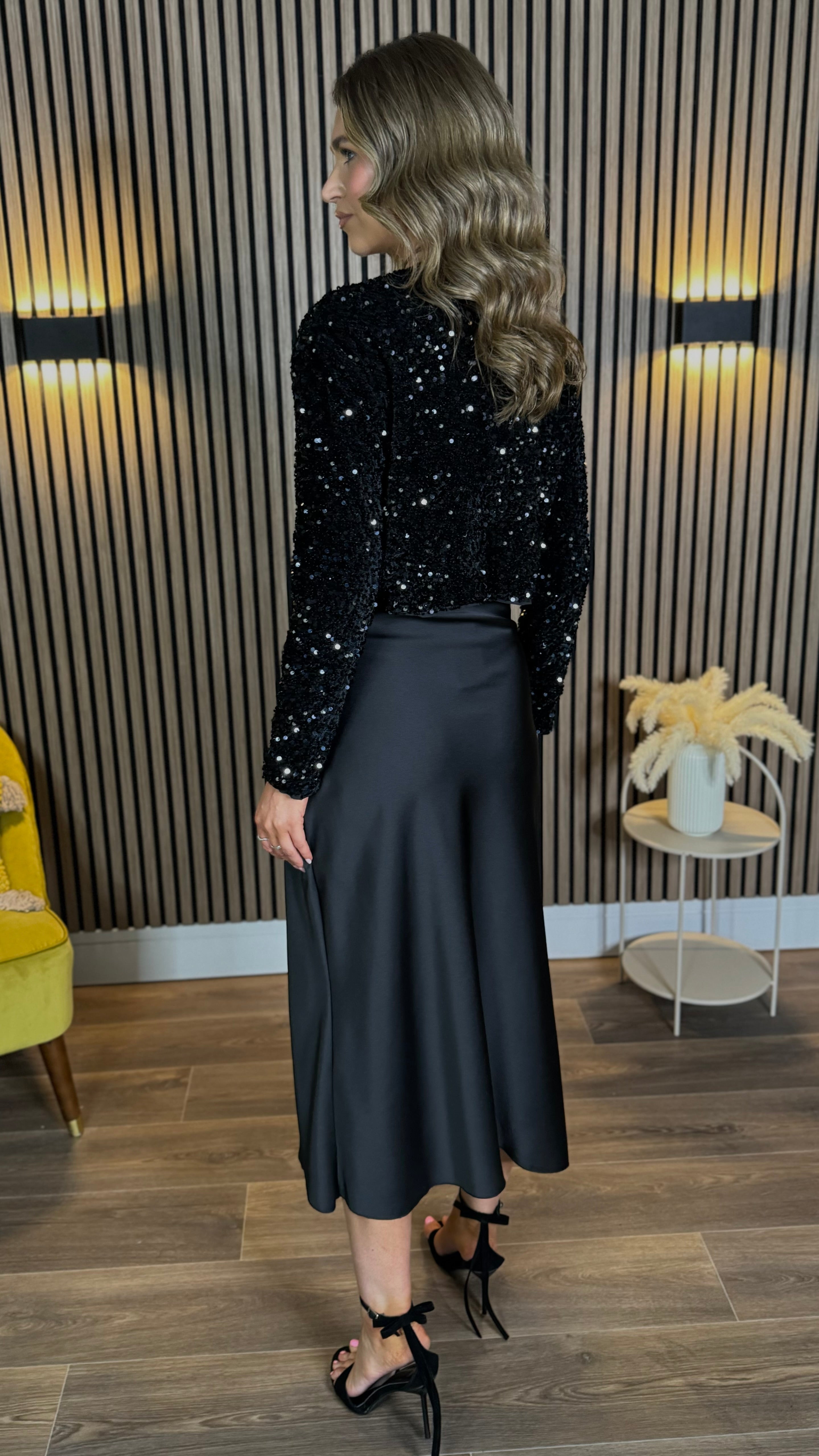 Sparkle and shine with the Tahlia Black Sequin Top! This playful top features an open sequin design and a unique bow detail closure. Its slight crop length adds a fun twist to any outfit. Get ready to turn heads and make a statement with this quirky and stylish top! ✨🎀