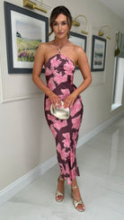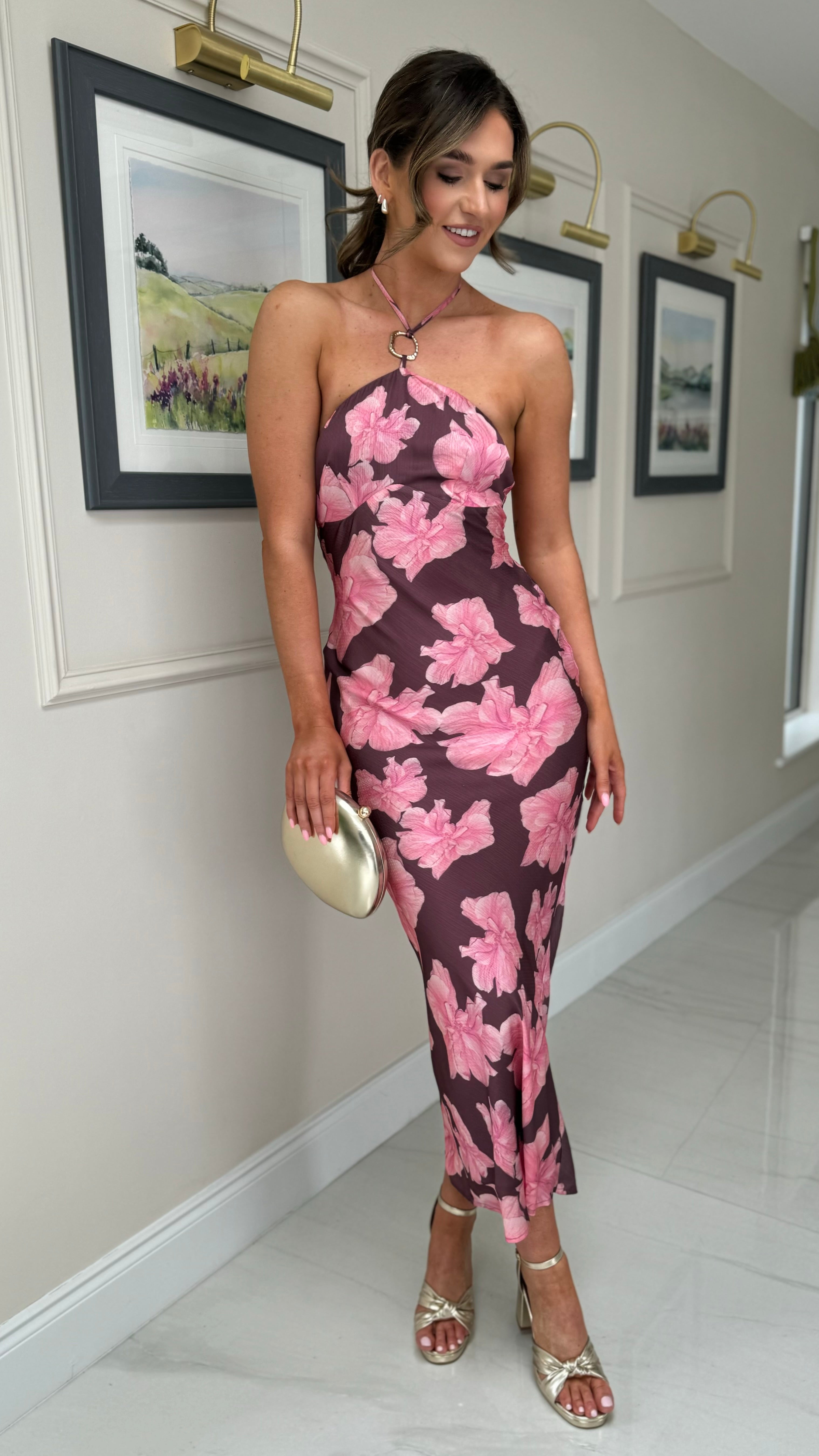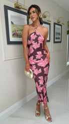 Elevate your evening look with this striking satin maxi dress, featuring a flattering halter neck design that ties securely at the back. The silver irregular shape print adds contemporary visual interest, while the concealed back zip ensures a seamless, polished silhouette. Perfect for occasions where you want to make a refined statement without compromising on comfort or ease of wear.