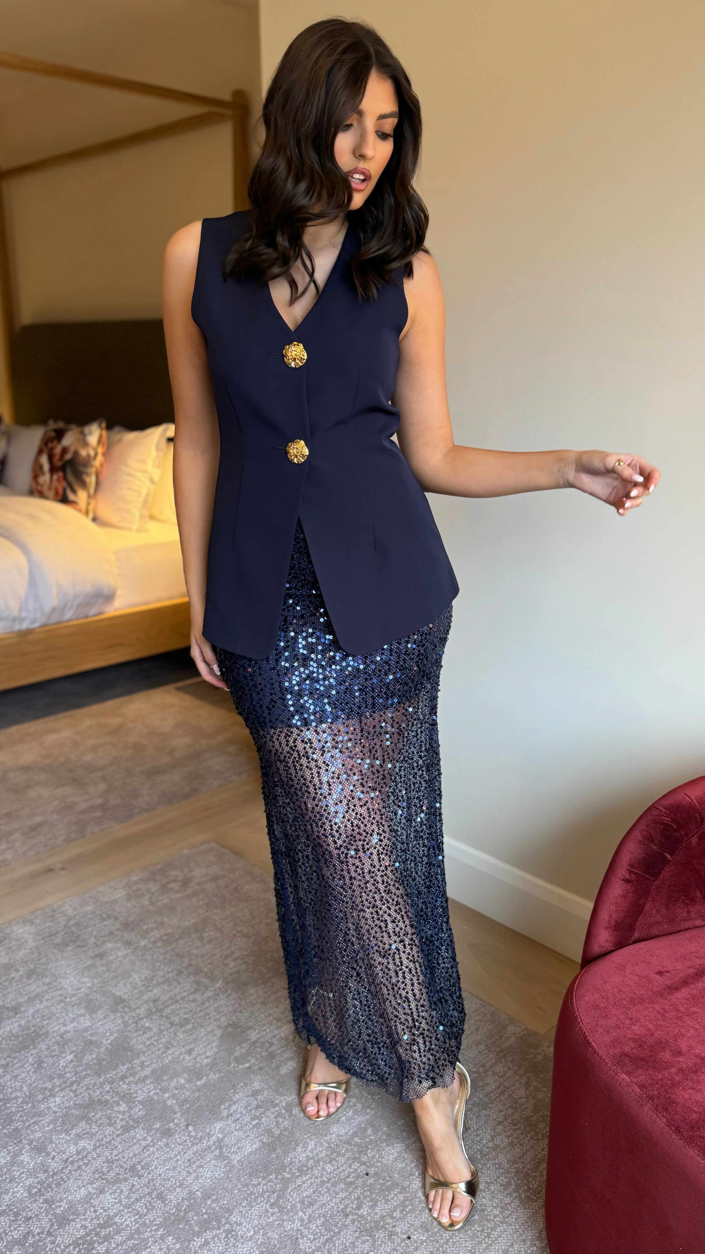 Zena Navy Sequin Midi Skirt Shimmer and shine in this show-stopping sequin midi skirt! Crafted with all-over sequins that catch the light with every move, this navy beauty features a comfortable elasticated waistband for easy wear. The mesh construction keeps things breathable, while the soft lining extends to mid-thigh for a flattering fit and added comfort. Perfect for parties, nights out, or whenever you want to sparkle.