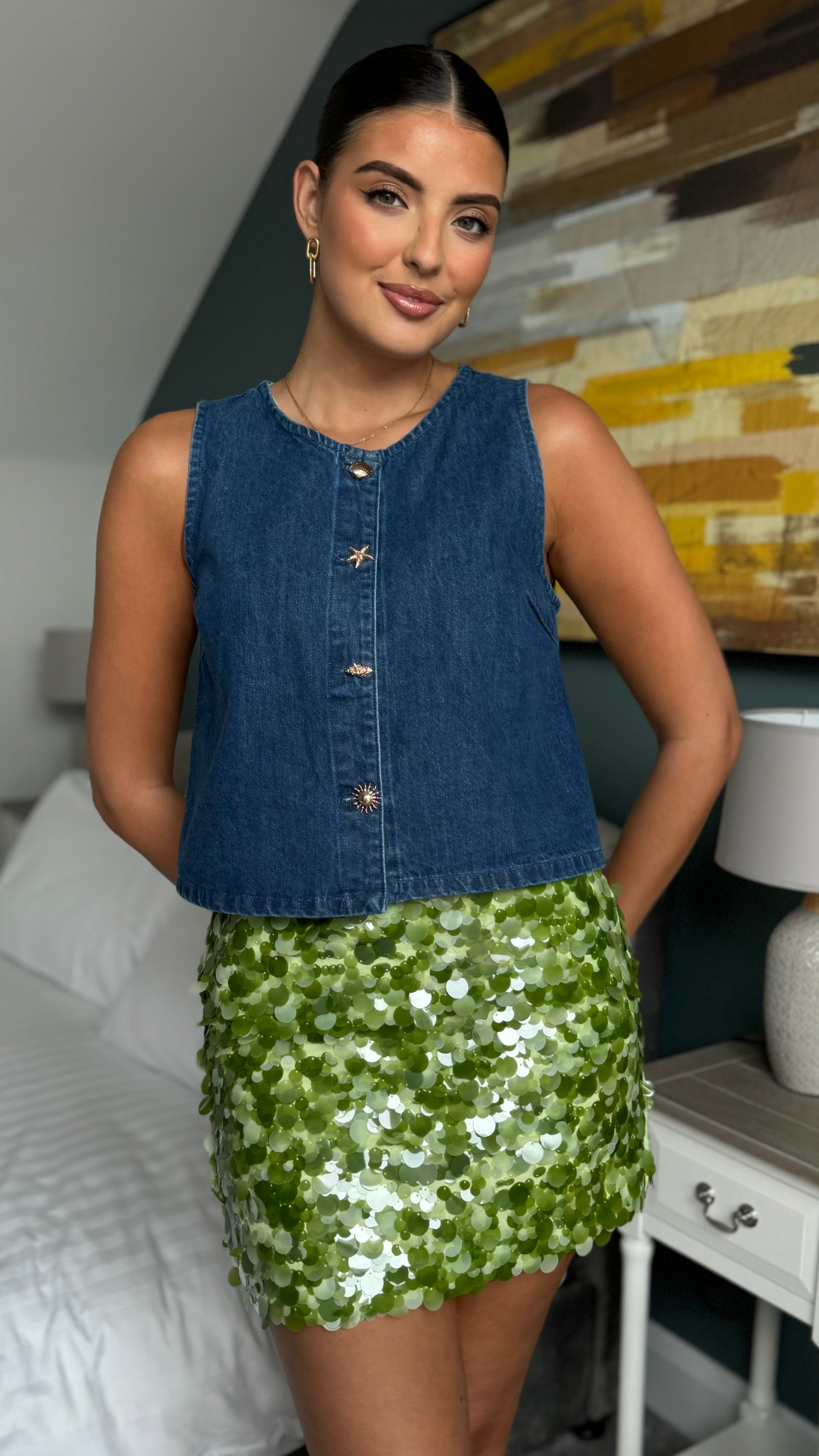 Elevate your evening look with this stunning Shelby Green Sequin Mini Skirt. Crafted with a flattering high waistline that defines your silhouette, this piece features all-over sequin detailing for maximum sparkle and impact. The mini length creates a playful, contemporary vibe perfect for nights out, while the concealed zip fastening ensures a seamless, polished finish. Fully lined for comfort and confidence, this skirt transitions effortlessly from party to special occasion.