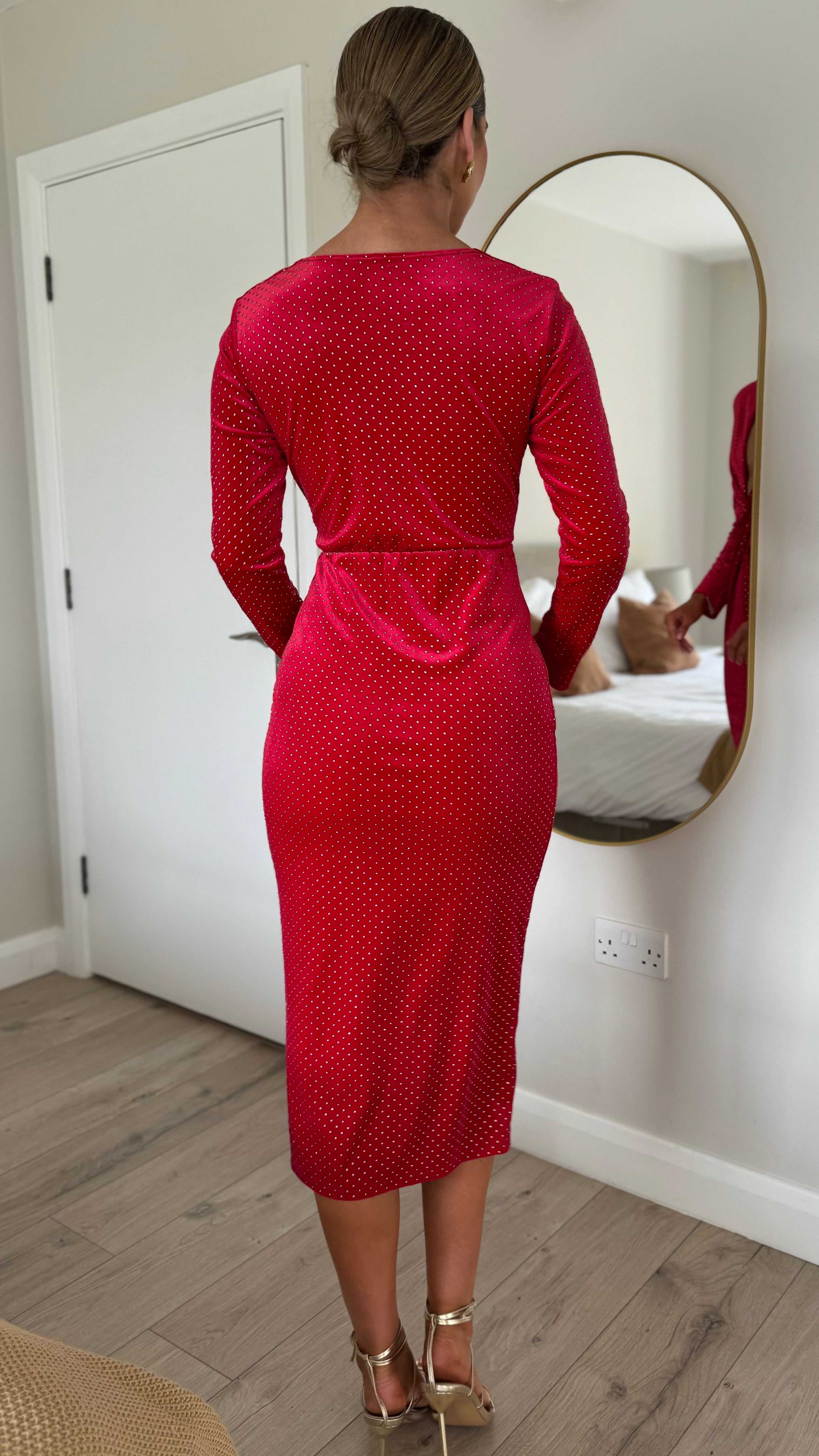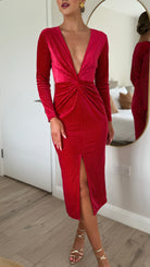 Look dazzlingly glamorous in this stunning Anakin Red Velvet Diamante Midi Dress! Featuring a front split, a tantalizing V neckline, and a knot detail waist, this dress will have you looking so 🔥🔥🔥 that you won't want to take it off! Get ready for the night of your life!