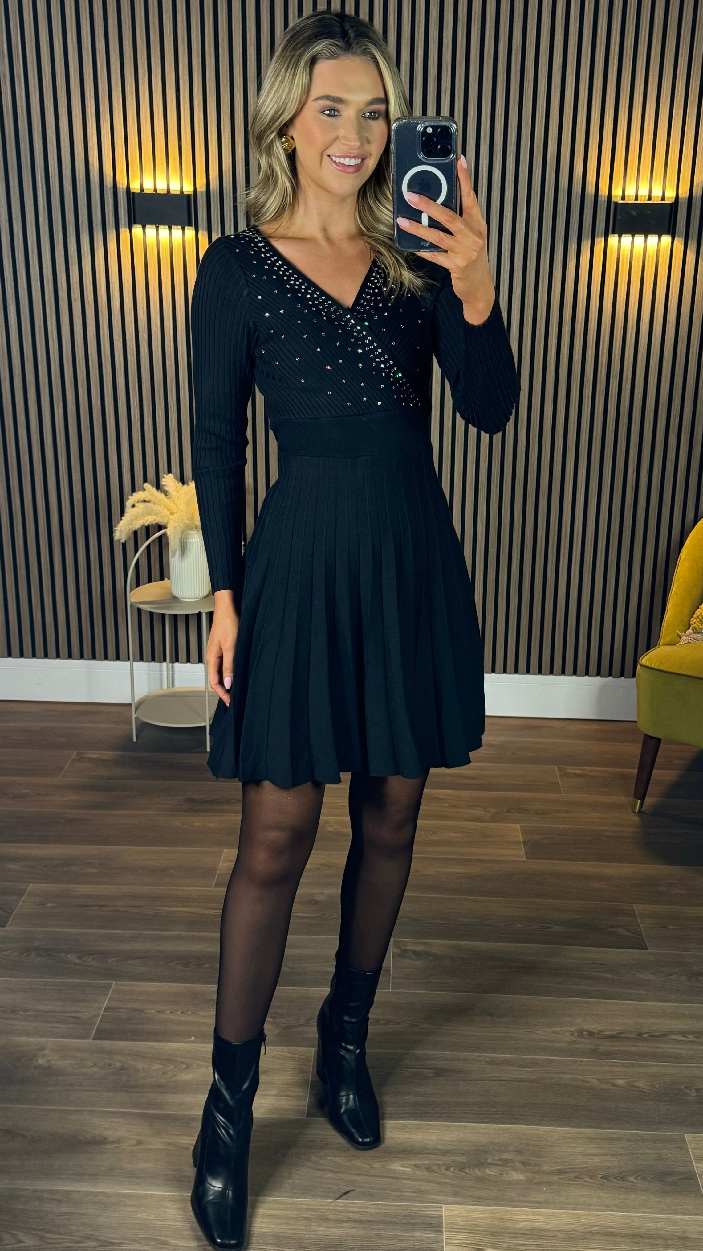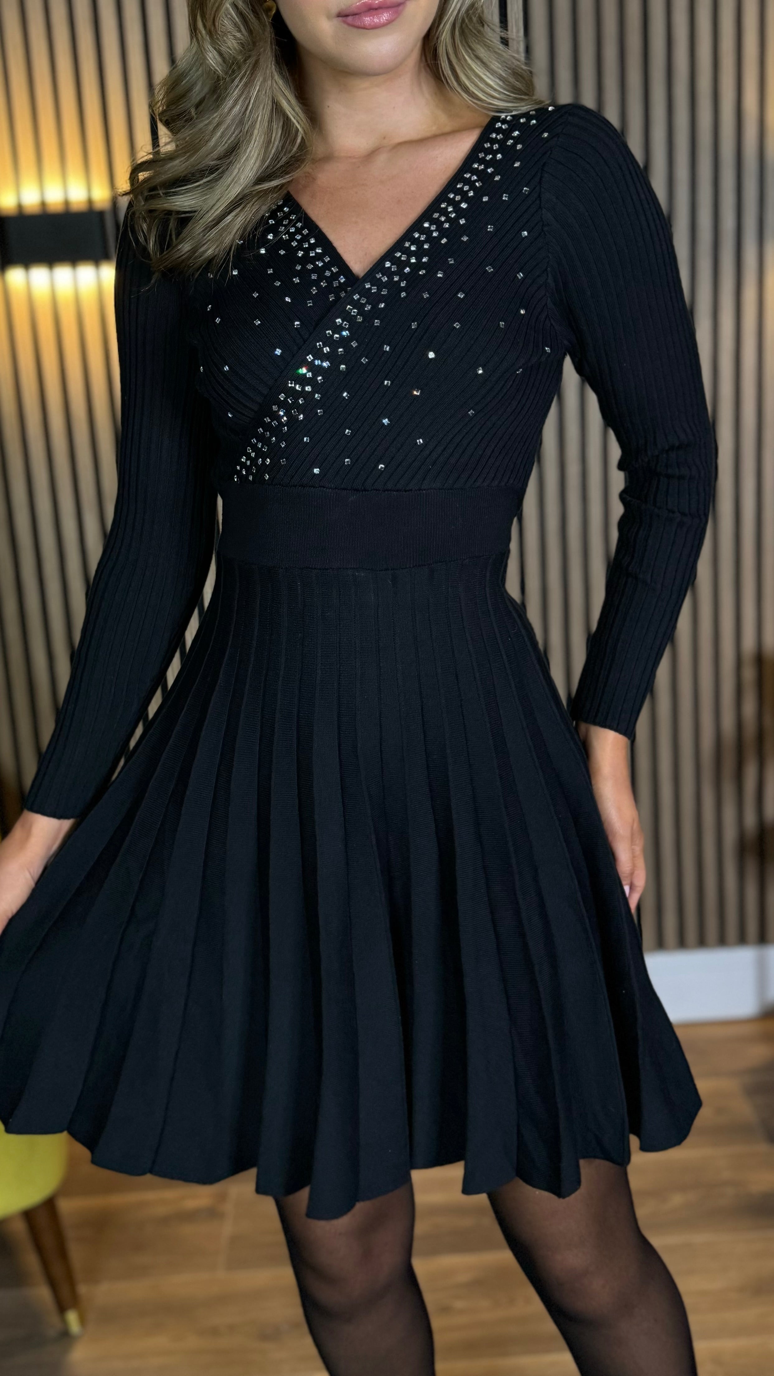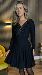 Emily Black Embellished Detail Knit Pleated Mini Dress