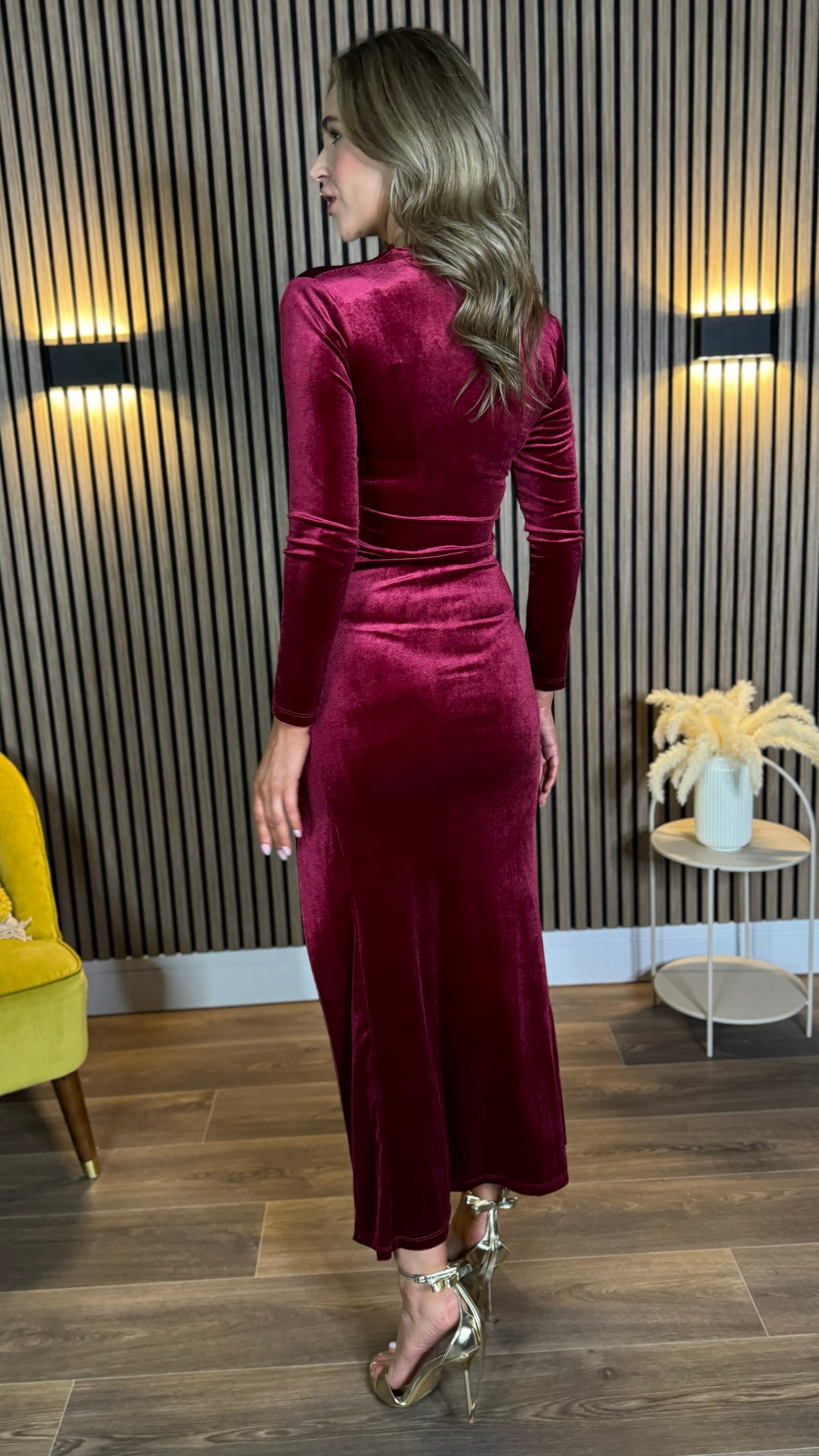 Sibyl Burgundy High Neck Velvet Ruched Tie Detail Midi Dress